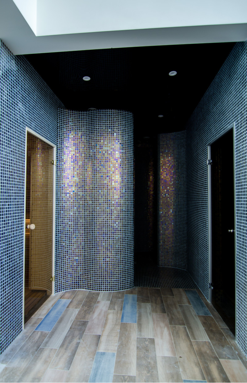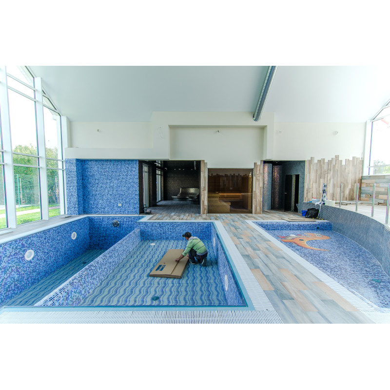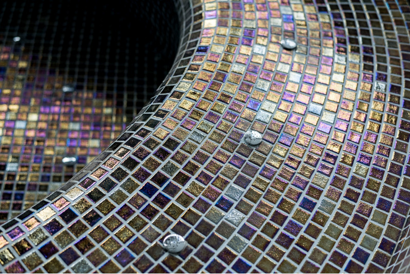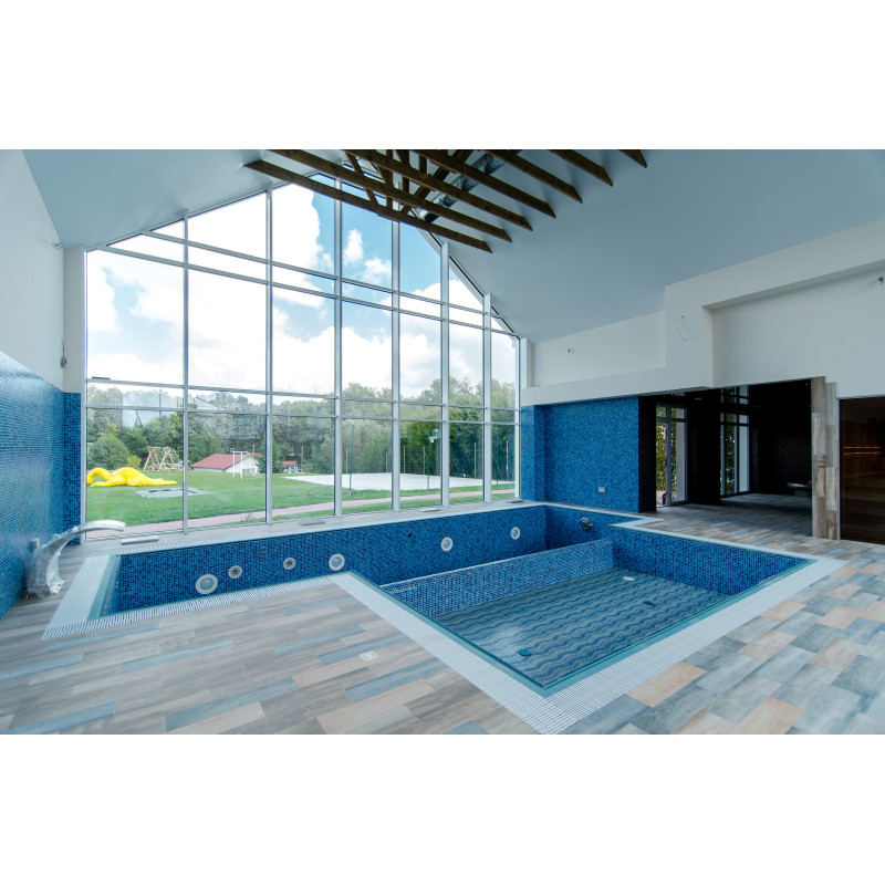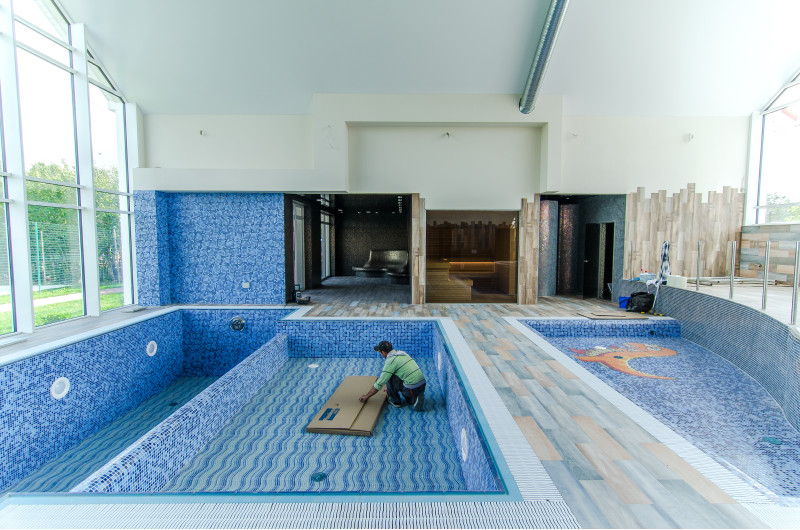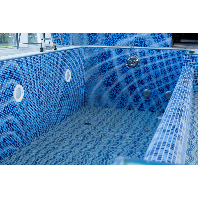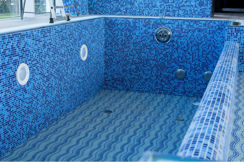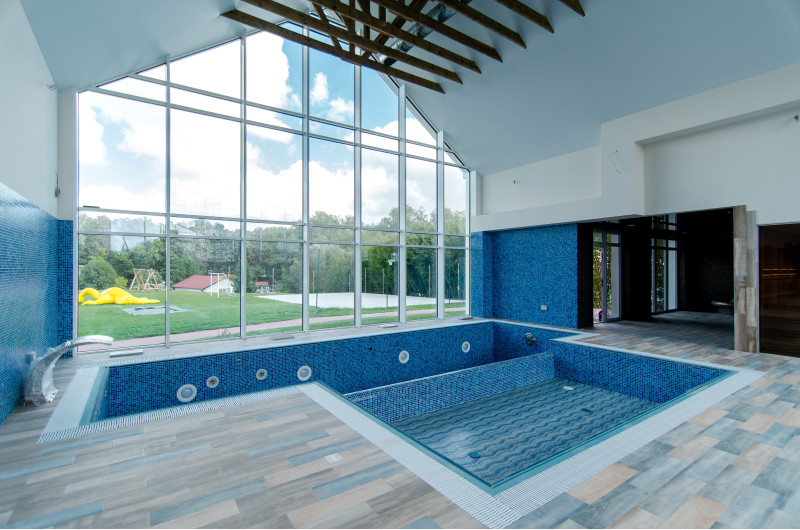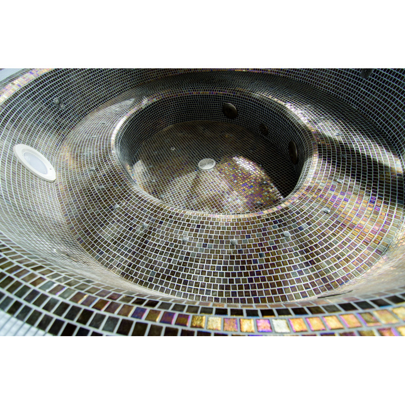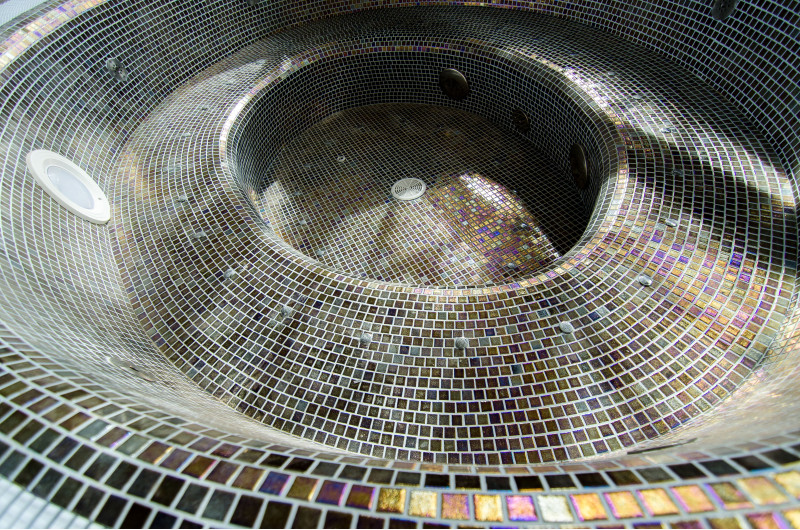 Basen z hydromasażem - 8 miejsc. Wyposażony w beton. Wnętrze pokryte jest mozaiką. Oprawa podwodna LED, dysze masujące, urządzenia filtrujące, urządzenia do automatycznego dozowania chemii.