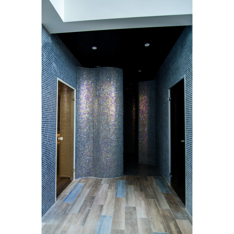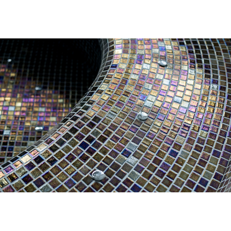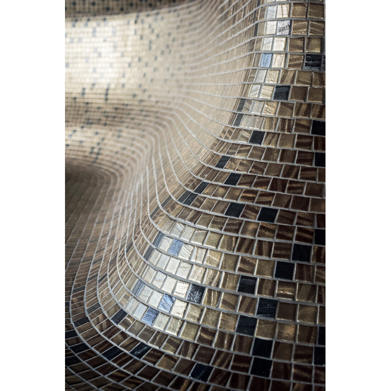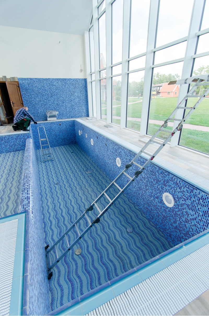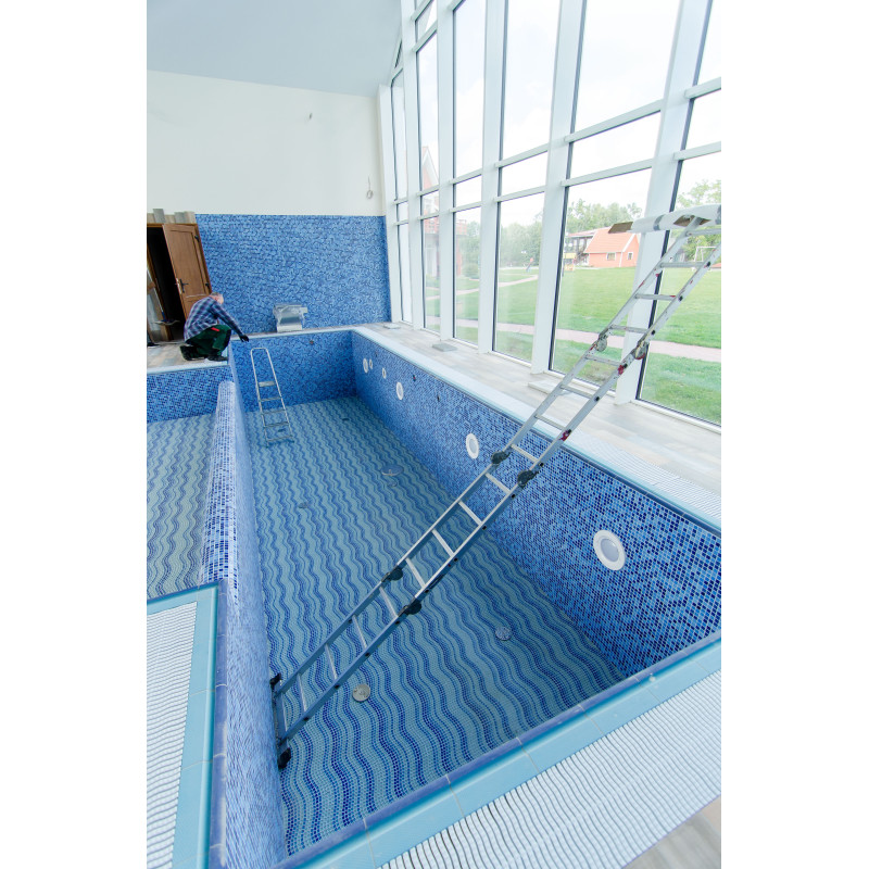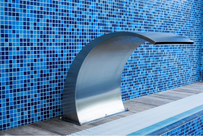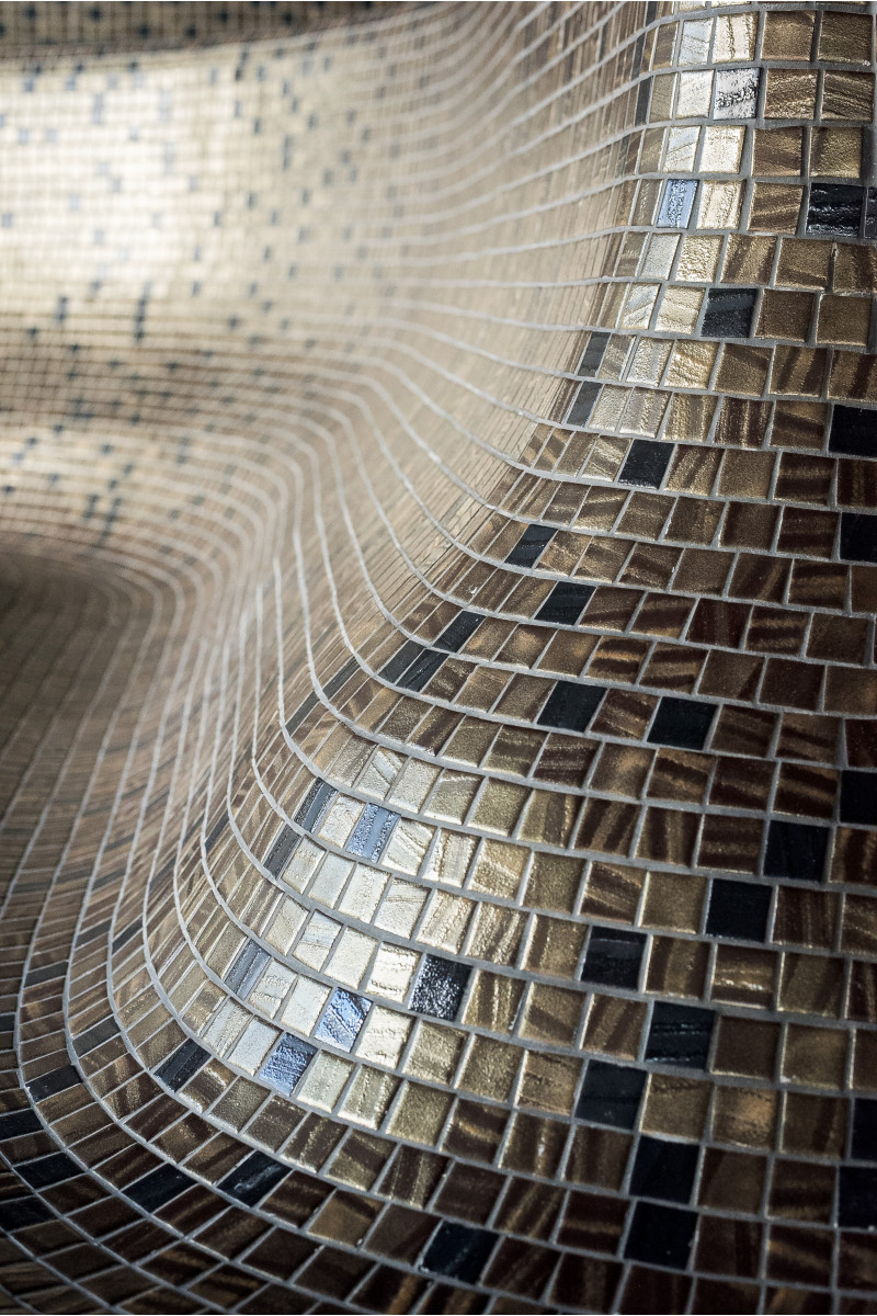 Basen z hydromasażem - 8 miejsc. Wyposażony w beton. Wnętrze pokryte jest mozaiką. Oprawa podwodna LED, dysze masujące, urządzenia filtrujące, urządzenia do automatycznego dozowania chemii.