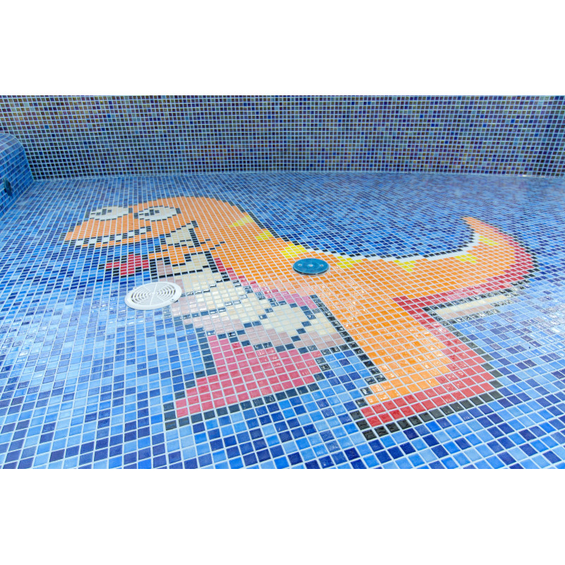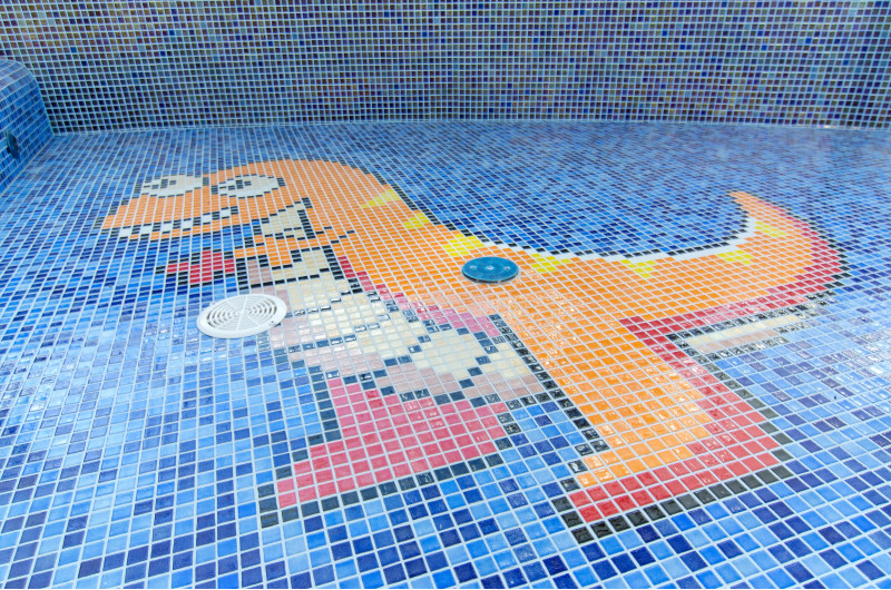Basen o głębokości 15 cm przeznaczony jest dla najmniejszych miłośników wody. Jej spód zdobi kolorowa mozaika.