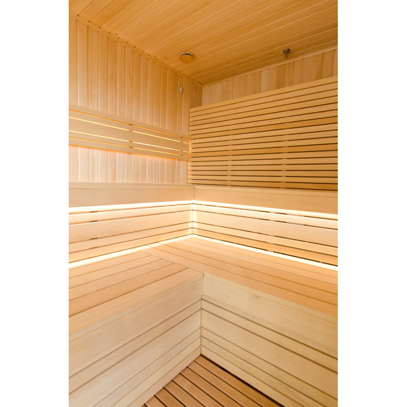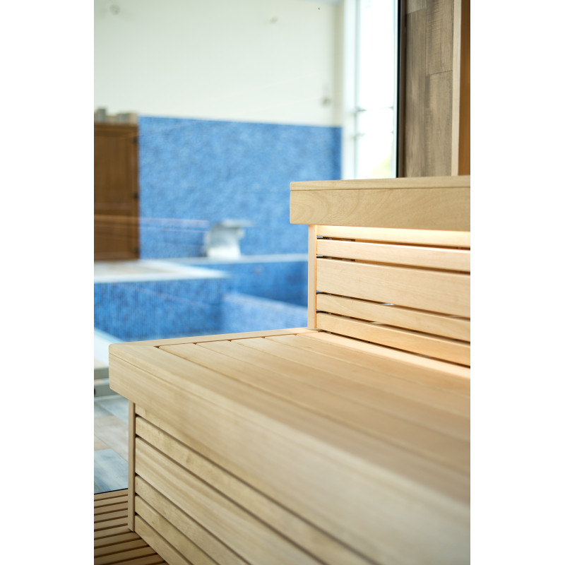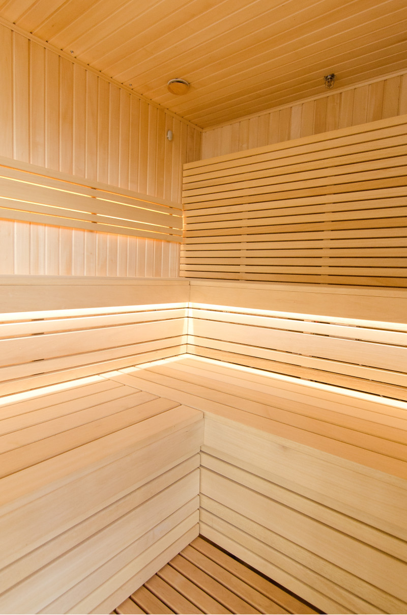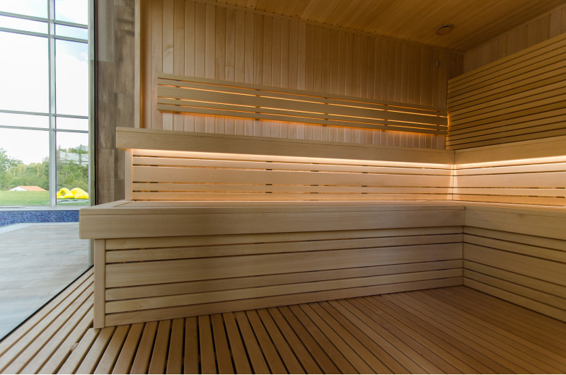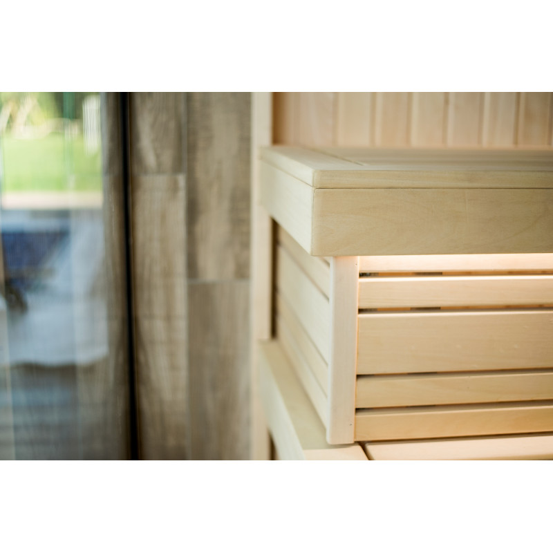 Sauna. Drewniane elementy wnętrza sauny wykonane są z drewna abachi, sufit i ściany z drewna lipcowego. Cechy: