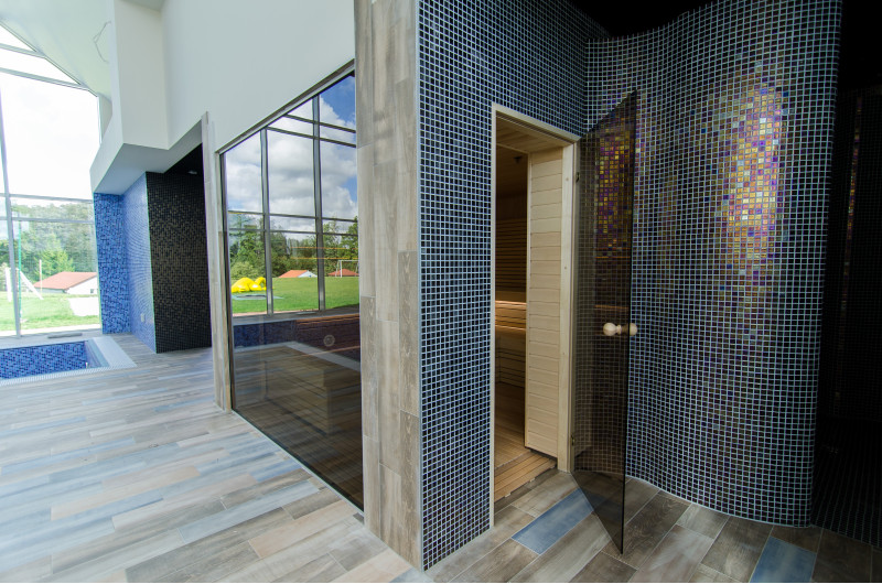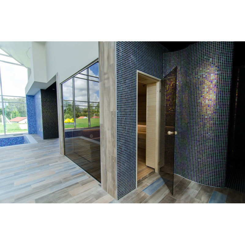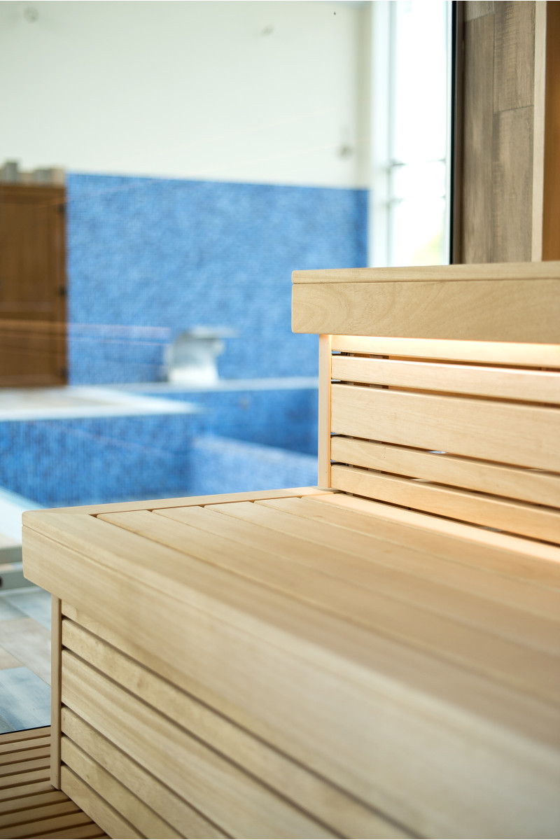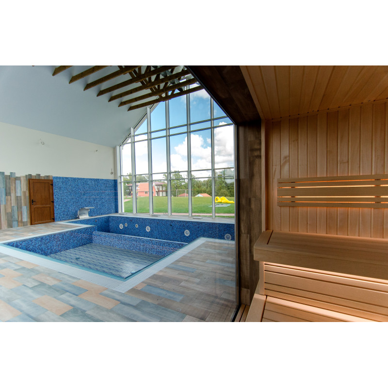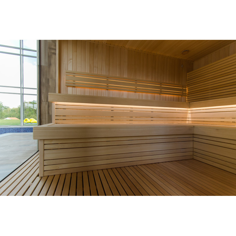 Sauna. Drewniane elementy wnętrza sauny wykonane są z drewna abachi, sufit i ściany z drewna lipcowego. Cechy: