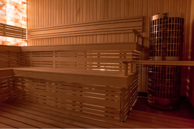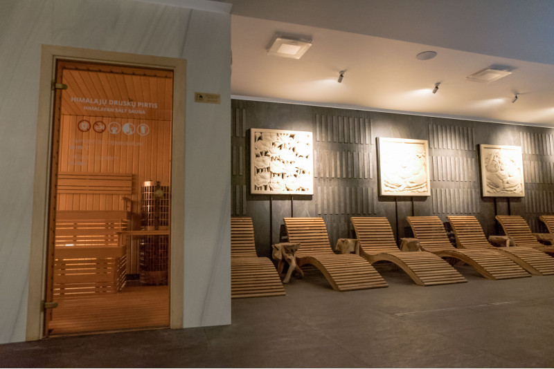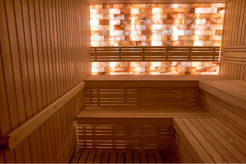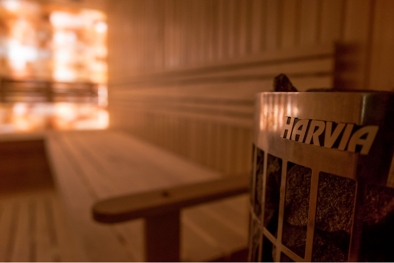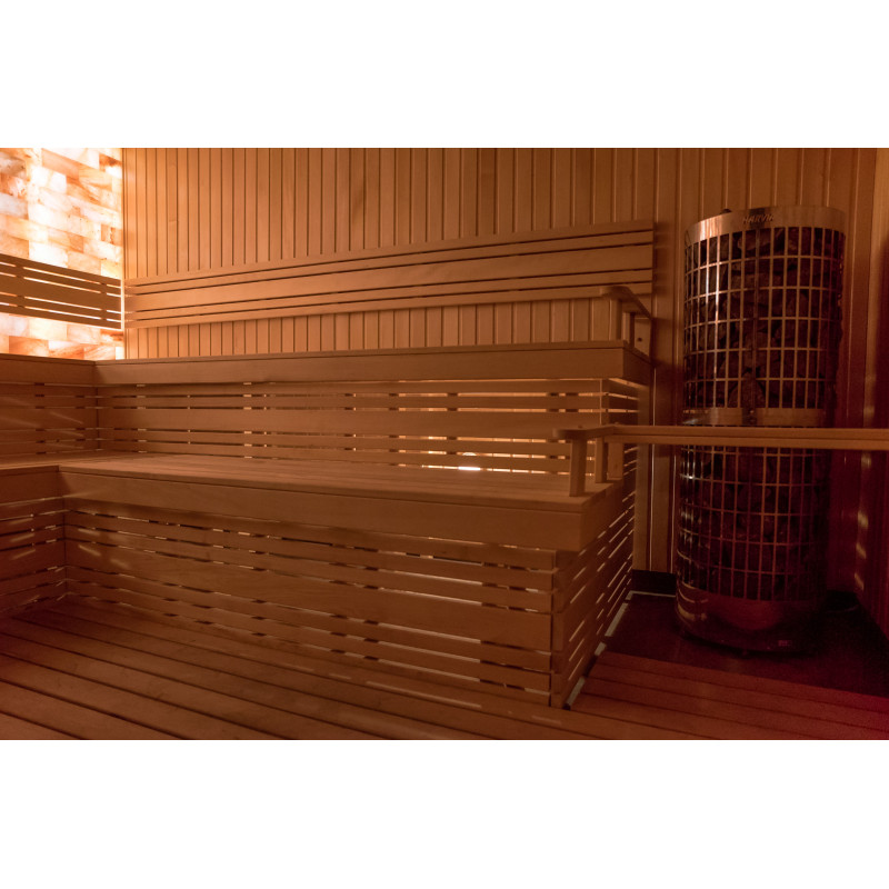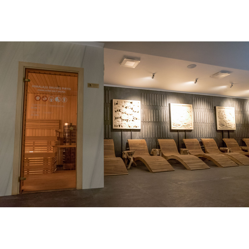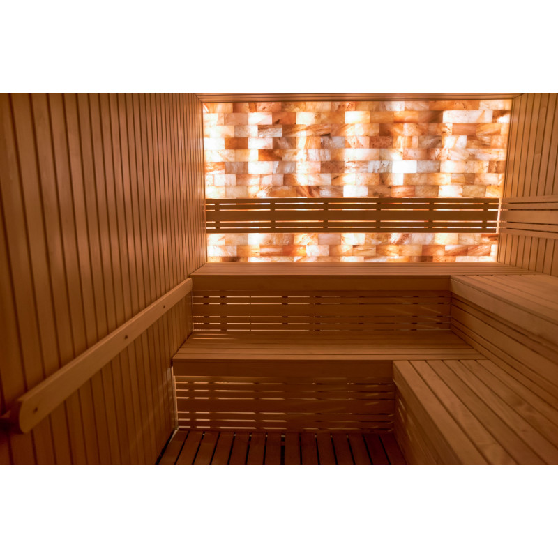 Główną atrakcją sauny jest imponująca i nowocześnie wyglądająca ściana z himalajskiej cegły solnej. Ściana ta nie tylko zachwyca swoim wyglądem, nadaje saunie przytulny klimat, ale wiadomo również, że sól himalajska ma wiele pozytywnych właściwości dla zdrowia człowieka. Sól himalajska ma pozytywny wpływ na osoby z alergiami, astmą oskrzelową, chorobami układu nerwowego, wzmacnia układ odpornościowy, podnosi nastrój i dodaje energii. Sól himalajska neutralizuje promieniowanie elektromagnetyczne, zmniejszając elektryczność statyczną w powietrzu. Ściana z soli himalajskiej jest jeszcze bardziej zaakcentowana i upiększona przez wbudowane oświetlenie LED pod cegłami.