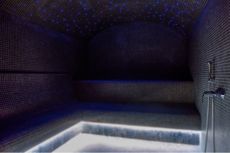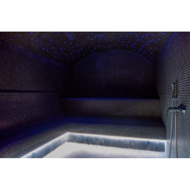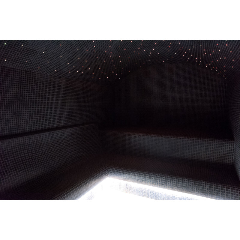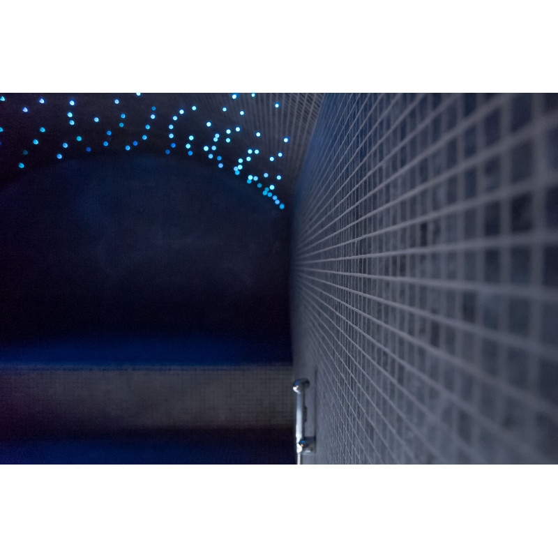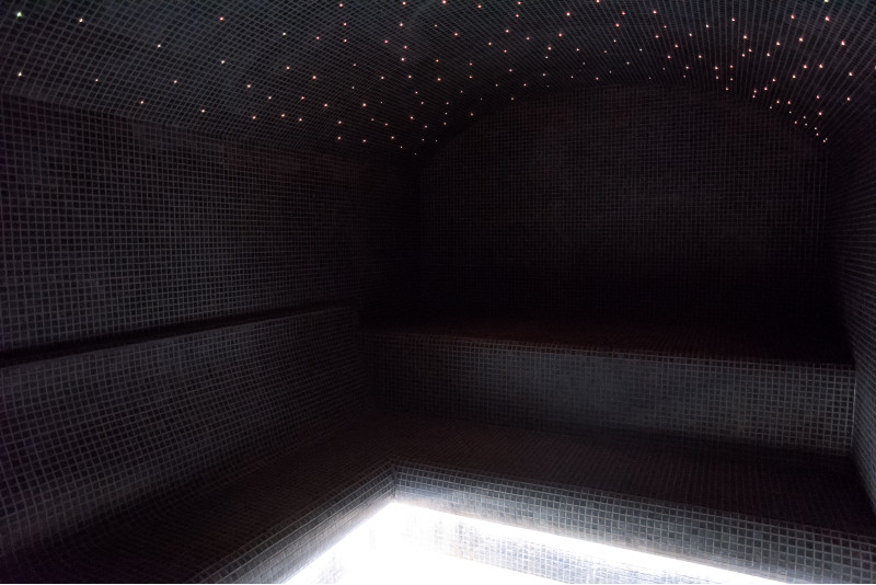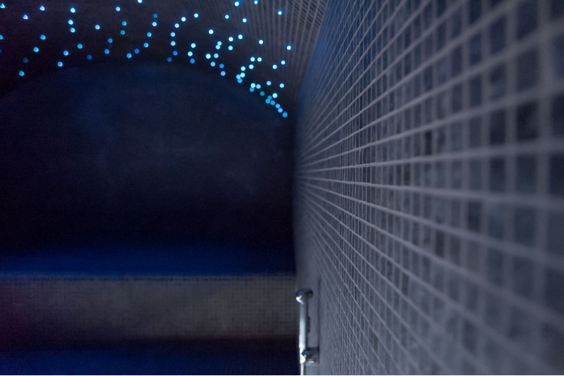 Pod ławkami - oświetlenie LED odporne na wilgoć i temperaturę, doświetlające podłogę. Do oświetlenia łukowego sufitu wybrano światłowodowy system oświetlenia „Gwiaździste niebo”, którego kolory można łatwo i szybko zmieniać za pomocą panelu sterującego.