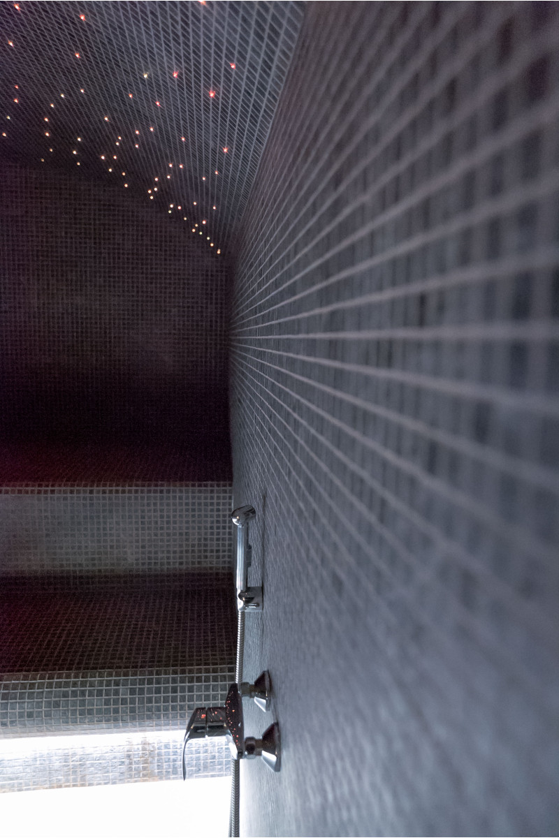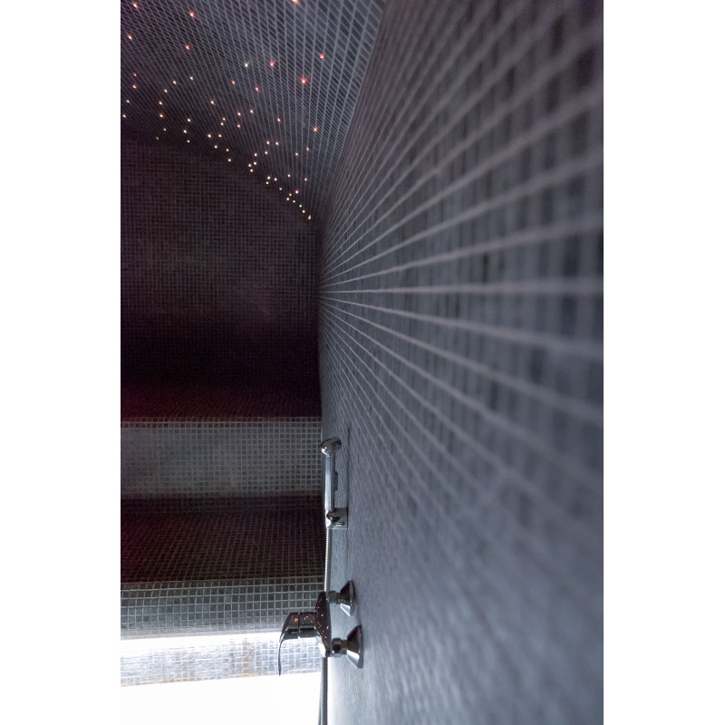 Całe pomieszczenie sauny jest ozdobione małymi mozaikami, a dwa głośniki muzyczne tworzą spokojną i przytulną atmosferę.