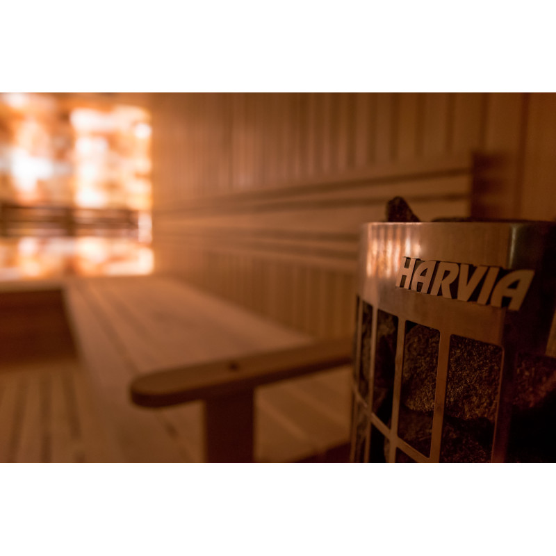 Wyposażenie - Grzejnik Harvia, który mieści szczególnie dużą ilość kamieni, dzięki czemu możesz cieszyć się bogatą i przyjemną parą.