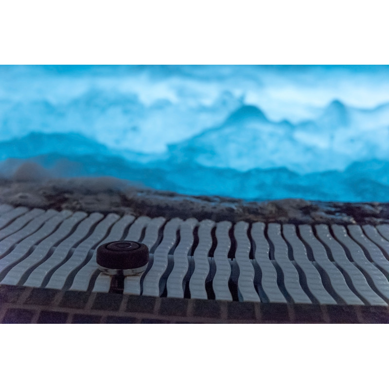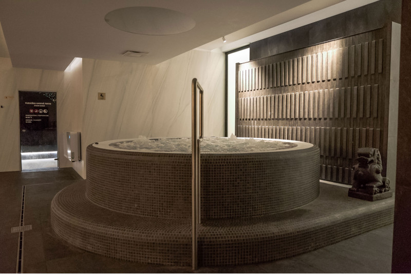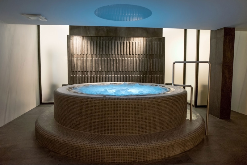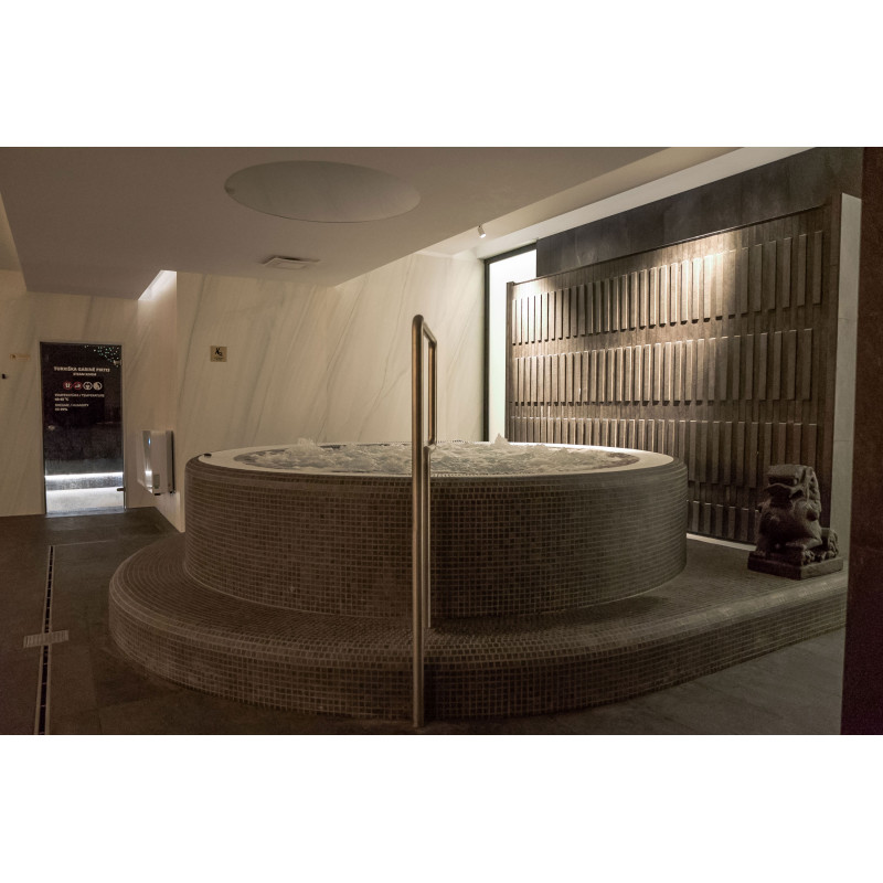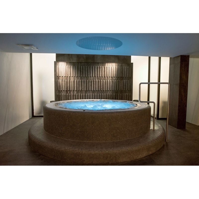 Do dyspozycji przestronny basen z hydromasażem, którego formy wykonane są ze styropianu na indywidualne zamówienie. Basen pokryty jest drobnymi płytkami mozaikowymi, które pasują do neutralnej kolorystyki wnętrza. Wokół basenu znajduje się stopień, a poręcz ze stali nierdzewnej zapewnia łatwy i bezpieczny dostęp do basenu.