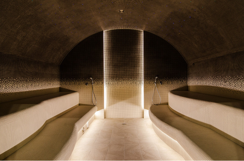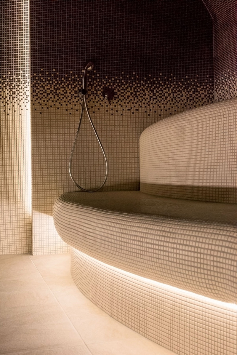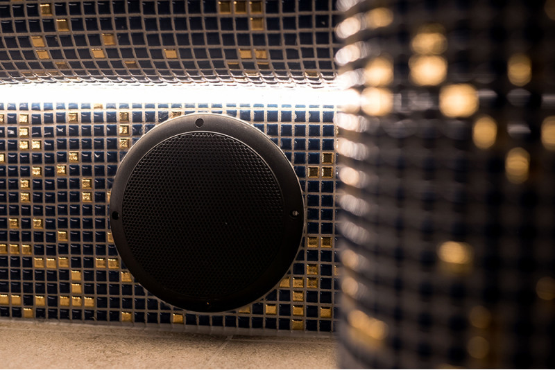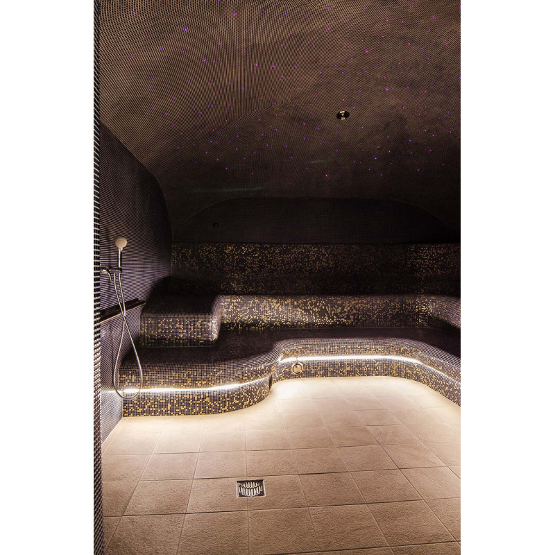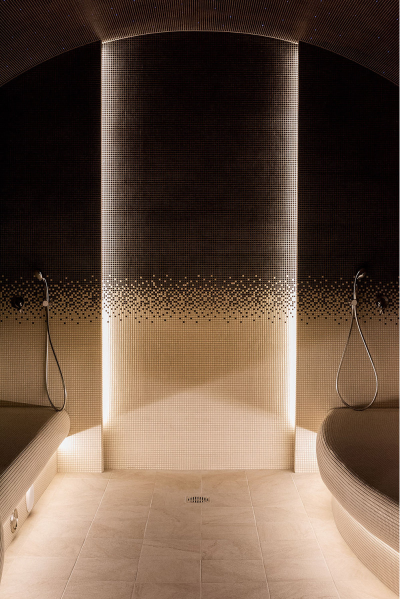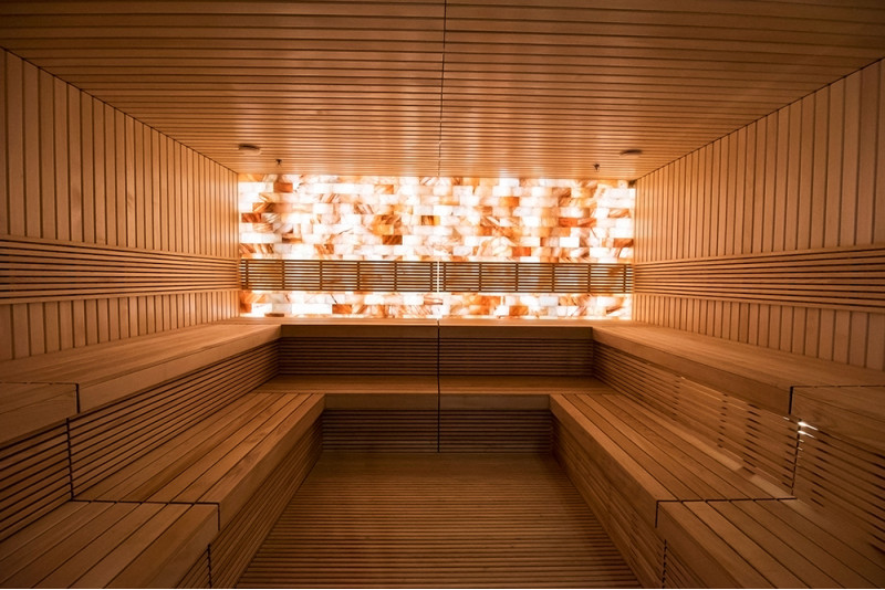 - Pod łóżkami zainstalowano oprawy odporne na wilgoć i temperaturę. Oświetlenie LED jest zainstalowane za ścianą z soli himalajskiej.