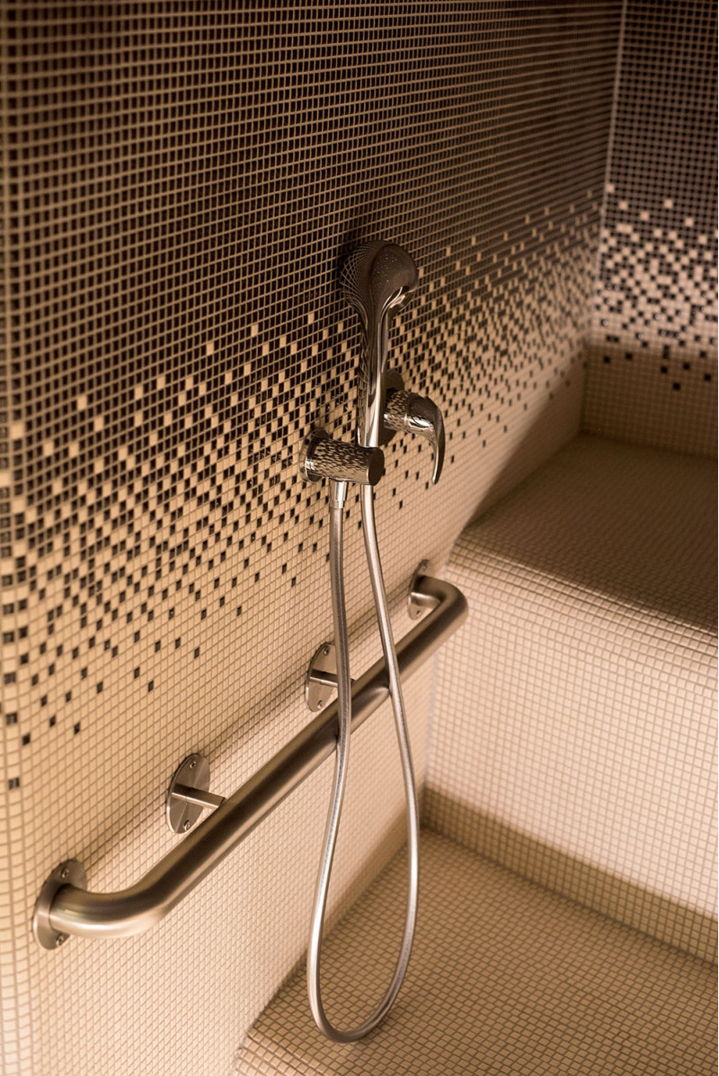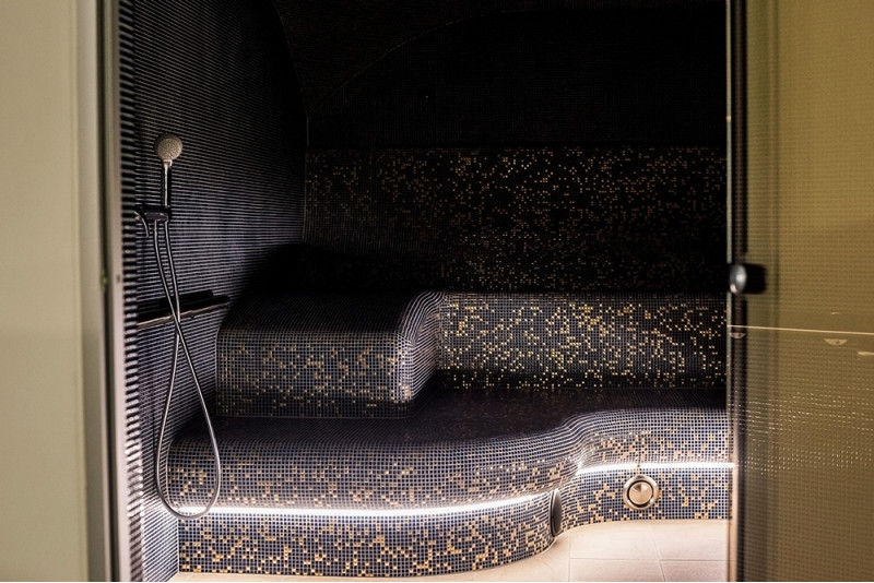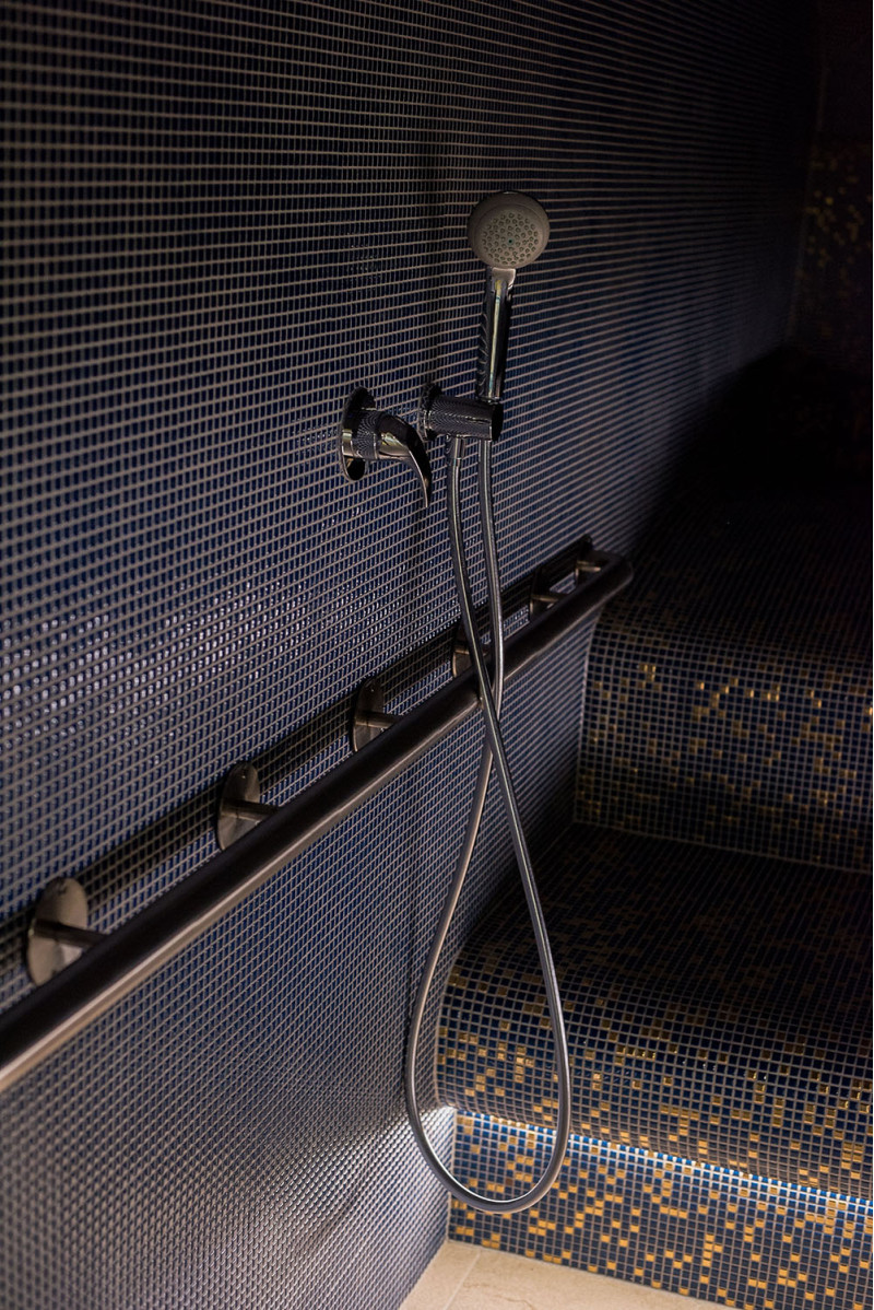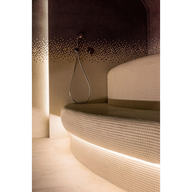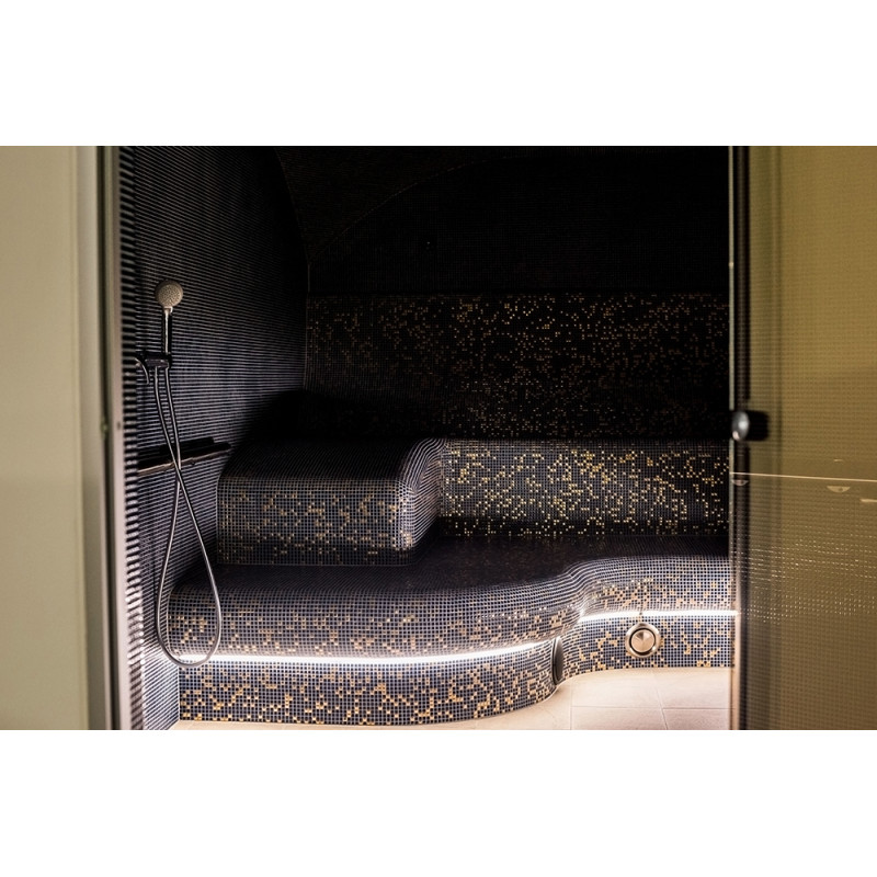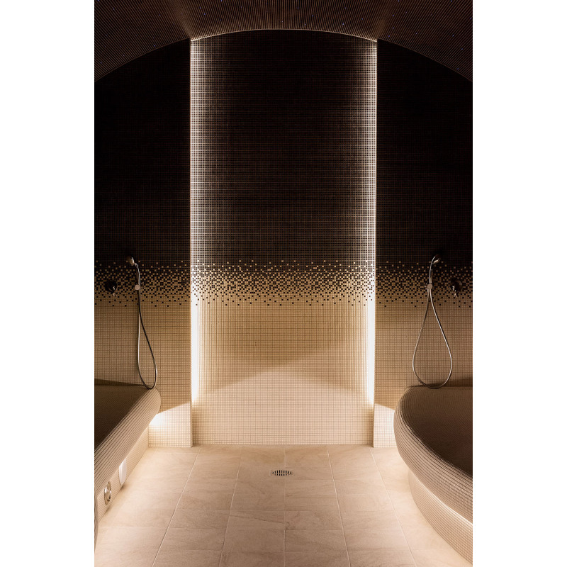 - Pod łóżkami zainstalowano oprawy odporne na wilgoć i temperaturę. Oświetlenie LED jest zainstalowane za ścianą z soli himalajskiej.
