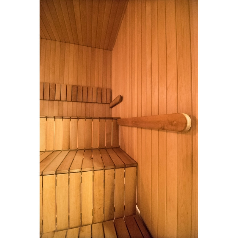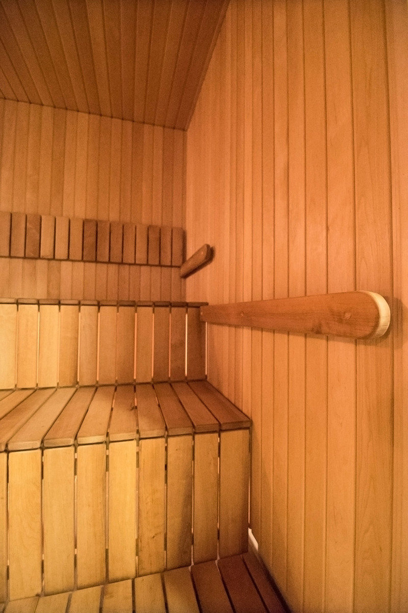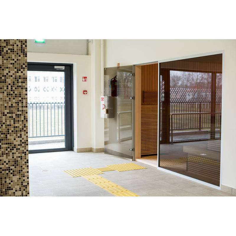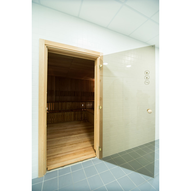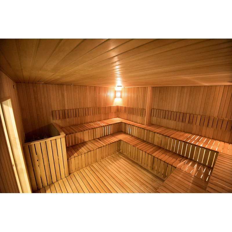Bocznica sauny oraz drewniane detale wnętrza wykonane są z drewna lipowego typu A. Utworzono ogrodzenie dla pieca. Drewno jest impregnowane i lakierowane, olejowane - specjalnie przygotowane do pracy w wysokich temperaturach i wilgotności.