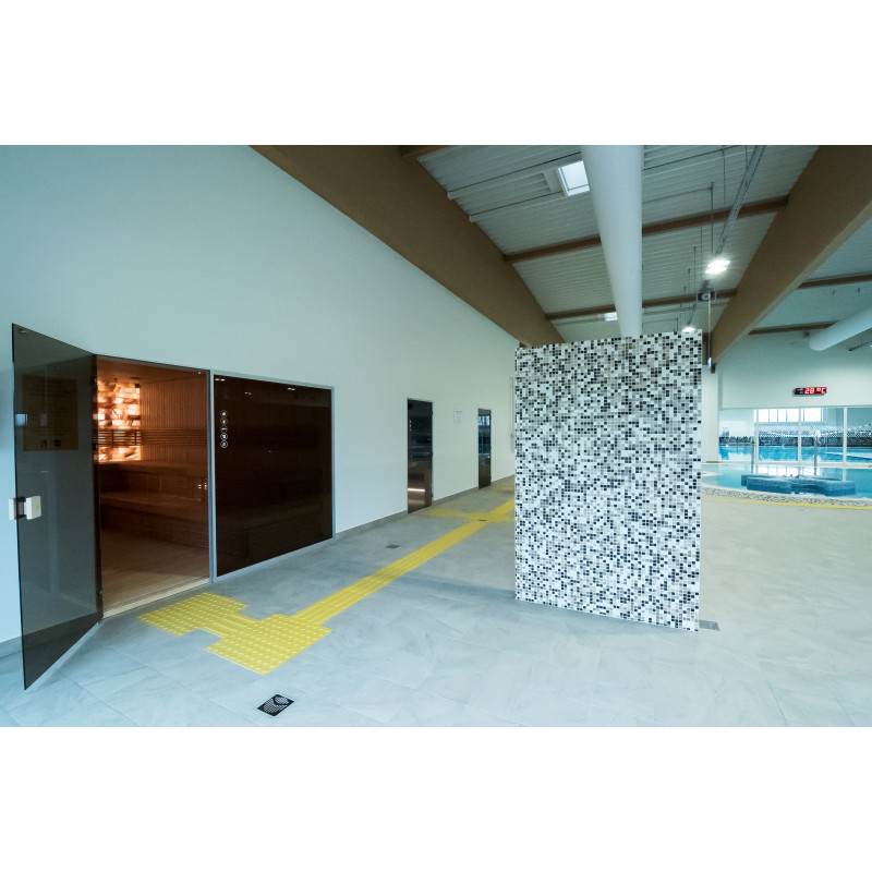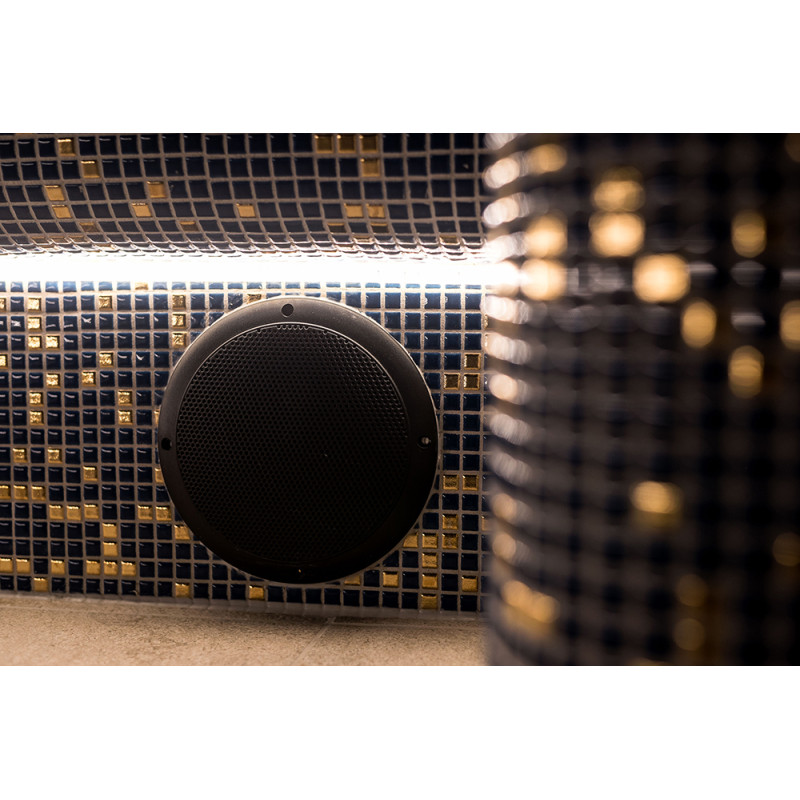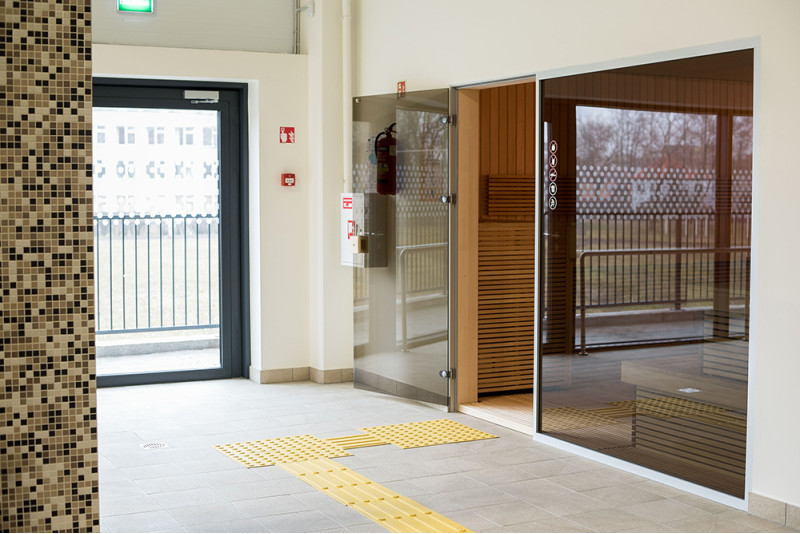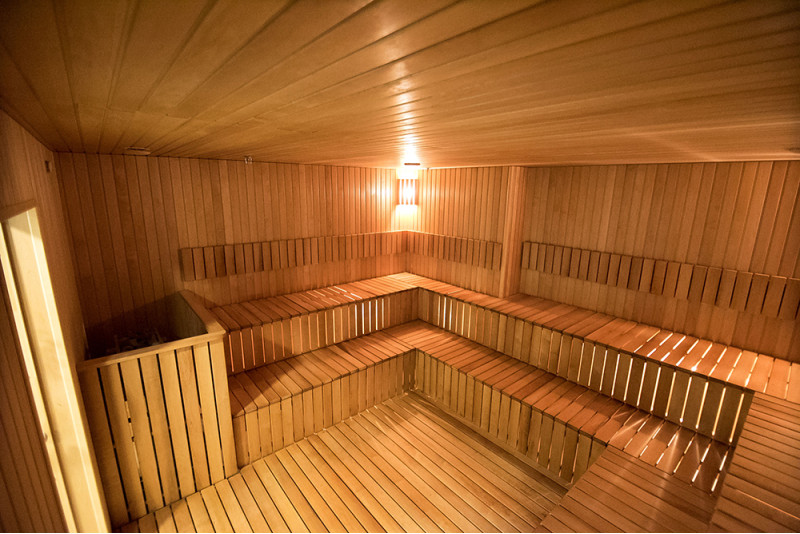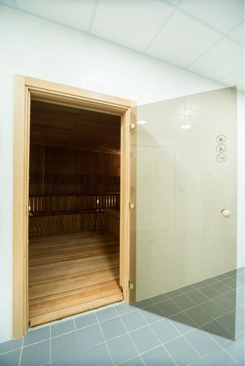 Bocznica sauny oraz drewniane detale wnętrza wykonane są z drewna lipowego typu A. Utworzono ogrodzenie dla pieca. Drewno jest impregnowane i lakierowane, olejowane - specjalnie przygotowane do pracy w wysokich temperaturach i wilgotności.