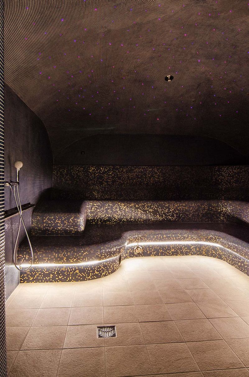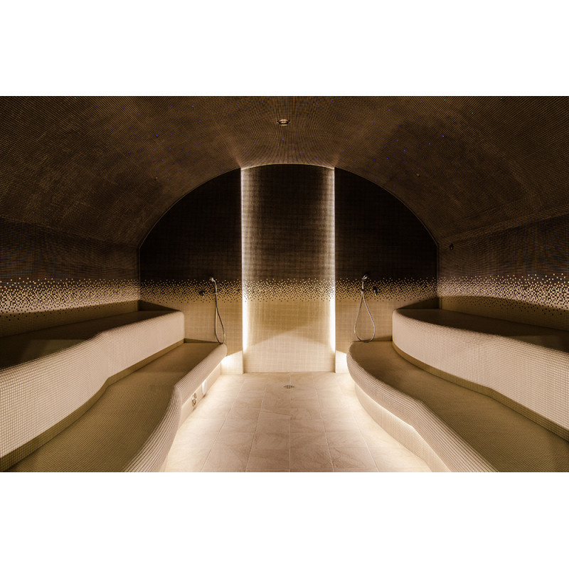 Powierzchnie wewnętrzne formowane są ze styropianu metodą ciągłego cięcia styropianu EPS. Łuk sufitowy. Ławki - leżaki według indywidualnego projektu. Wazony parowe, z grillem. Wewnętrzne powierzchnie sauny są wzmocnione mieszanką wzmacniającą z siatką, powierzchnia jest wyrównana i wodoszczelna.