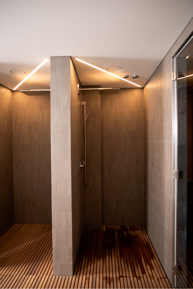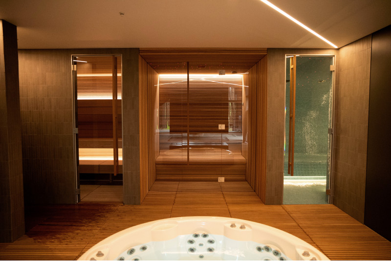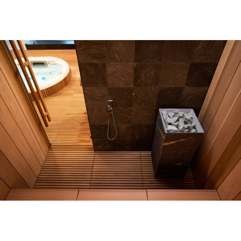 W całej strefie SPA podłogi wykonane są z naturalnych kratek z drewna iroko , które łączą w sobie trwałość i wyrafinowaną estetykę.