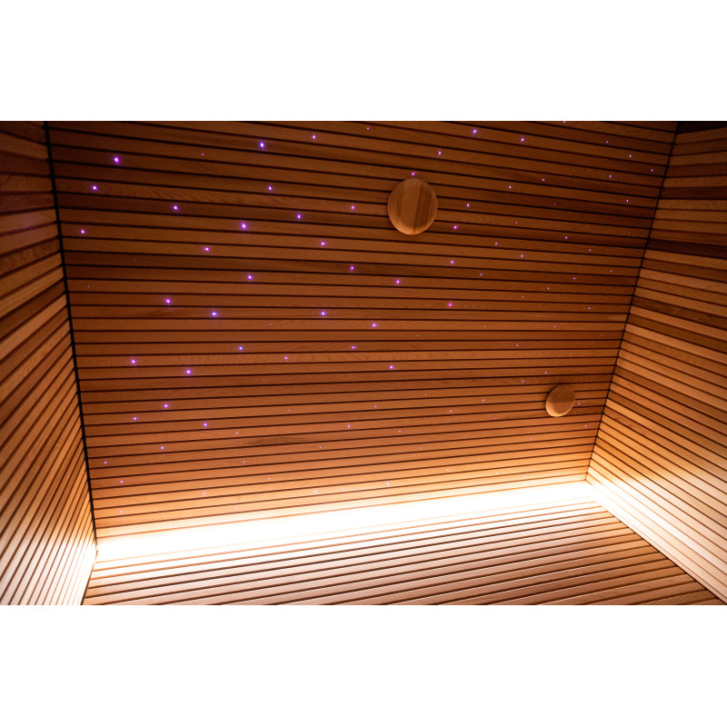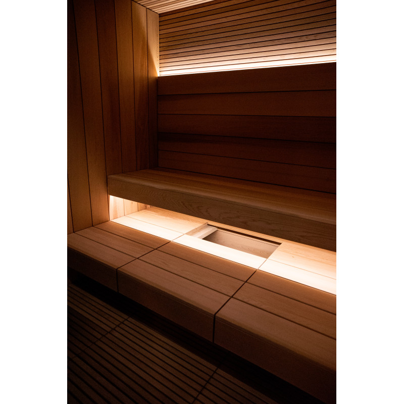 Zamontowano promienniki podczerwieni EOS i promienniki Harvia Carbon pod ławkami;