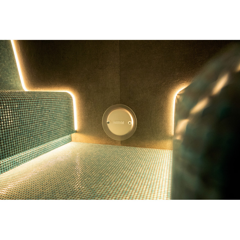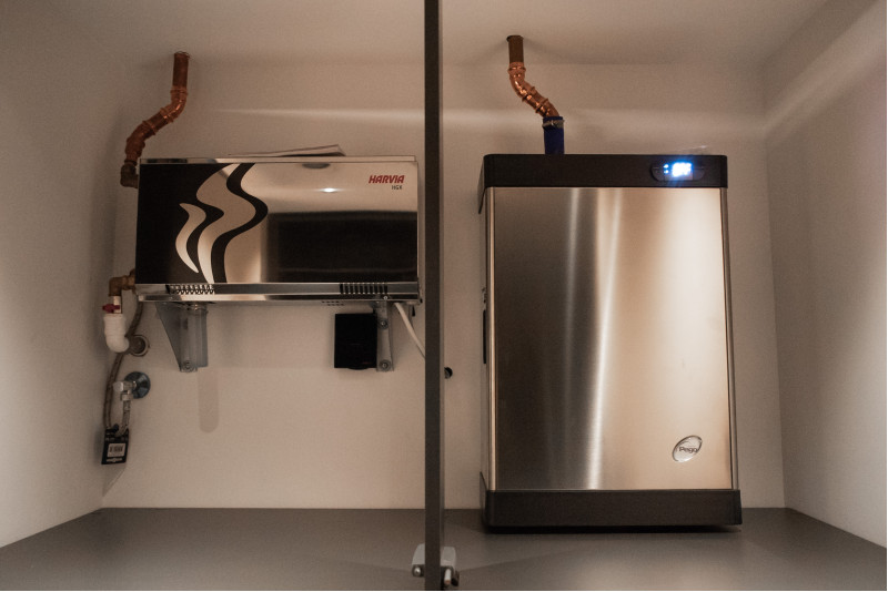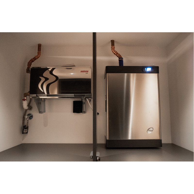 Dysza parowa Harvia ZG-520 i generator pary PEGO ES12N (9 kW), obsługiwane za pomocą panelu sterowania FCU 5000 z czujnikiem temperatury;