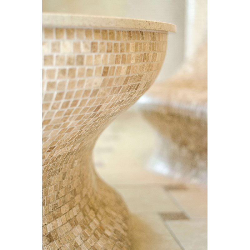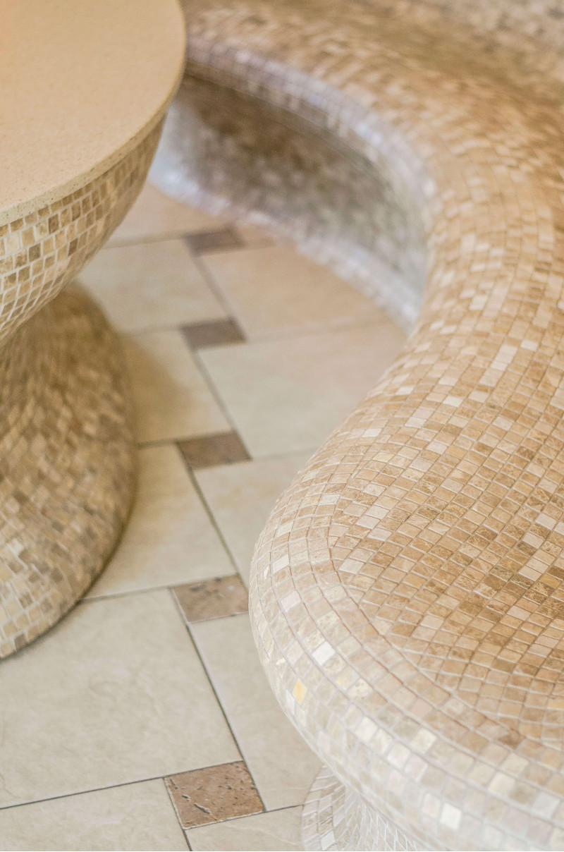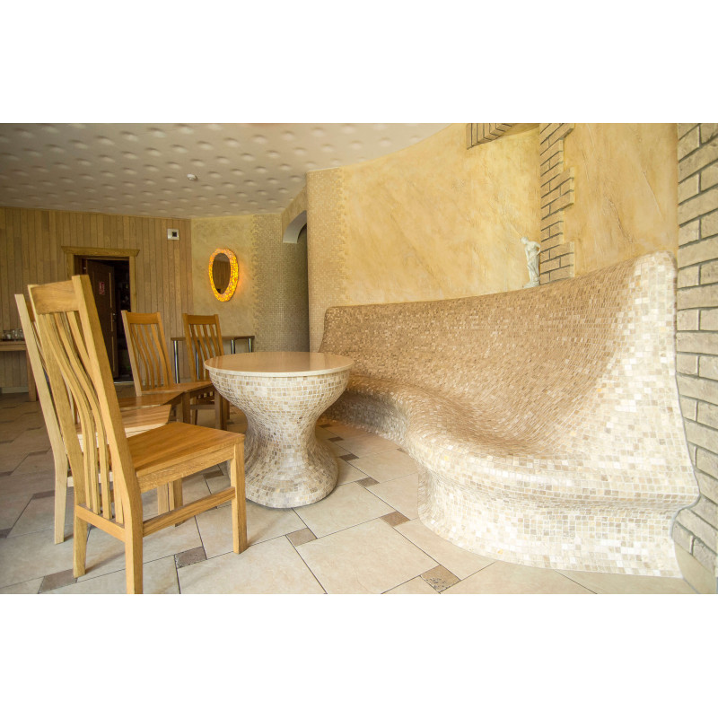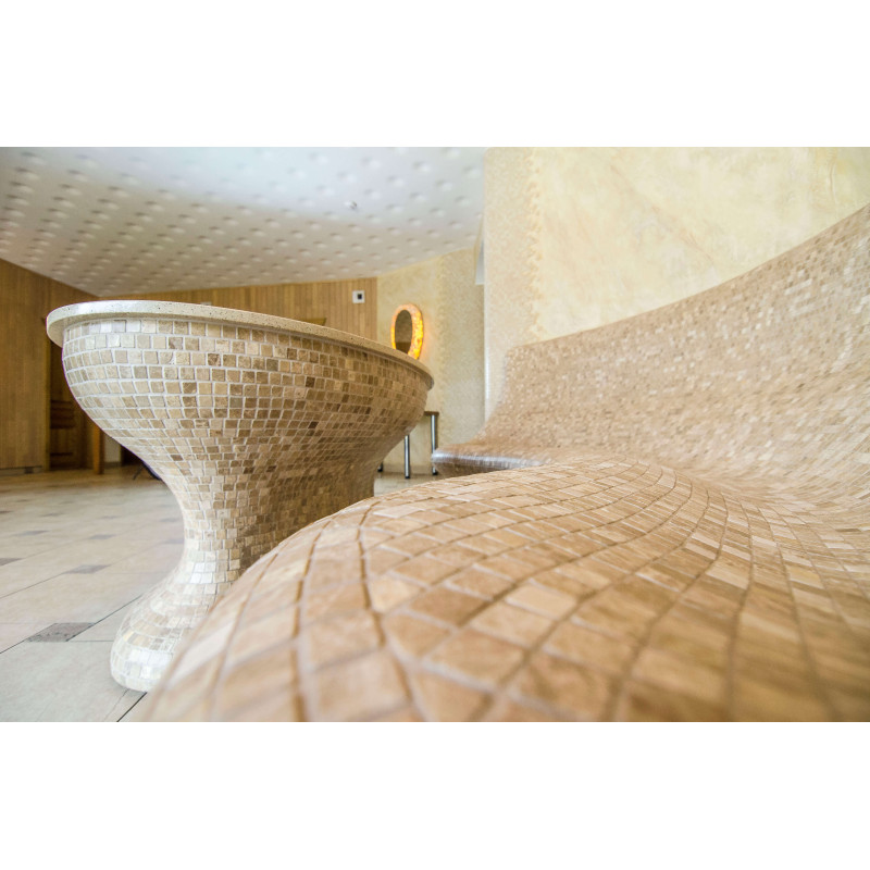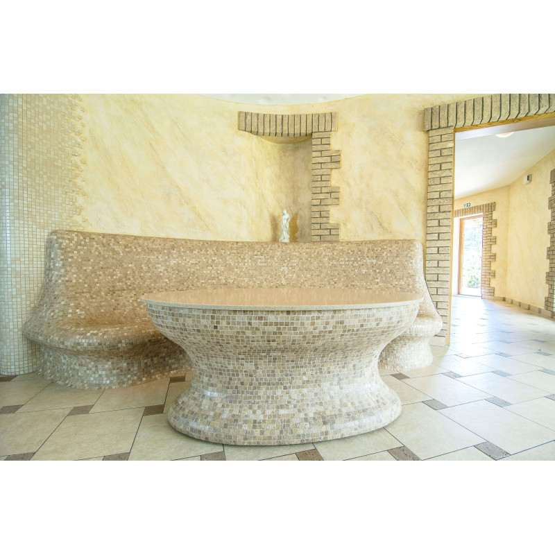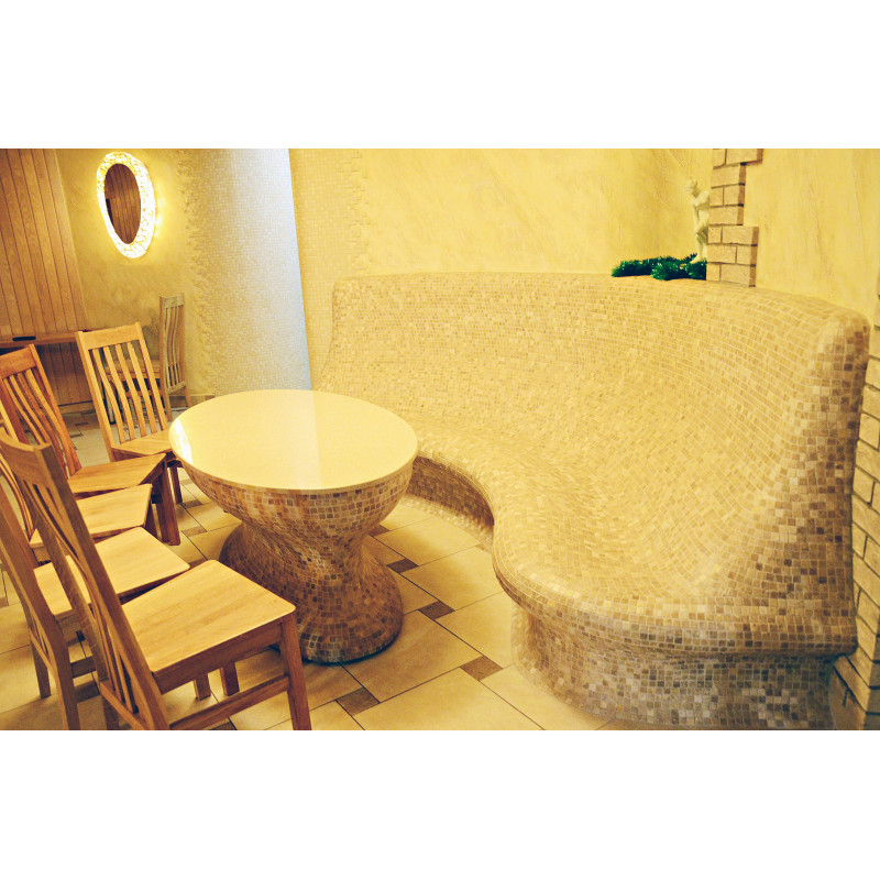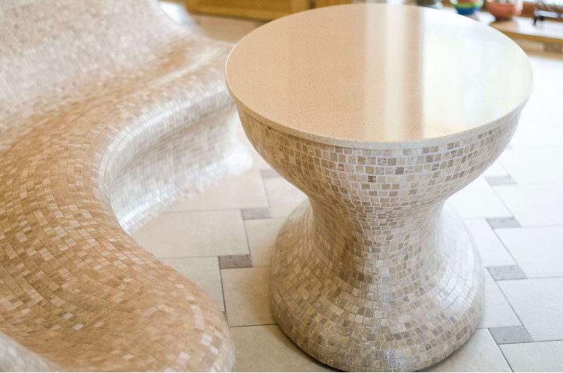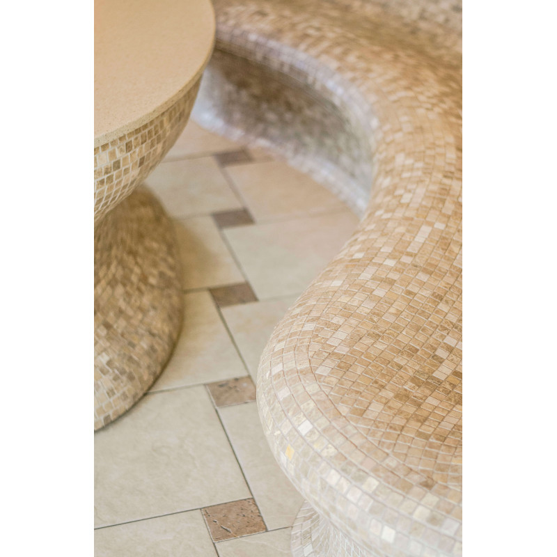 Podgrzewane kształty ławek i stołów wykonywane są indywidualnie ze specjalnego ekstrudowanego polistyrenu. Blat - marmur. Wykończenie - mozaika. Ławka ogrzewana jest z systemu grzewczego.