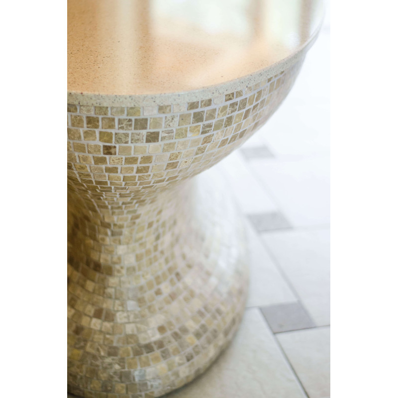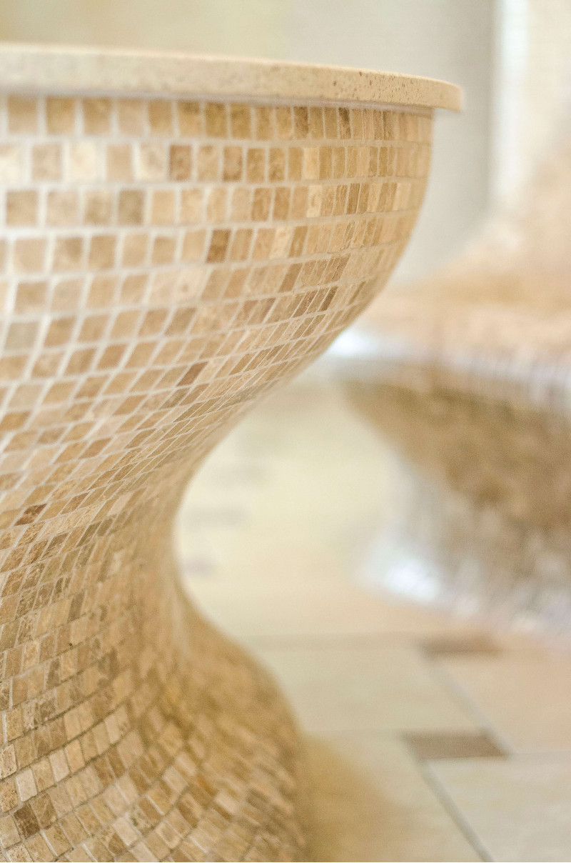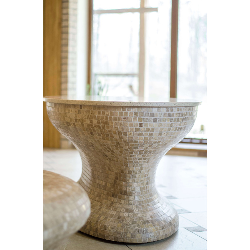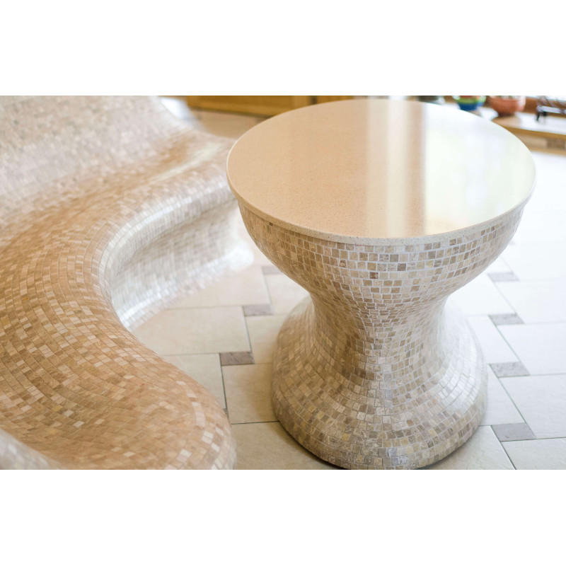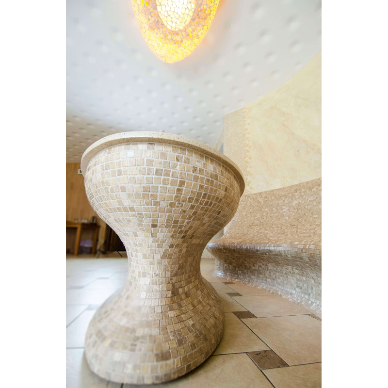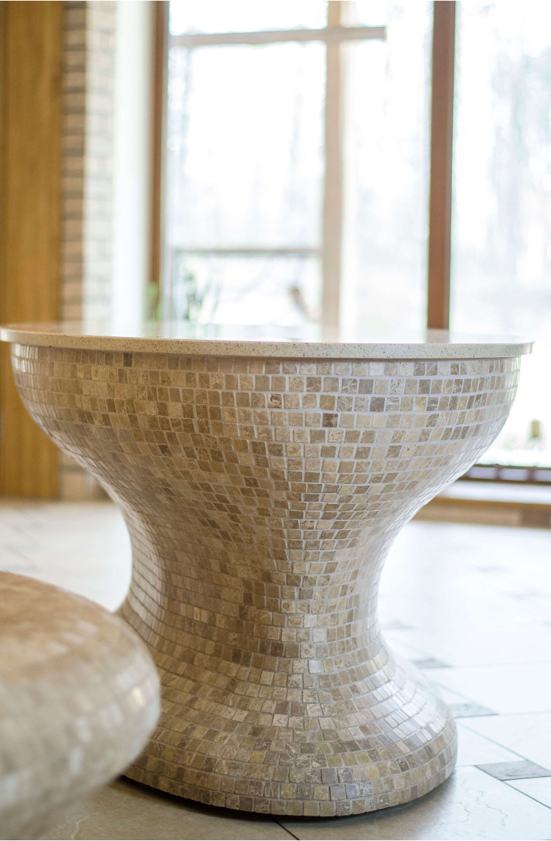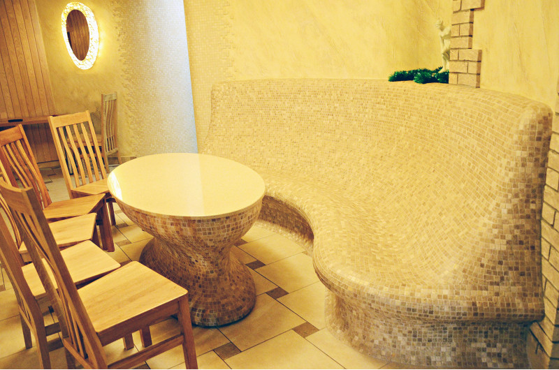 Podgrzewane kształty ławek i stołów wykonywane są indywidualnie ze specjalnego ekstrudowanego polistyrenu. Blat - marmur. Wykończenie - mozaika. Ławka ogrzewana jest z systemu grzewczego.