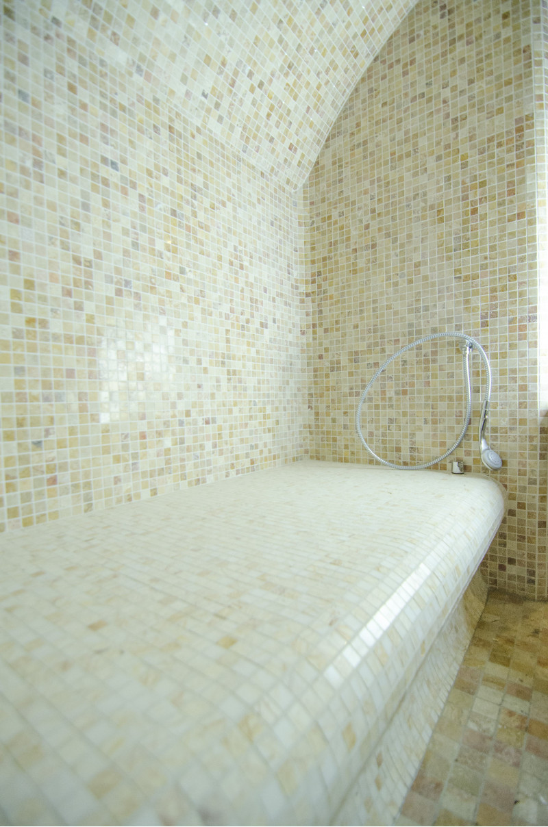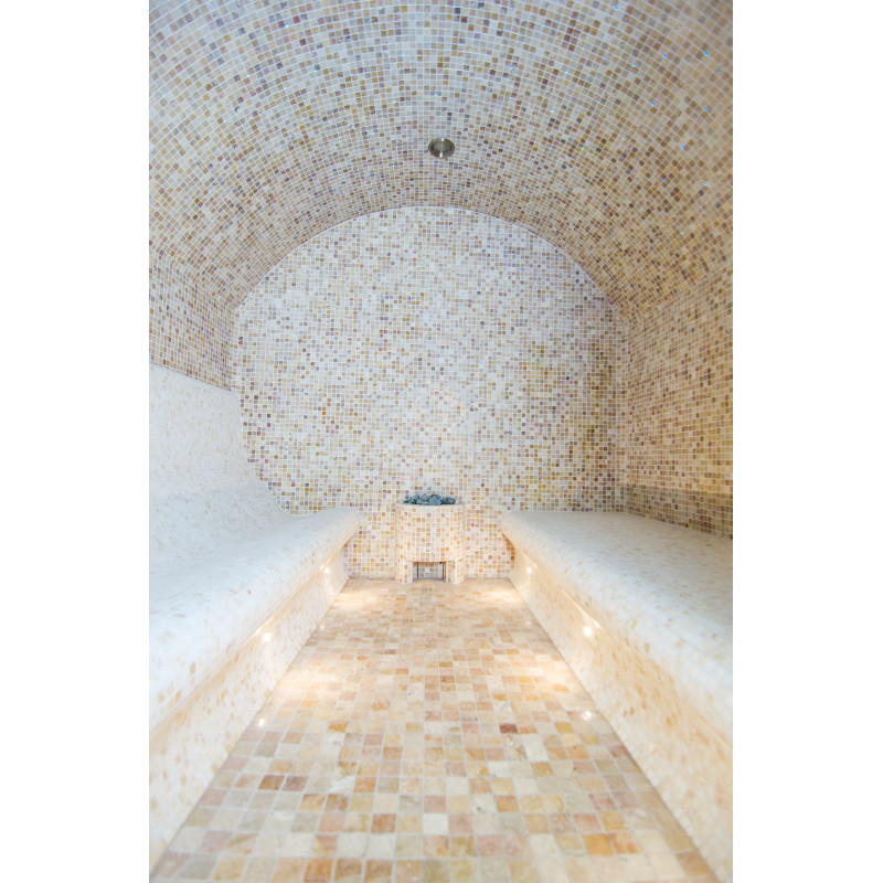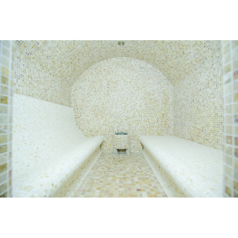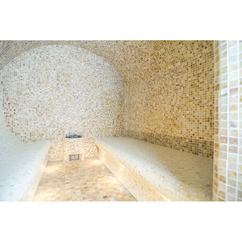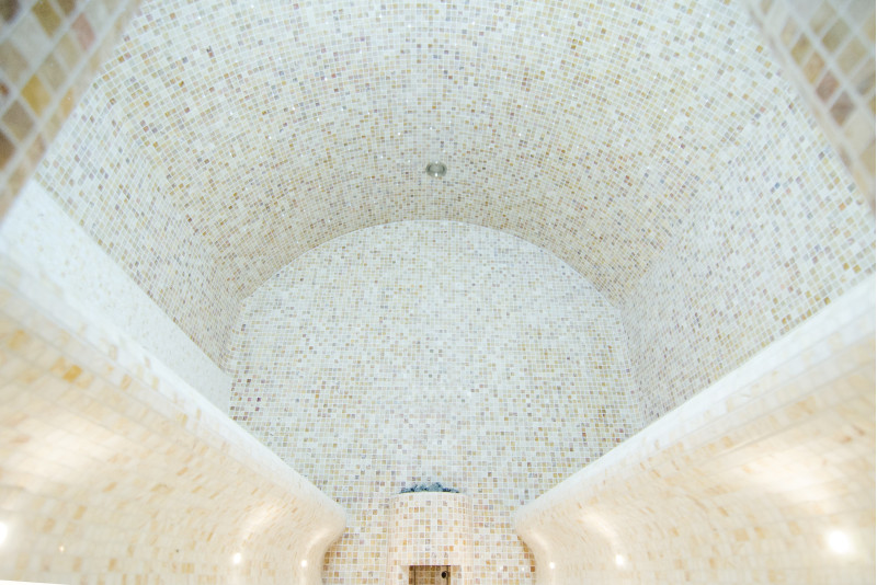 Wykończenie - cała sauna i ławki ozdobione są mozaiką.
