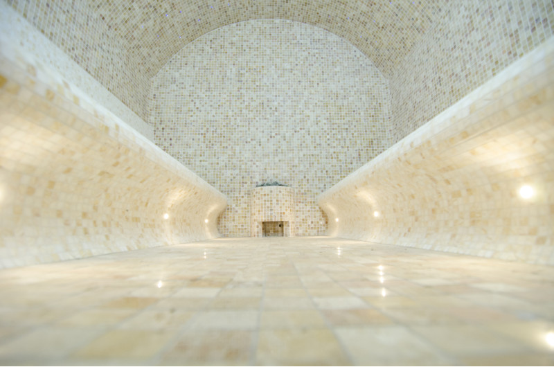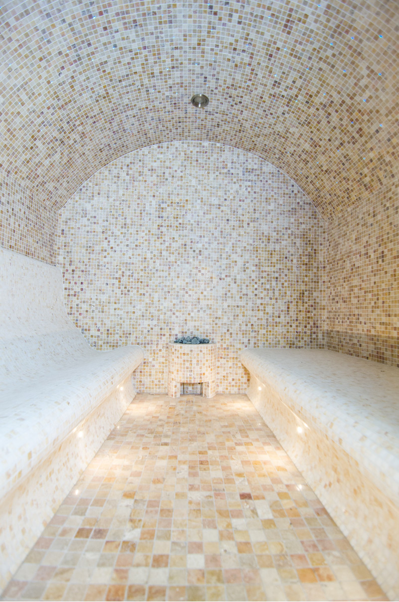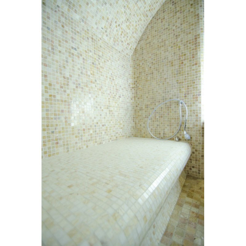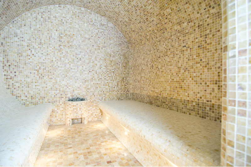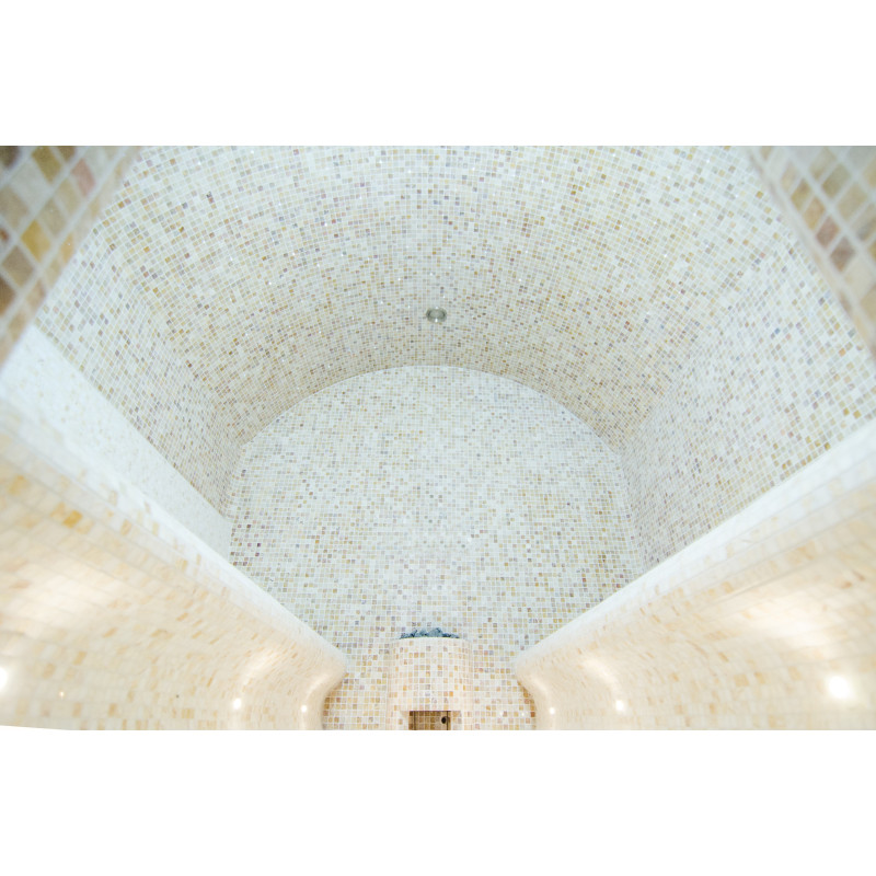 Wykończenie - cała sauna i ławki ozdobione są mozaiką.