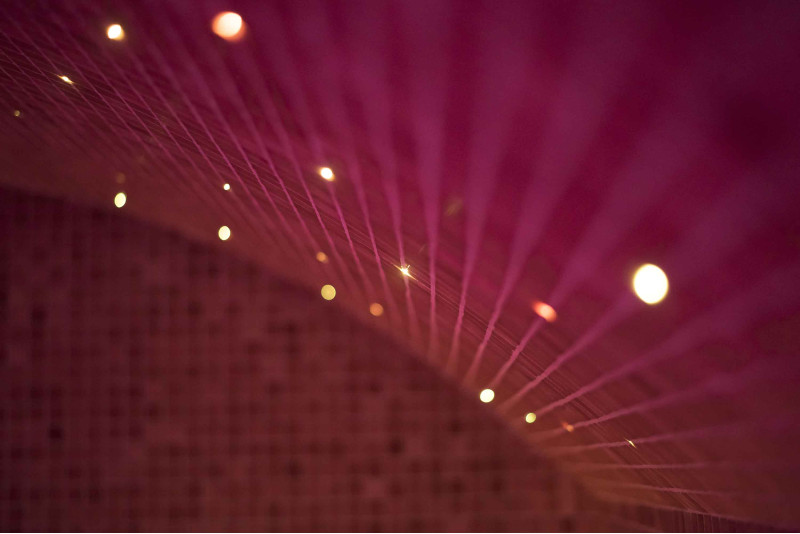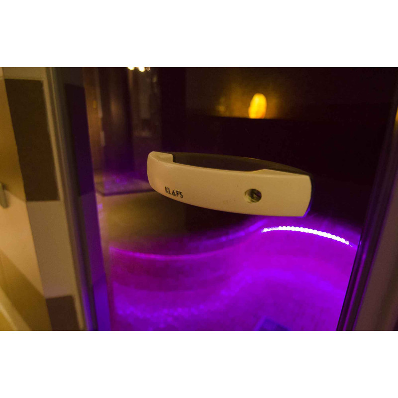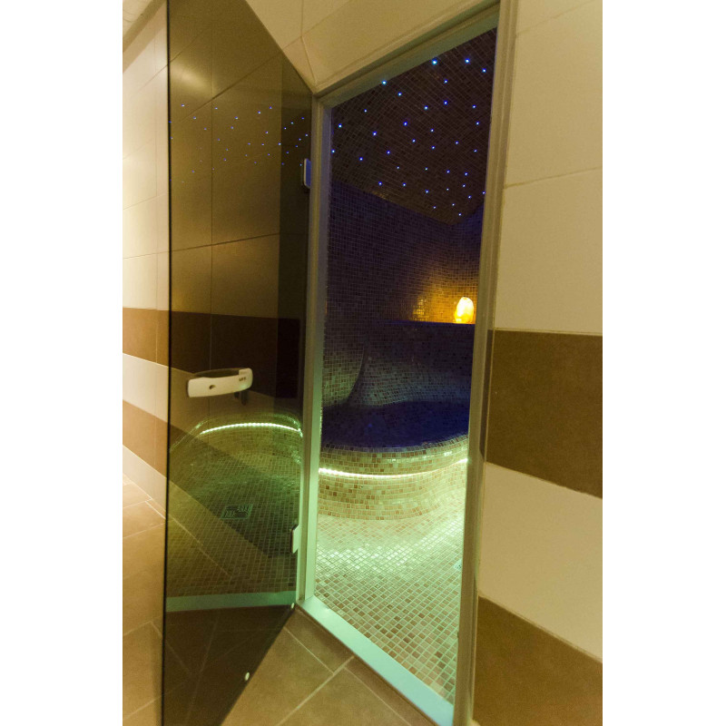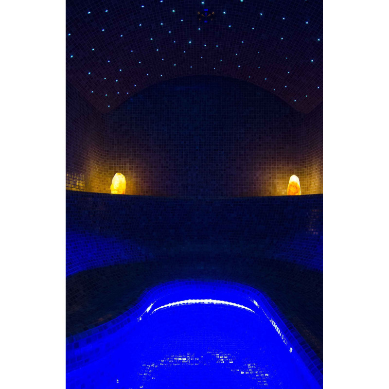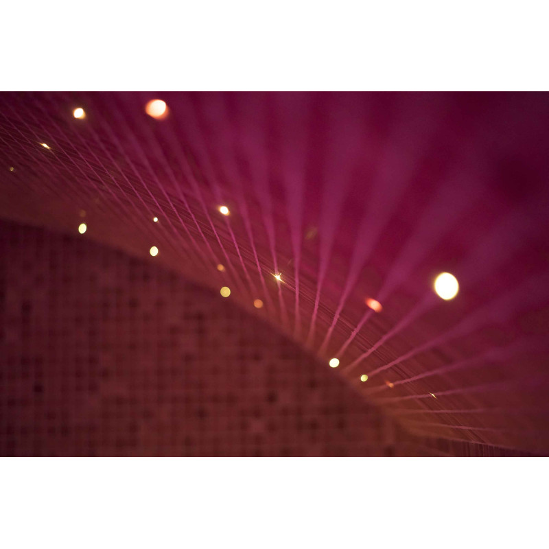 System oświetlenia - sufit jest oświetlony światłowodowym systemem oświetlenia "Gwiaździste Niebo". Oświetlenie światłowodowe to rozwiązanie trwałe, wszechstronne, ekonomiczne i proste. Dzięki niemu można wydobyć najbardziej efektowne opcje oświetlenia. „Gwiaździste niebo” tworzy przytulną atmosferę i doskonale uzupełnia doznania z rozgrzewki w saunie. Pod ławkami znajduje się kolorowe oświetlenie oświetlające podłogę. Kolory można zmieniać.