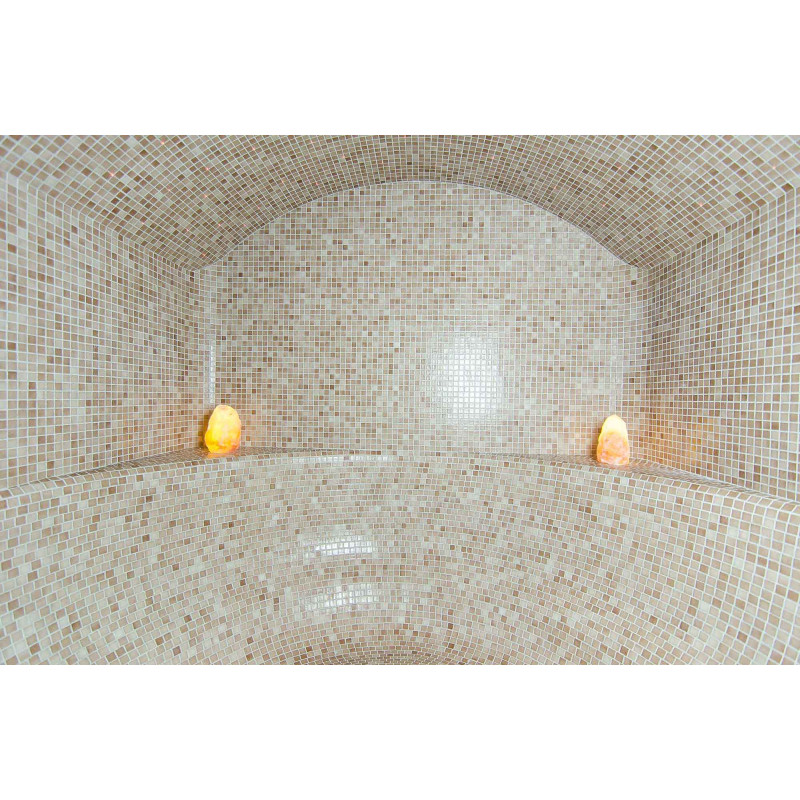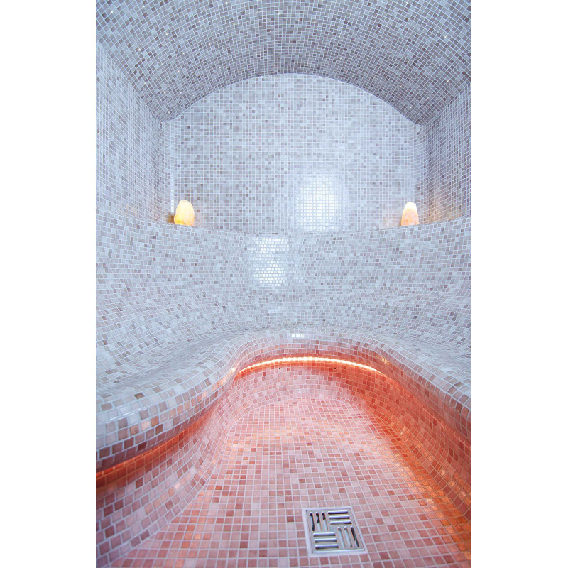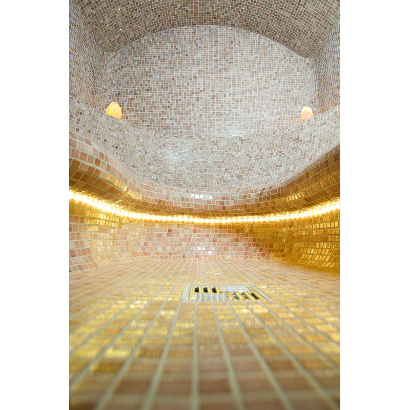 Ławki, ściany i sufity do sauny parowej wykonane są ze specjalnego polistyrenu ekstrudowanego według indywidualnego projektu. Łuki sufitu są ukształtowane tak, aby zgromadzona na nich para nie ściekała na korzystających z sauny osób.