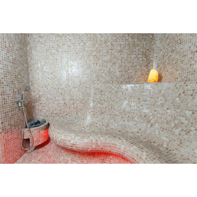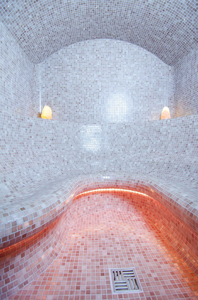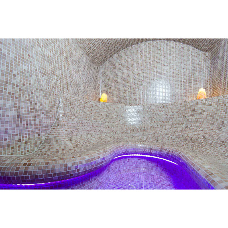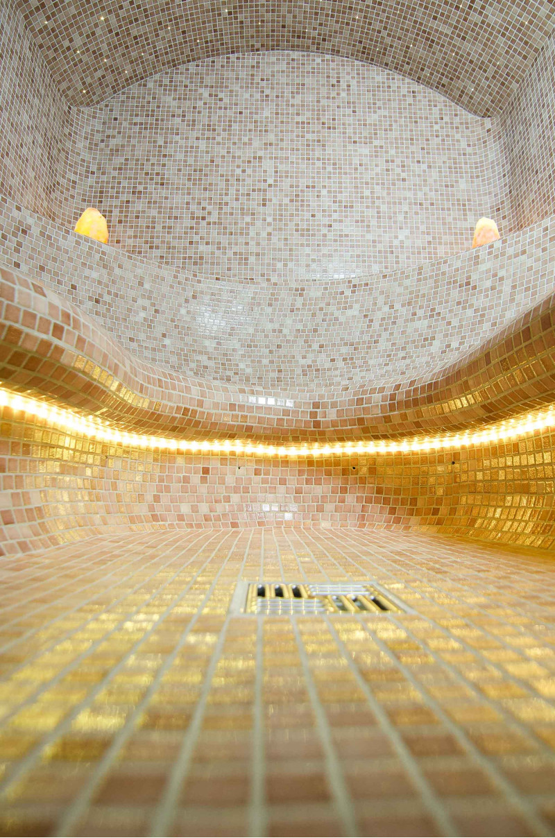 Wykończenie - podłogi saun, ściany, sufity i ławki ozdobione są drobnymi mozaikami z kruszonego szkła.