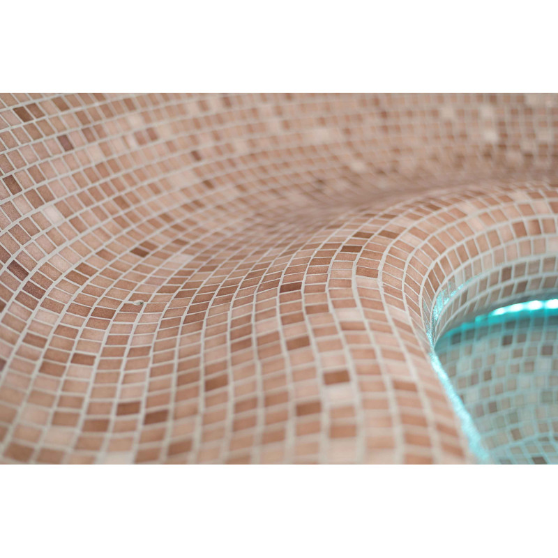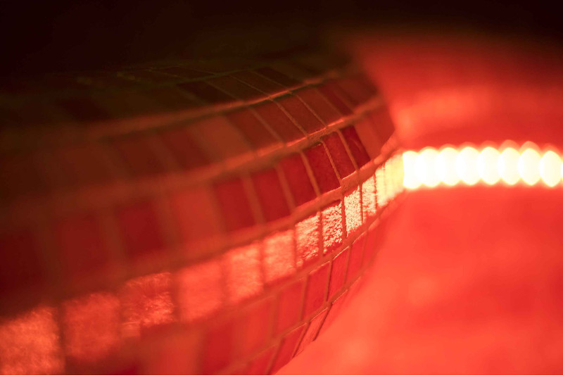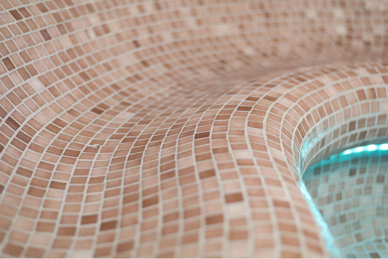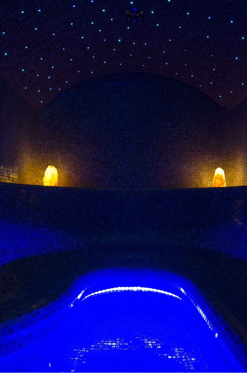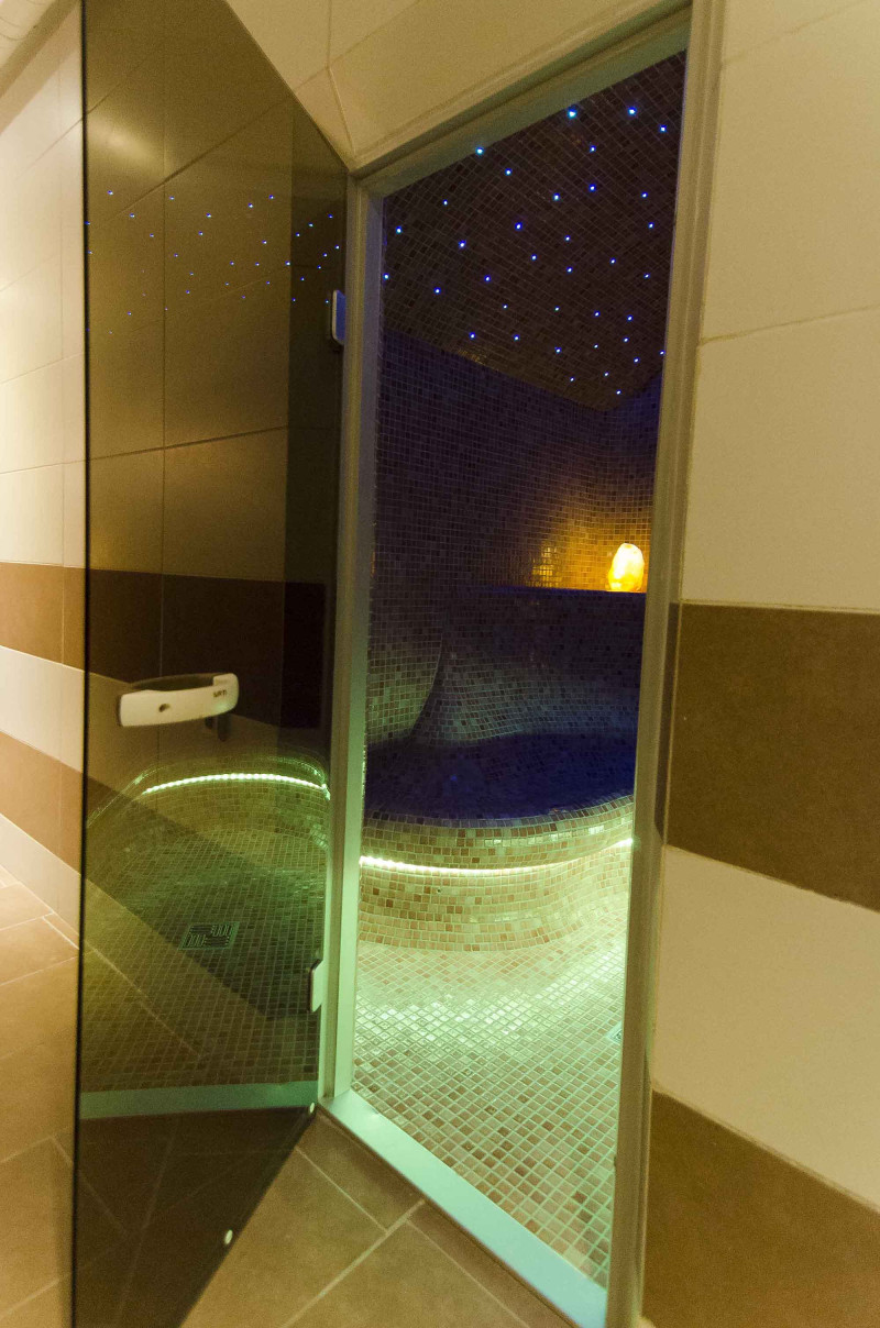 Wykończenie - podłogi saun, ściany, sufity i ławki ozdobione są drobnymi mozaikami z kruszonego szkła.