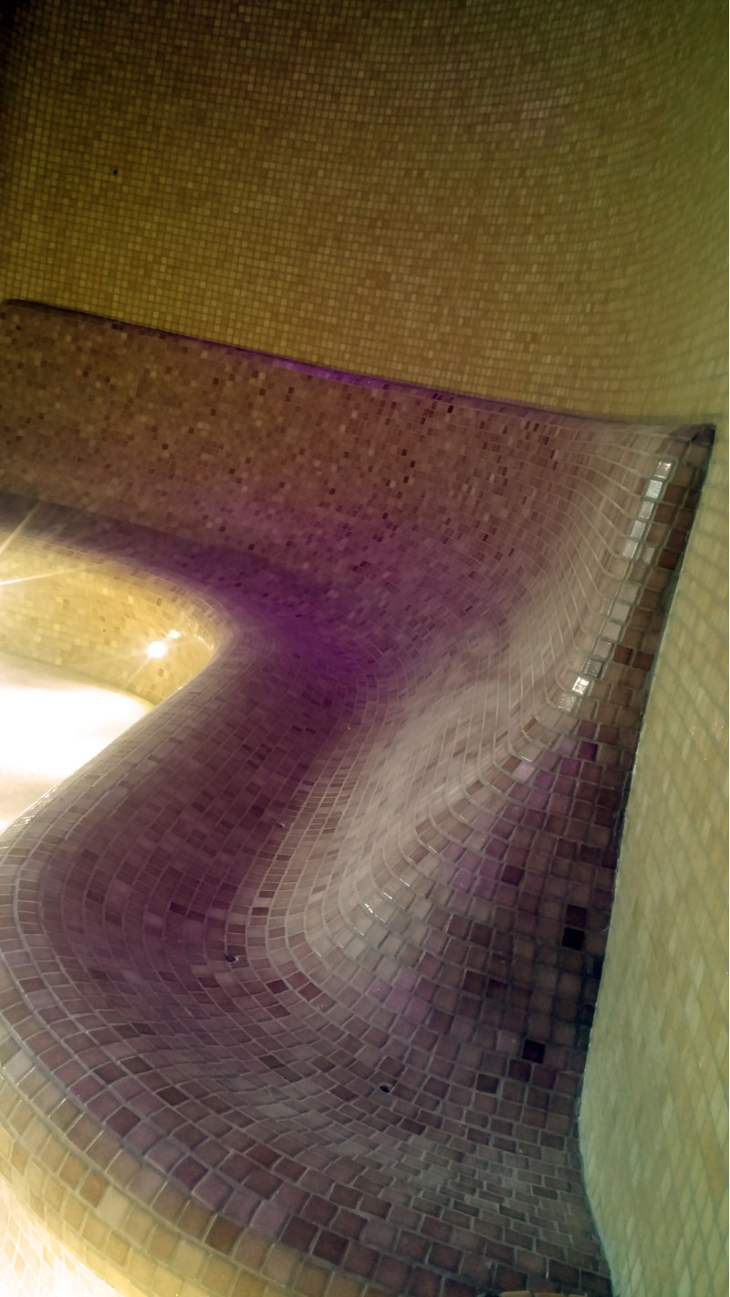 Wykończenie - podłogi, ściany, ławki zdobione mozaiką szklaną kruszoną.
