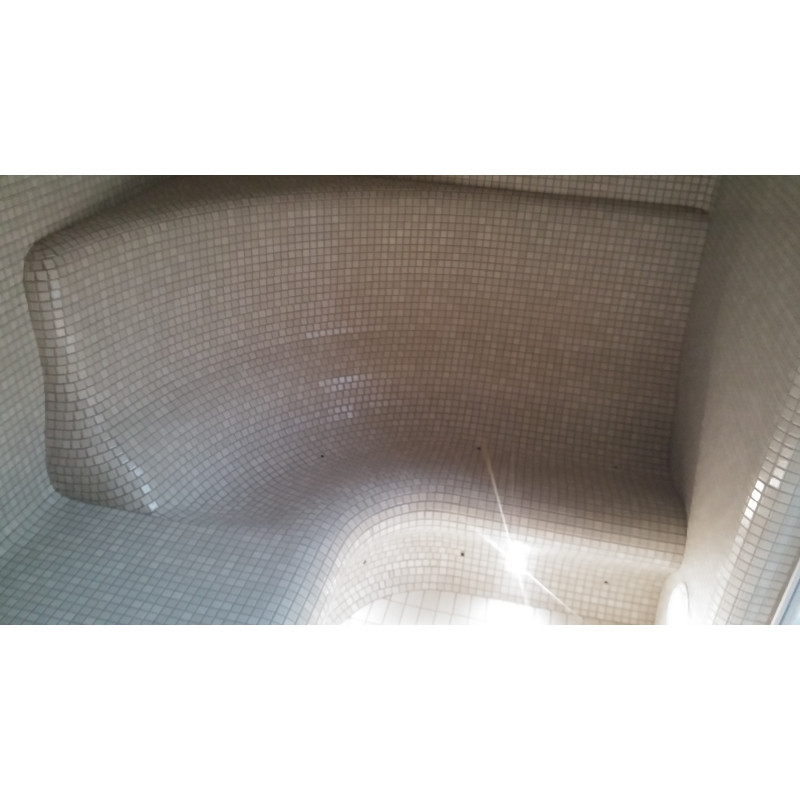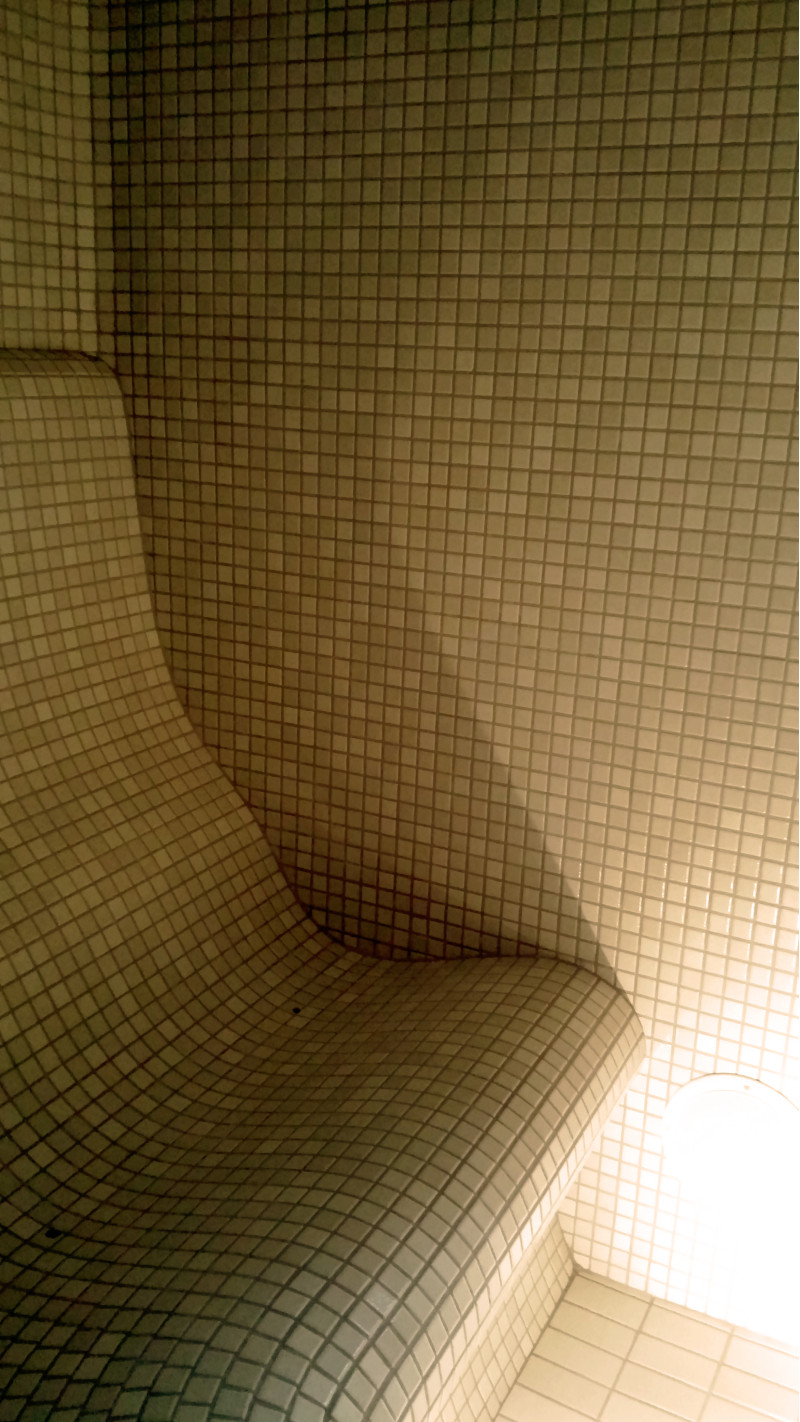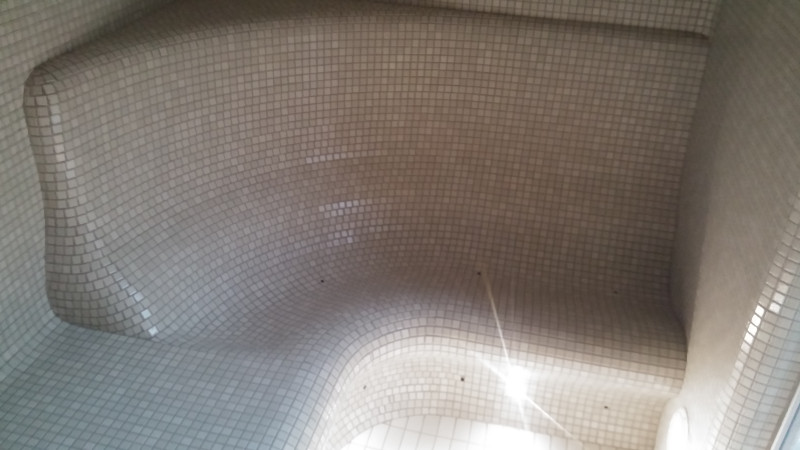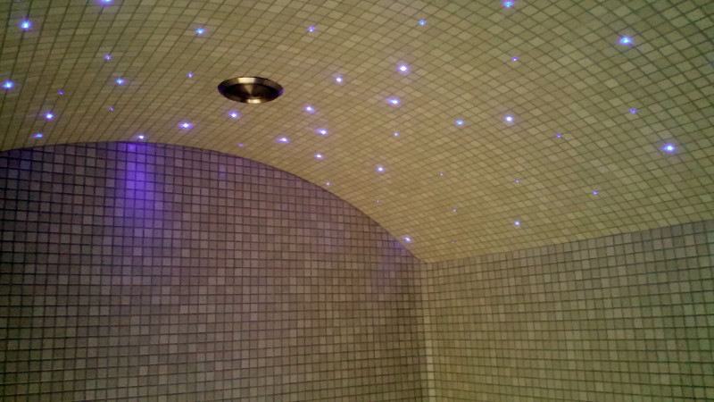 Wykończenie - sufity saun, ściany i leżaki ozdobione są mozaiką z kruszonego szkła. Podłoga to płytka z długowiecznością.