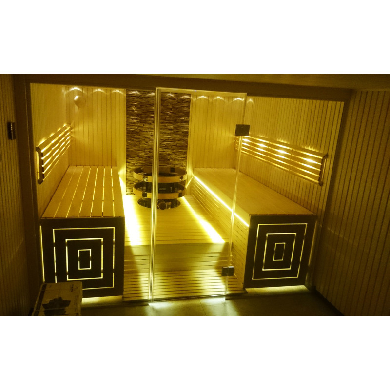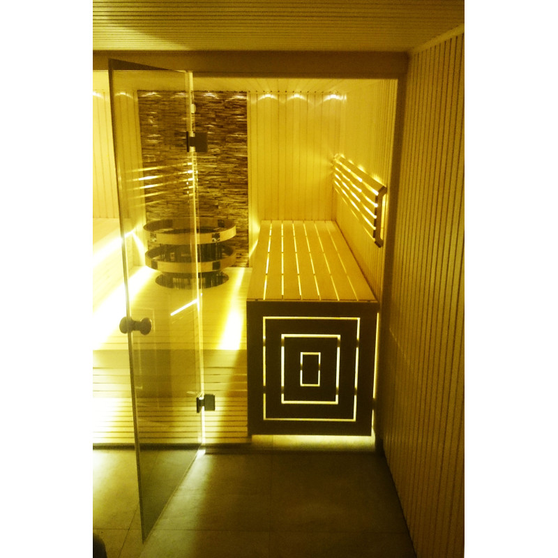 Bruksela posiada saunę, która wyróżnia się designem i rozwiązaniami technicznymi. Zaproponowano indywidualny, oszczędzający miejsce projekt zarówno dla małych pomieszczeń saunowych, jak i kąpielowych. Leżaki saunowe ustawione są na podium, naprzeciw siebie, tworząc wspaniałą atmosferę komunikacji. Piec jest wbudowany w podłogę za pomocą pierścieni ochronnych. Dekoracyjna ściana z cegły to ekskluzywny akcent, tworzący przytulne, oryginalne otoczenie. Przeszklona witryna optycznie powiększa przestrzeń i dopełnia ultranowoczesny styl sauny.