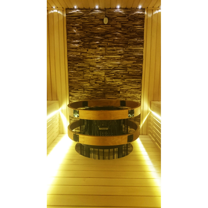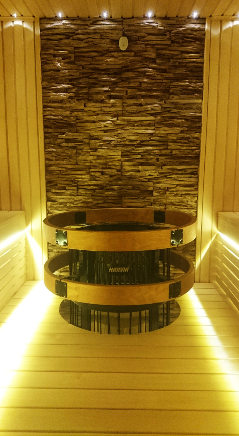 Rozgrzewacz - Harvia Legend, który daje dużo pary. Wypełniony dużą ilością kamieni z diabazu oliwinu. Grzejnikiem steruje cyfrowa konsola Griffin, która może ustawić temperaturę z dokładnością do jednego stopnia.