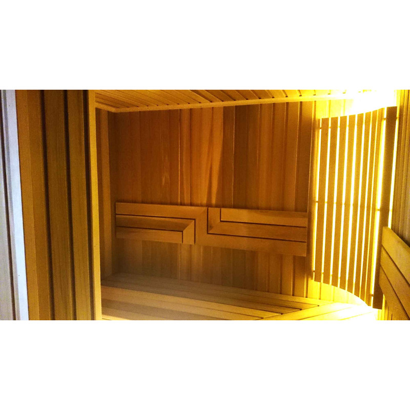 Do sauny wybrano grzałkę elektryczną EOS Bi-O Max z 8-litrową wytwornicą pary. Wytwarza w saunie dużo przyjemnej pary i wilgoci. Zaletą konstrukcji grzałki jest to, że kamienie nie stykają się z elementami grzejnymi, co wydłuża żywotność. Grzejnikiem steruje EOS EmoTouch II AF. Wypełniony 60kg kamieniami jadeitowymi. Jadeit to wyjątkowy kamień do saun, który po podgrzaniu uwalnia leczniczą energię. Ma działanie przeciwbólowe, antytoksyczne i przeciwzapalne.