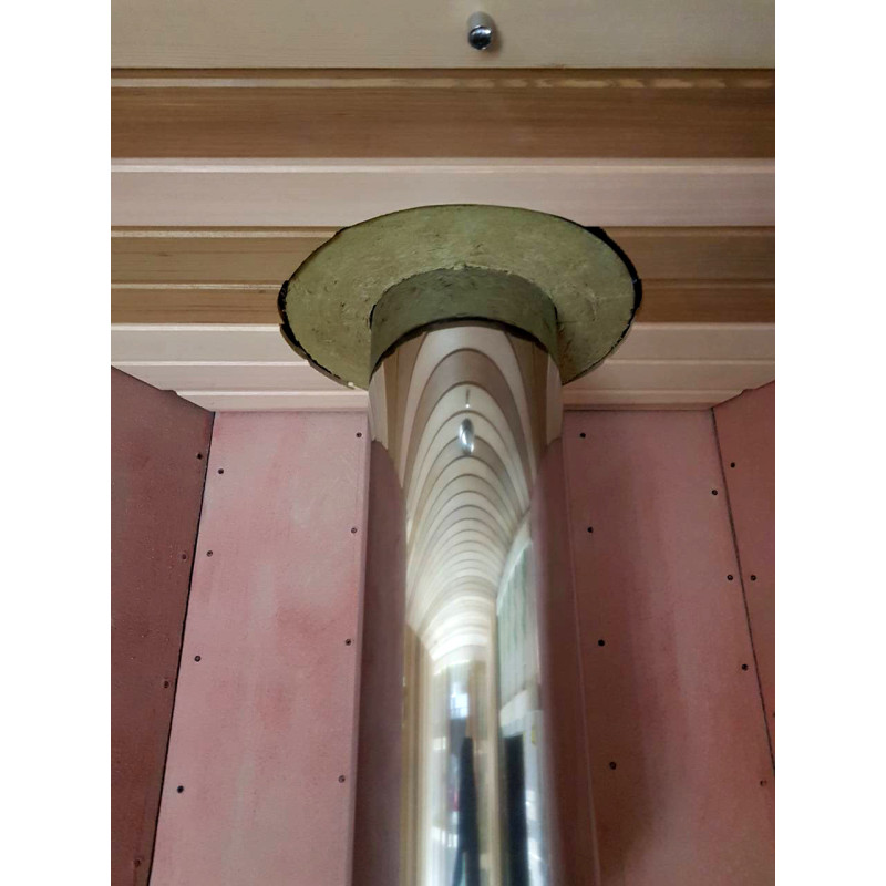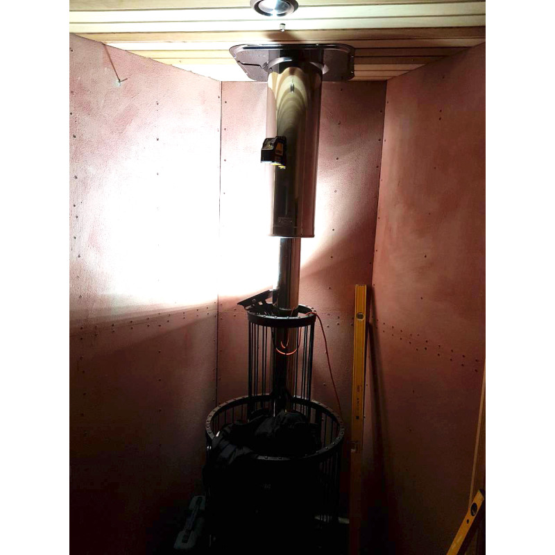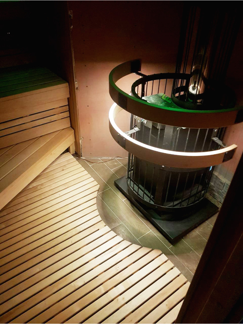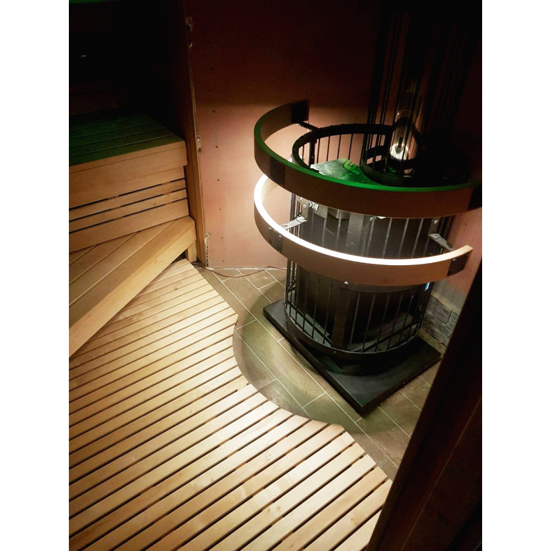 Wybrano piec opalany drewnem Harvia Legend 240 DUO z zewnętrznym paleniskiem, żeliwnymi drzwiami i przeszklonym oknem wypełnionym dużą ilością steatytu, co pozwala cieszyć się ciepłem, które emanują nawet przy braku wysokich temperatur dla średniej wielkości sauny. Obudowy pieców - Harvia Legend z oświetleniem.