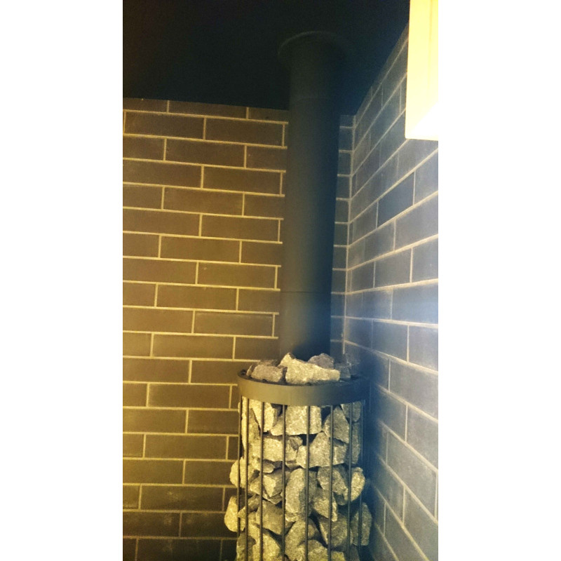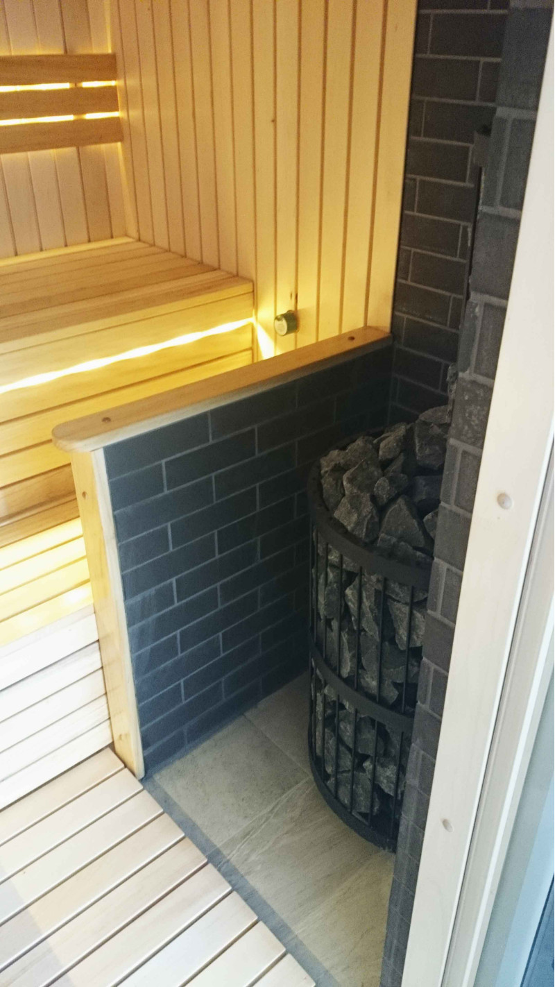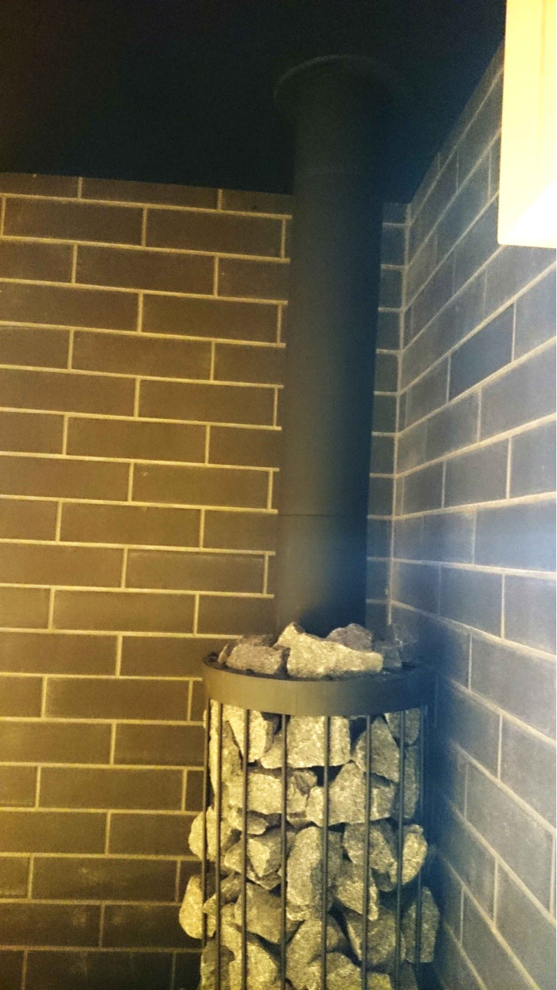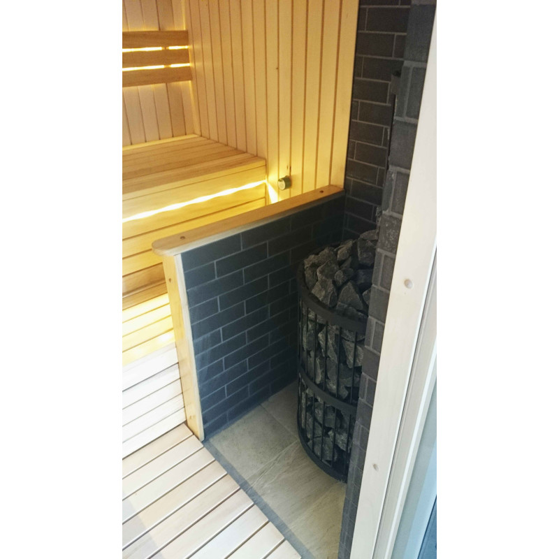 Ten projekt sauny ze ścianą ochronną na piec. Ściana wykonana jest z płyty żaroodpornej Minerit, na metalowej ramie.