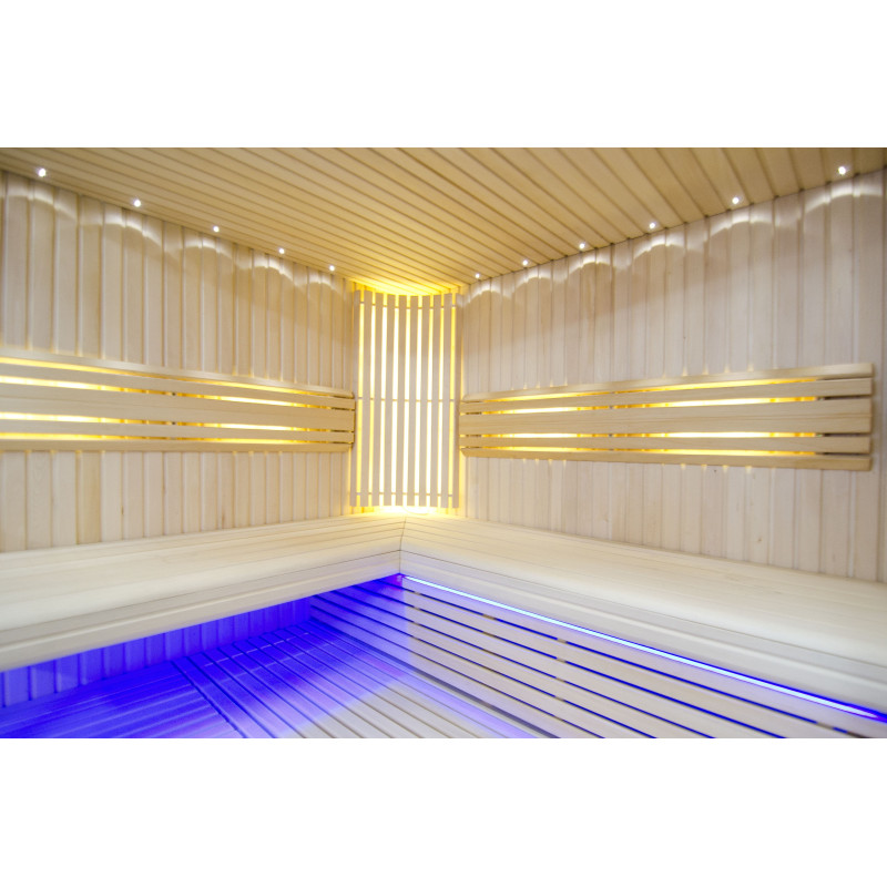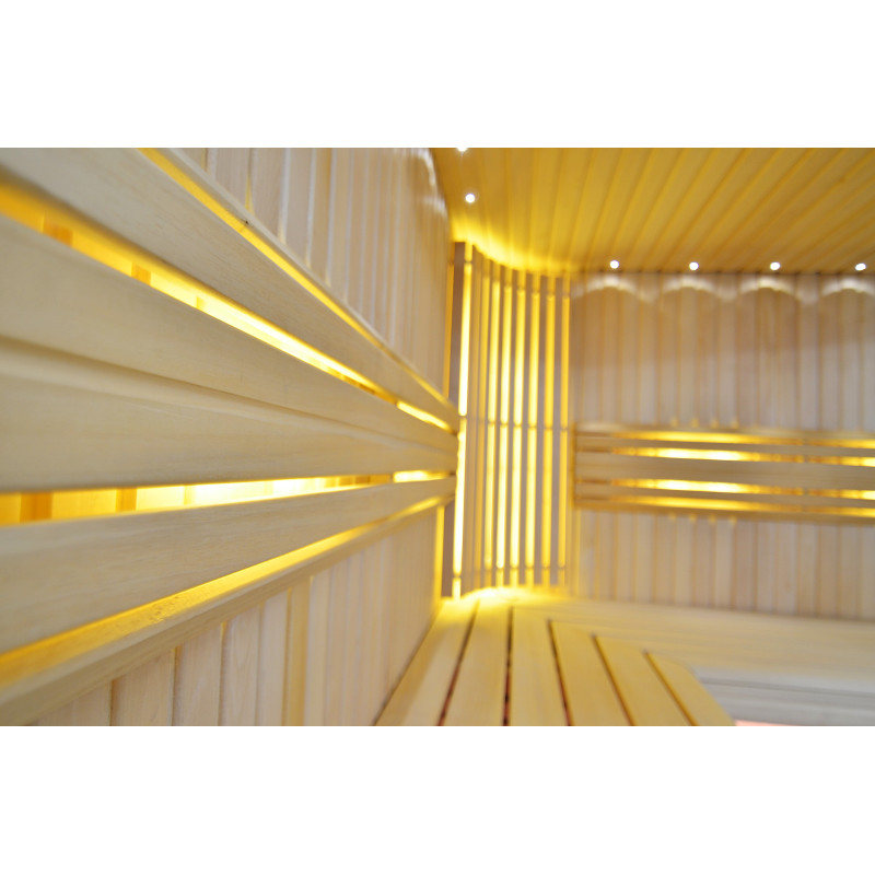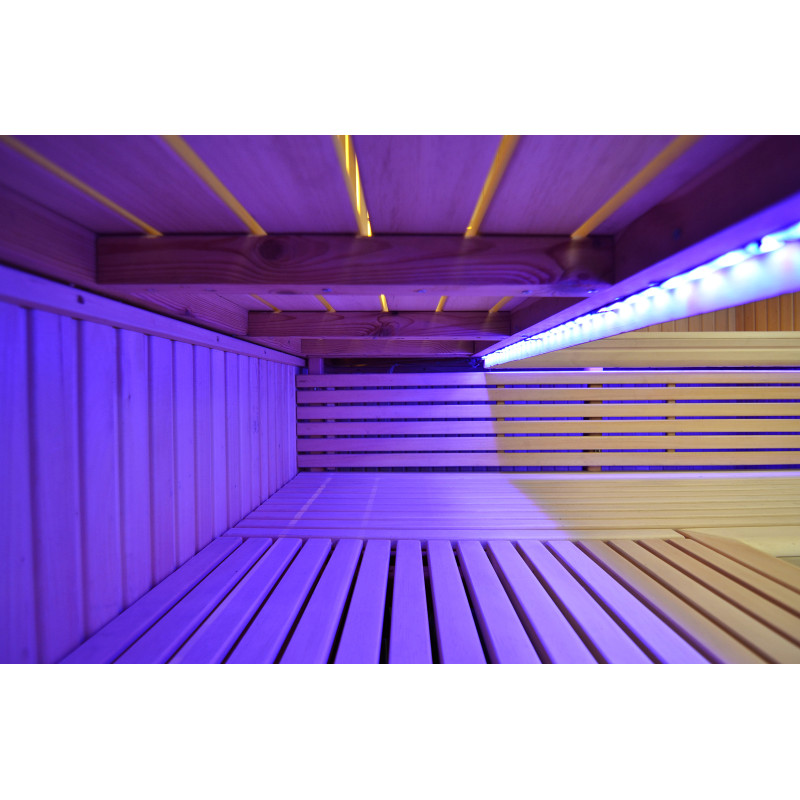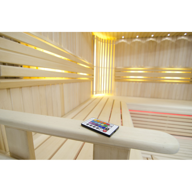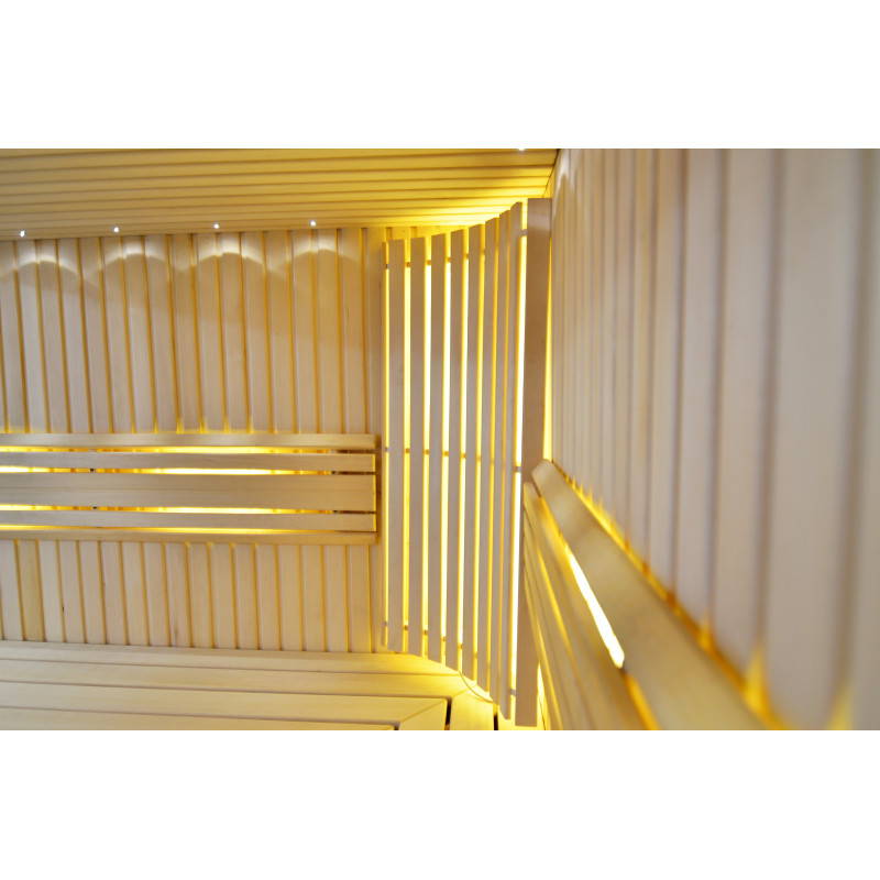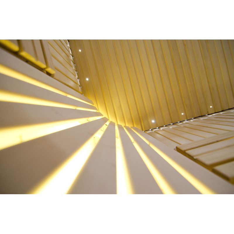Sufit oświetlony jest białym oświetleniem LED „księżyc” – dobra alternatywa dla oświetlenia światłowodowego. Na ścianach pod oparciami - białe ciepłe oświetlenie LED, które doskonale podkreśla fakturę drewna. Pod ławkami - kolorowe oświetlenie LED RGB, którego kolorami można łatwo sterować za pomocą pilota, aby stworzyć pożądany klimat sauny.