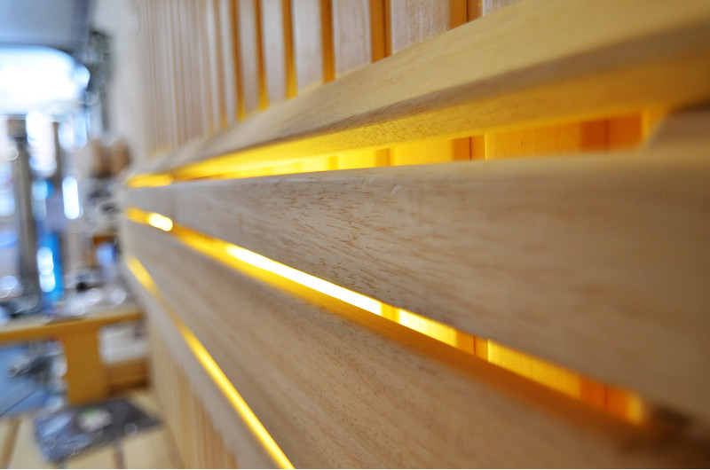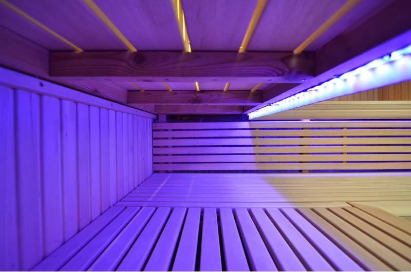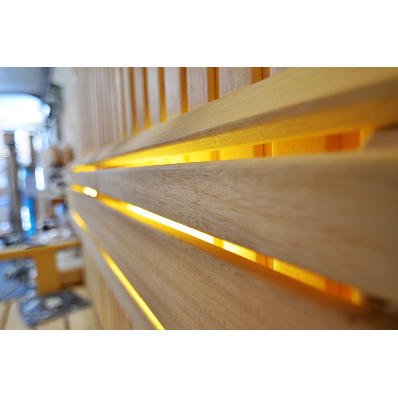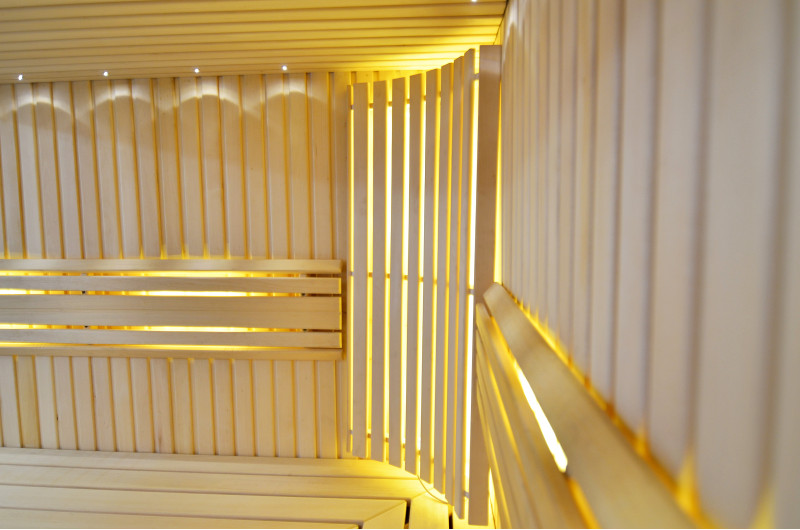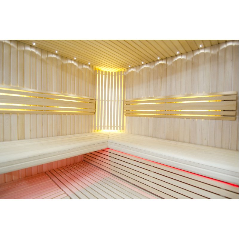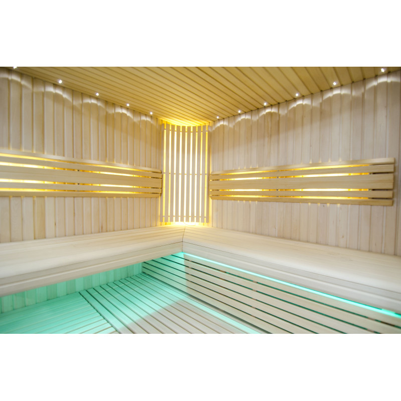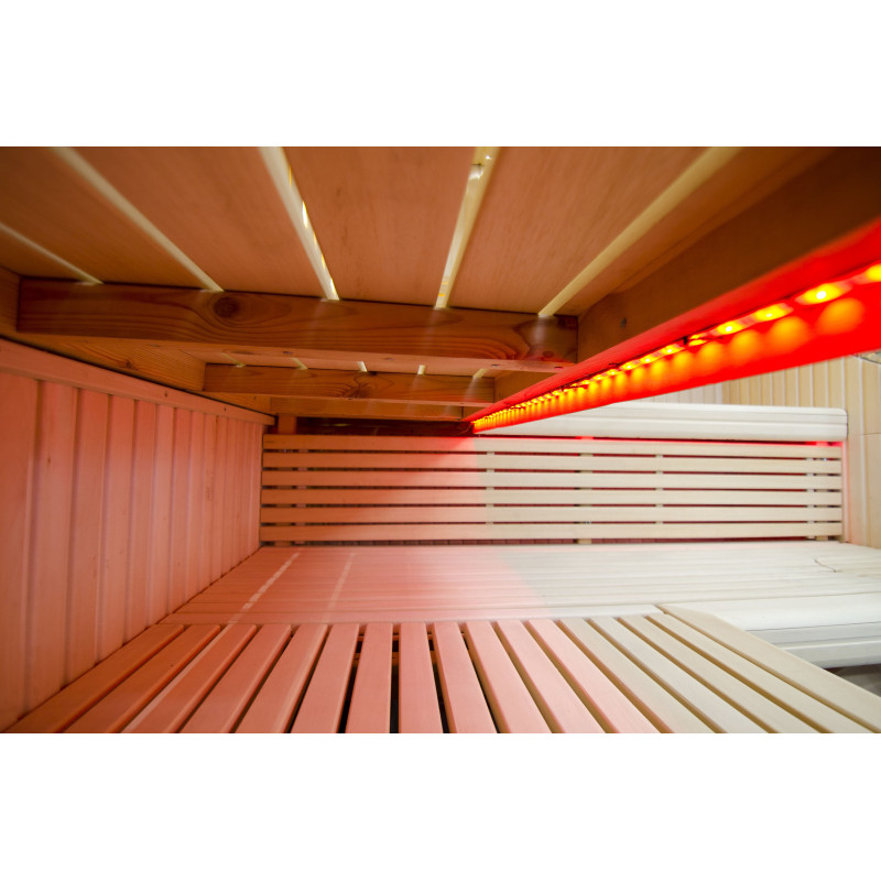 Sufit oświetlony jest białym oświetleniem LED „księżyc” – dobra alternatywa dla oświetlenia światłowodowego. Na ścianach pod oparciami - białe ciepłe oświetlenie LED, które doskonale podkreśla fakturę drewna. Pod ławkami - kolorowe oświetlenie LED RGB, którego kolorami można łatwo sterować za pomocą pilota, aby stworzyć pożądany klimat sauny.