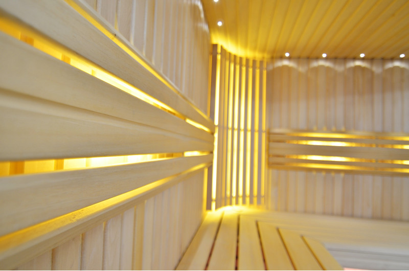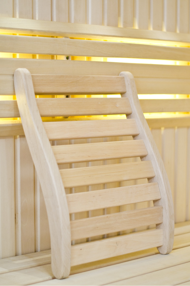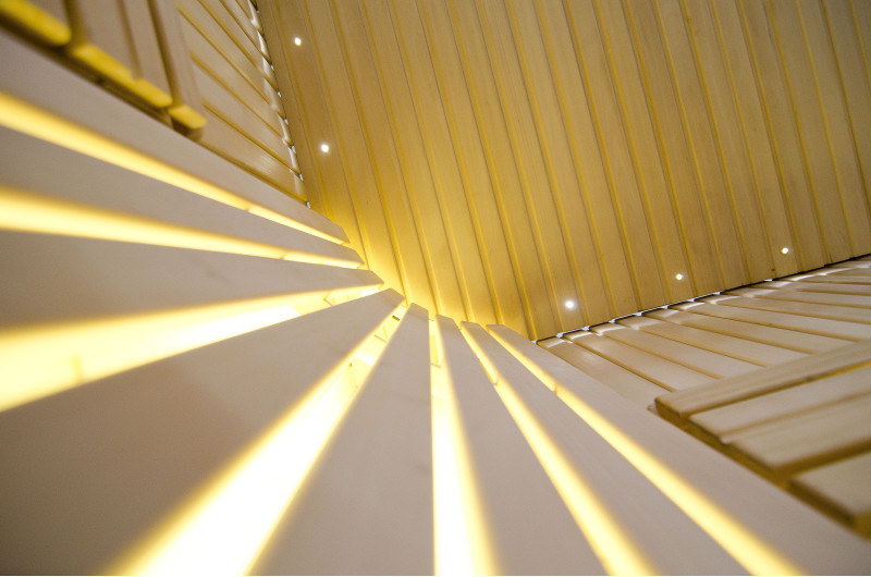 Ściany wykonane są z najwyższej jakości jasnego drewna lipowego, a ławki i oparcia z afrykańskiego drewna abachi, które nie nagrzewa się zbytnio, dzięki czemu jest szczególnie przyjemne i wygodne do siedzenia.