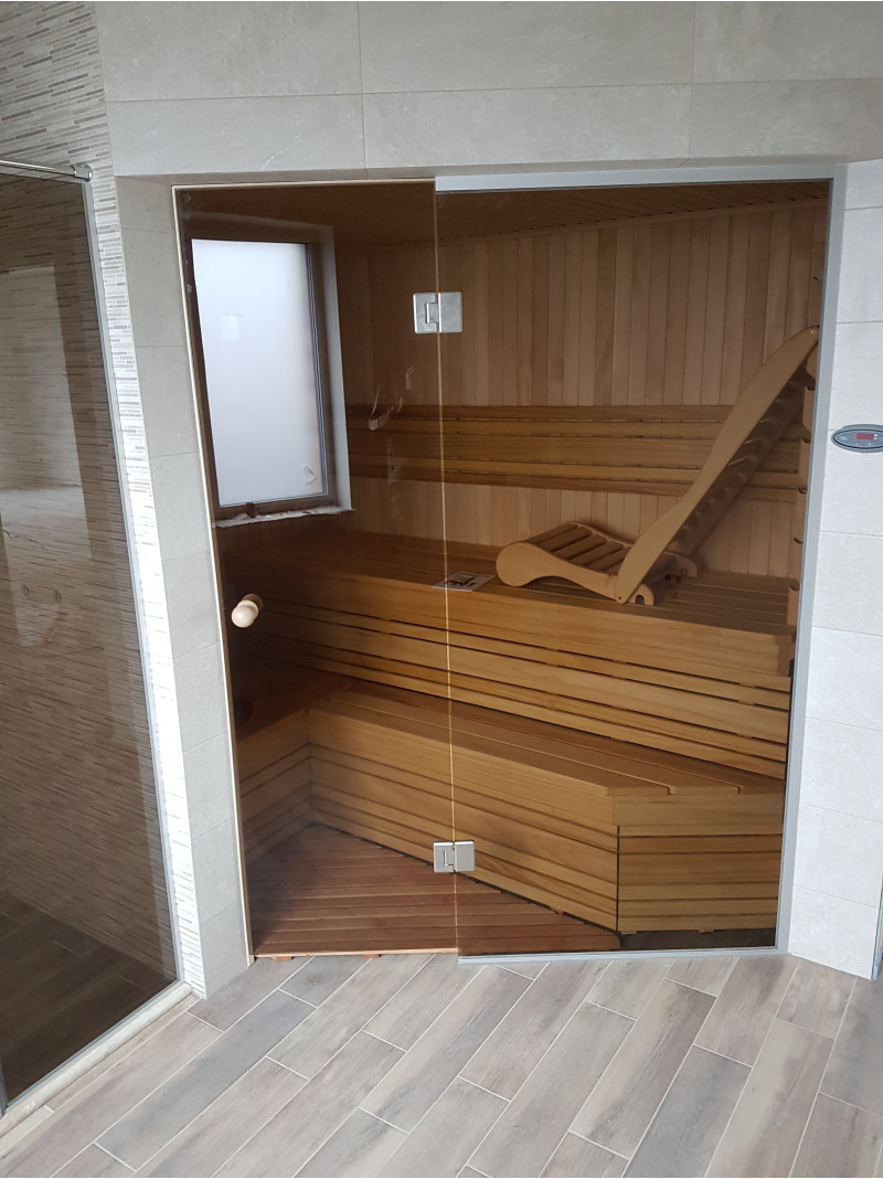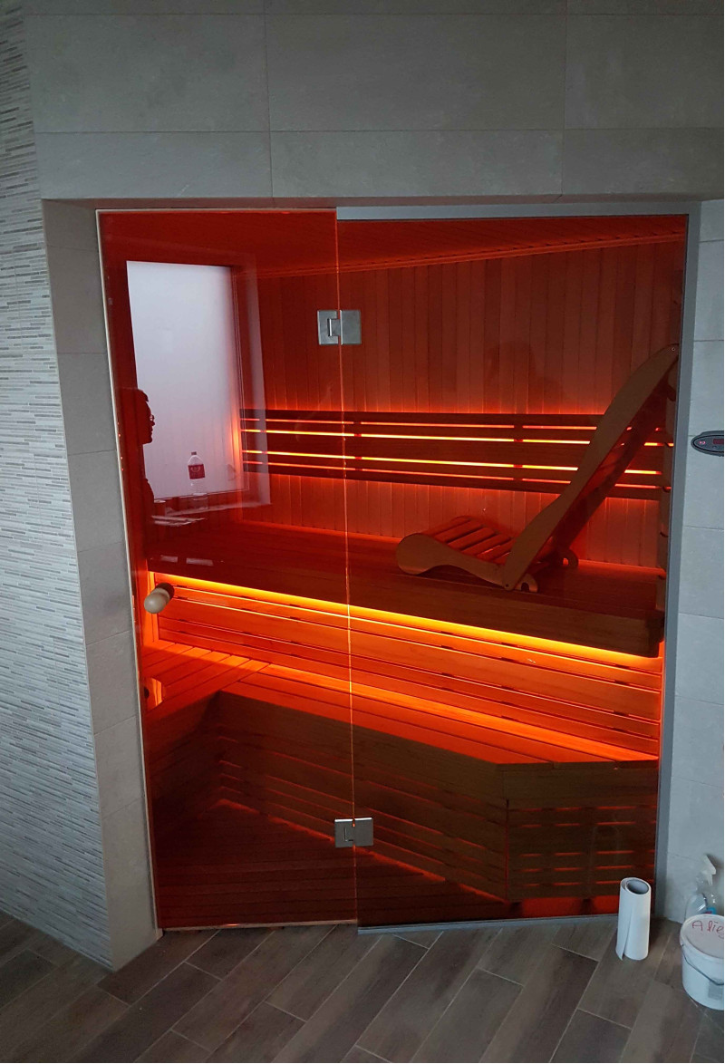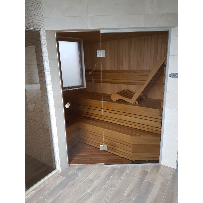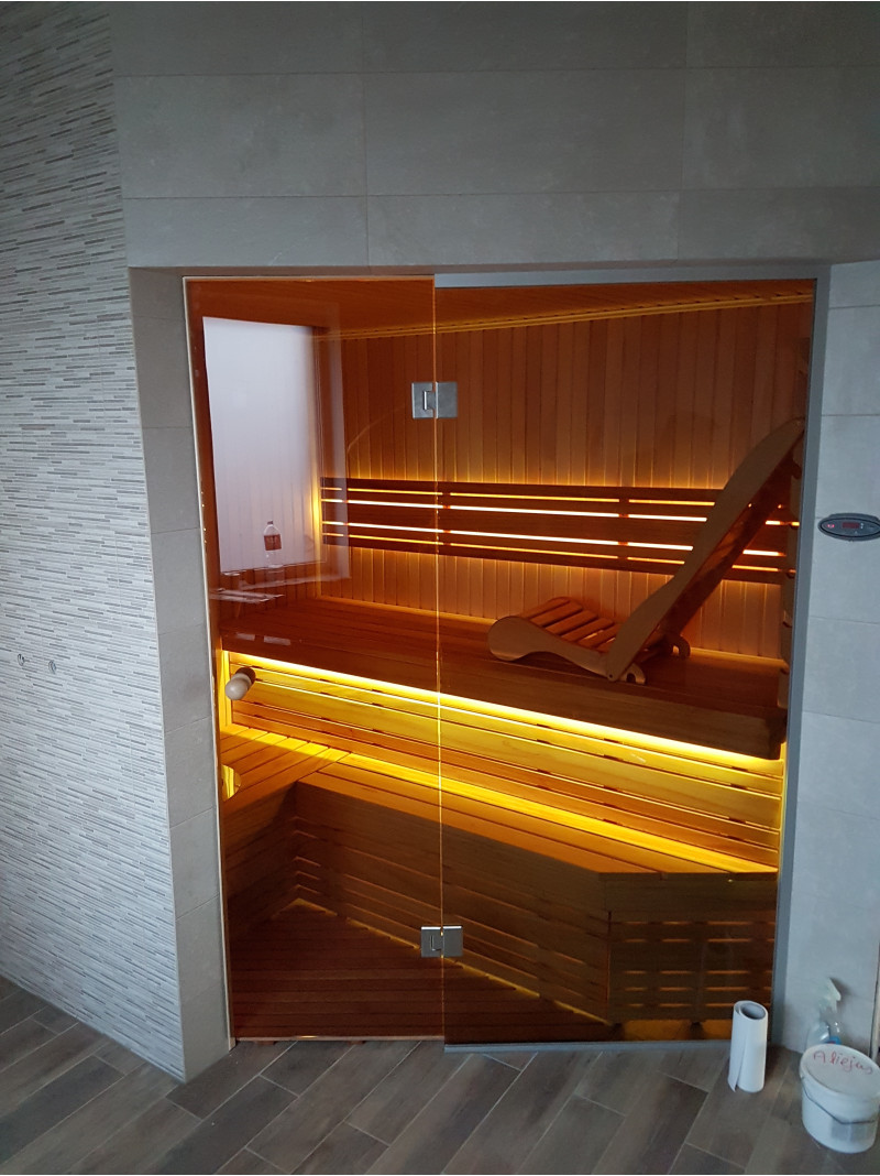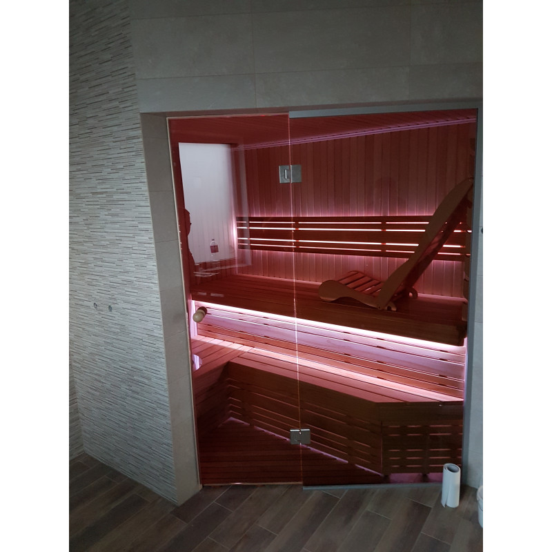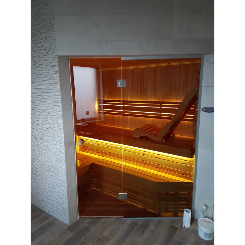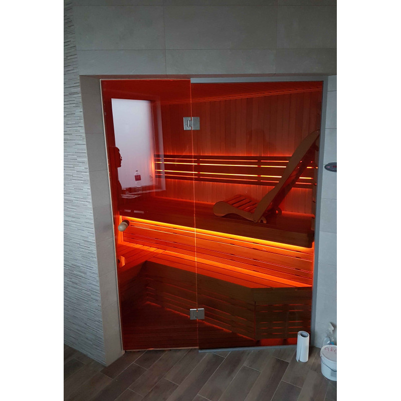 Drzwi do sauny to hartowana, brązowa, szklana witryna o grubości 8 mm z aluminiową ramą, która jest odporna na ciepło i wilgoć, wahania temperatury.
