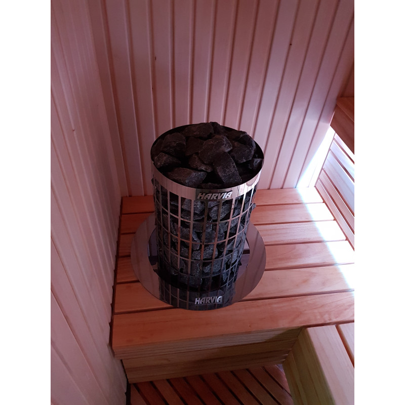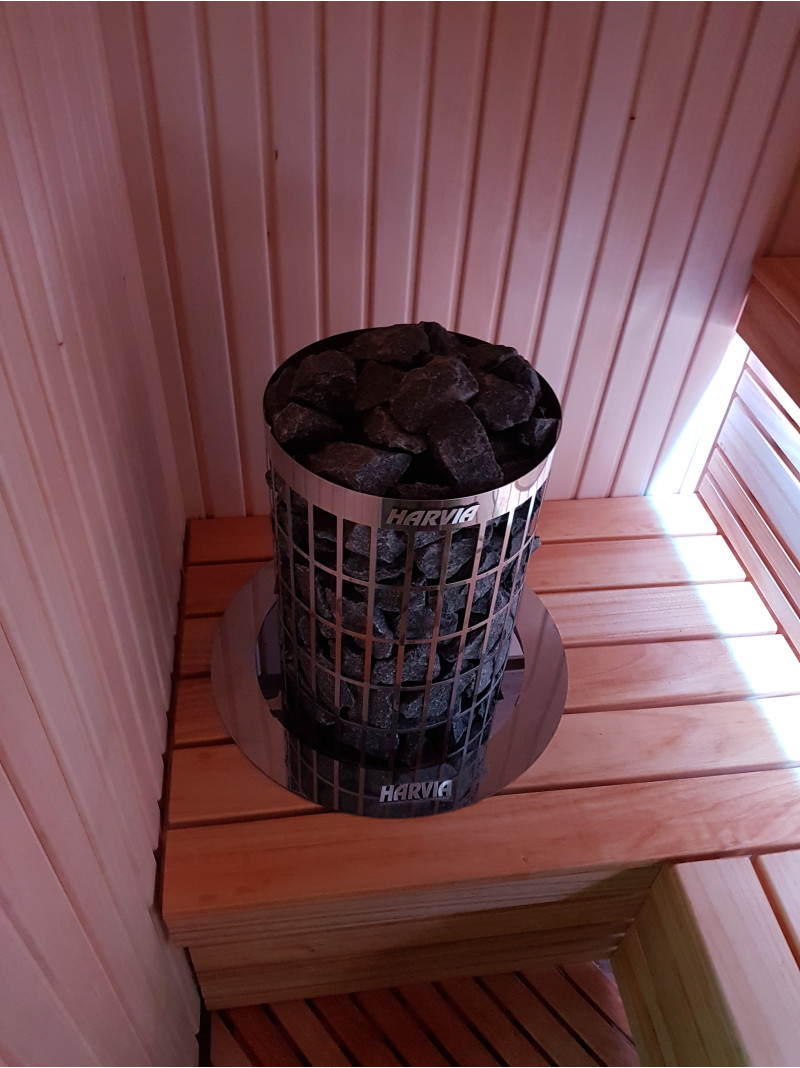 Piec o nowoczesnym designie - Harvia Cilindro z pierścieniem wykończeniowym ze stali nierdzewnej, wkomponowany w leżanki saunowe. Mieści dużą ilość kamieni, wytwarza dużo lekkiej pary.