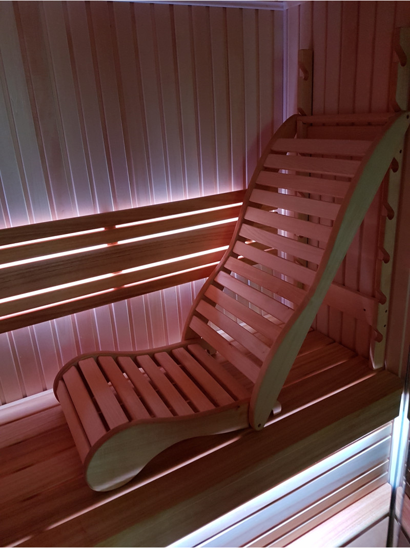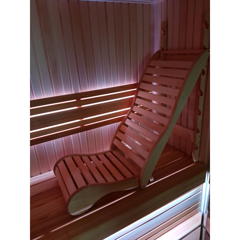 Na górnym łóżku sauny znajduje się relaksująca, ręcznie robiona ławka, która zapewnia wygodniejsze siedzenie i relaks w saunie. Można wybrać najwygodniejszą pozycję, ponieważ można regulować wysokość i pozycję tej relaksującej ławki do sauny. Elegancki design dodaje saunie dodatkowej przytulności.