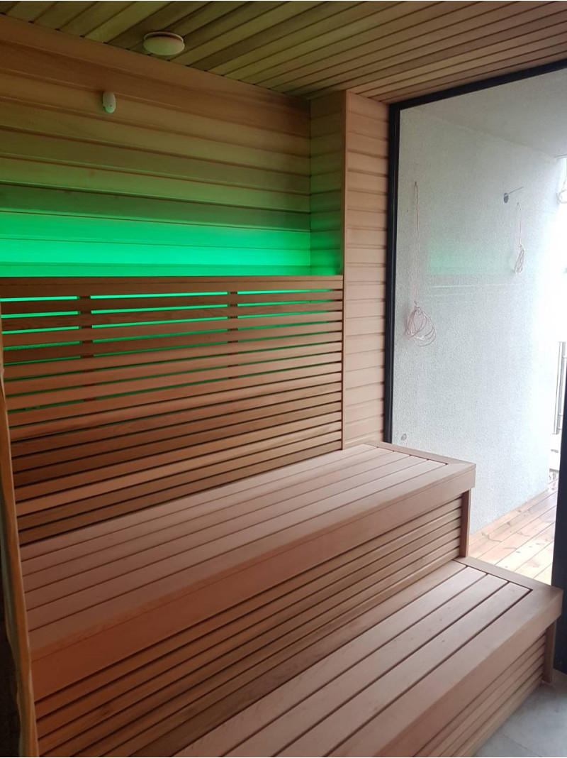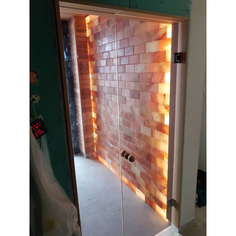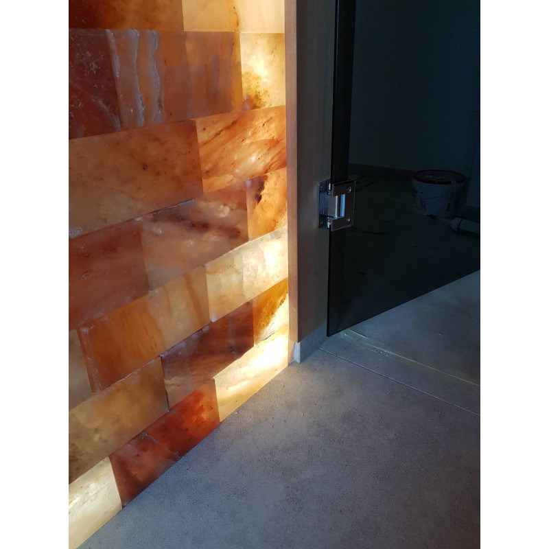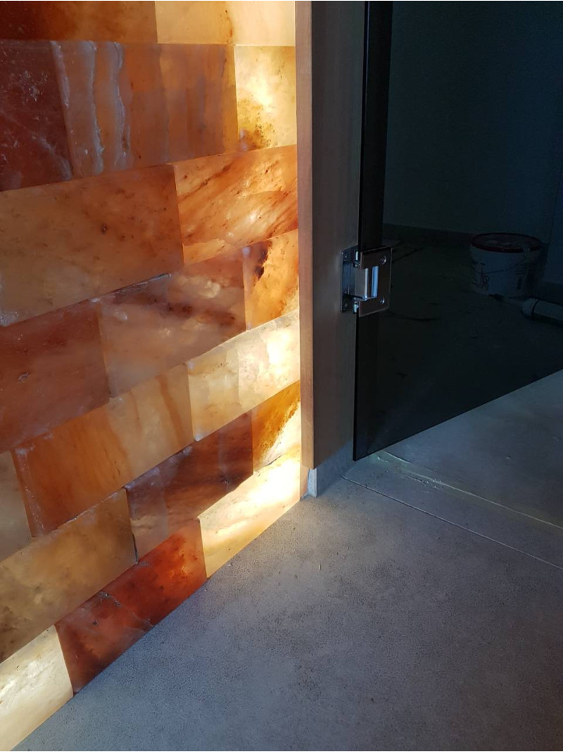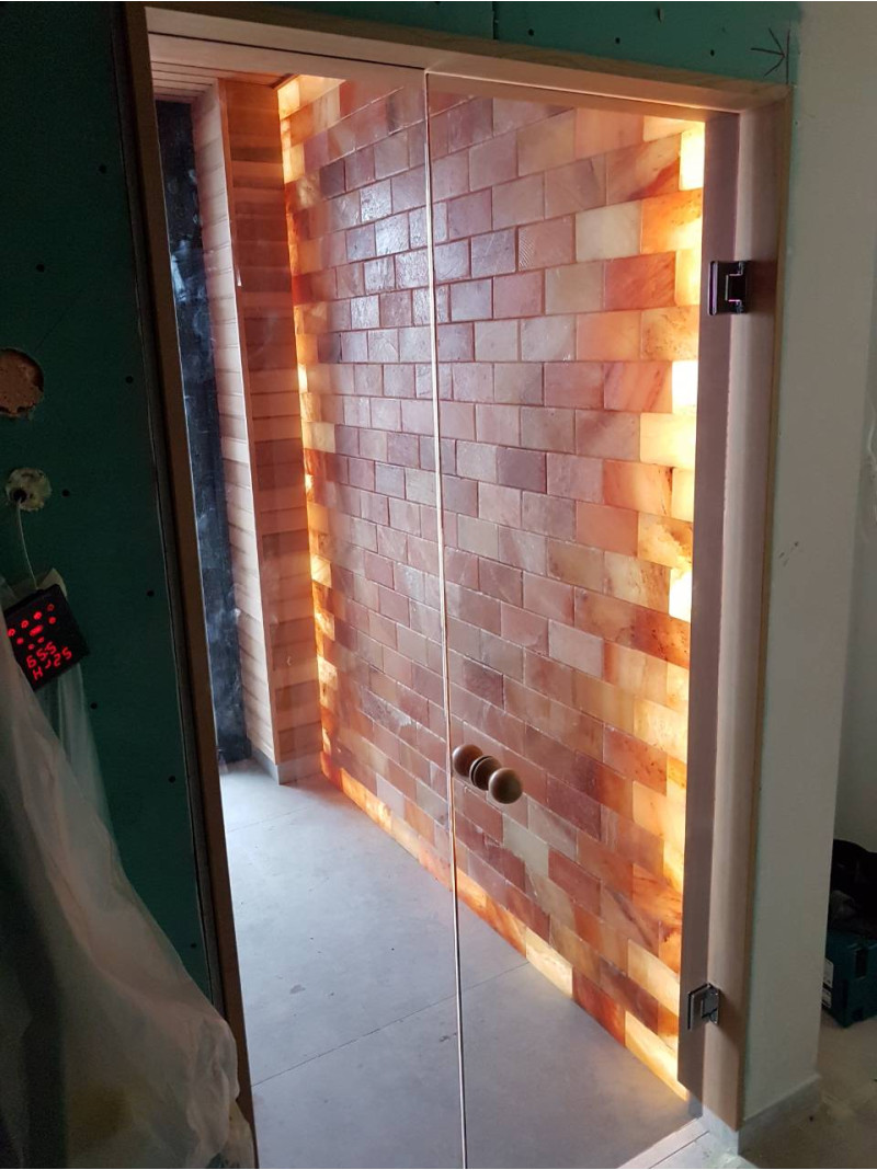 Sauna wyposażona jest w wyjątkowo wyglądającą ścianę z bloków soli himalajskiej. Ten obraz jest dodatkowo wzmocniony przez wbudowane białe ciepłe oświetlenie pod blokami soli, podkreślające kolor i wzory soli. Sól himalajska jest używana w saunie nie tylko ze względu na jej piękno, ale twierdzi się, że sól himalajska łagodzi objawy alergii i astmy, poprawia nastrój i dodaje energii, neutralizuje promieniowanie elektromagnetyczne, zmniejsza elektryczność statyczną w powietrzu.