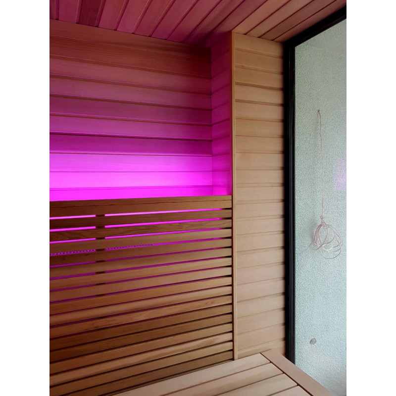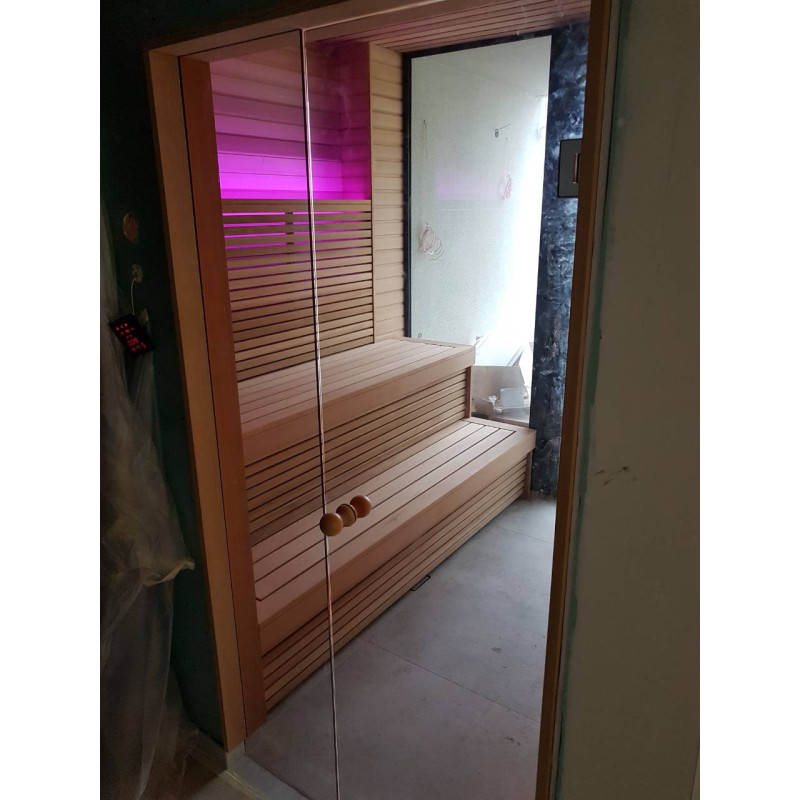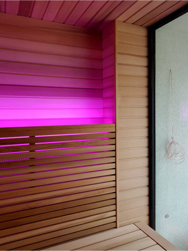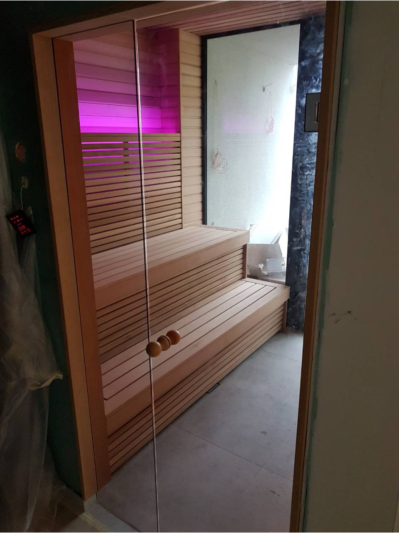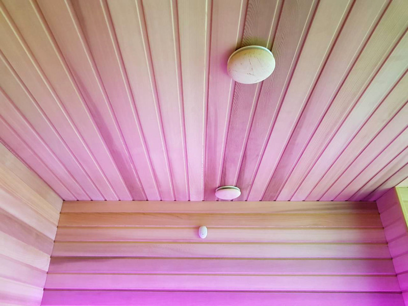 Sauna wyposażona jest w wyjątkowo wyglądającą ścianę z bloków soli himalajskiej. Ten obraz jest dodatkowo wzmocniony przez wbudowane białe ciepłe oświetlenie pod blokami soli, podkreślające kolor i wzory soli. Sól himalajska jest używana w saunie nie tylko ze względu na jej piękno, ale twierdzi się, że sól himalajska łagodzi objawy alergii i astmy, poprawia nastrój i dodaje energii, neutralizuje promieniowanie elektromagnetyczne, zmniejsza elektryczność statyczną w powietrzu.