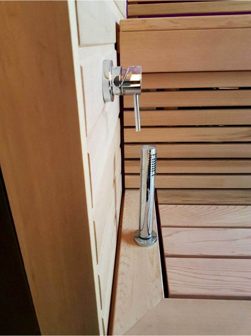Pod ławkami znajduje się grzałka elektryczna EOS Bi-O Mat U ze zintegrowaną wytwornicą pary. Jest to solidny, trwały, wąski grzejnik, wykonany w całości ze stali nierdzewnej.