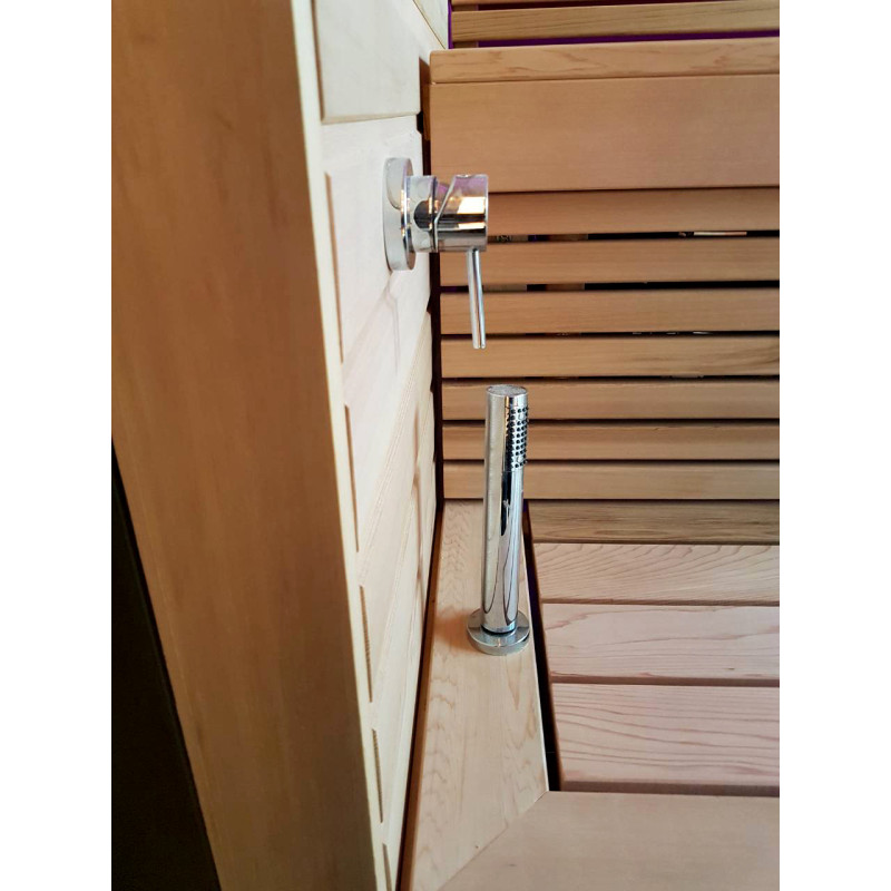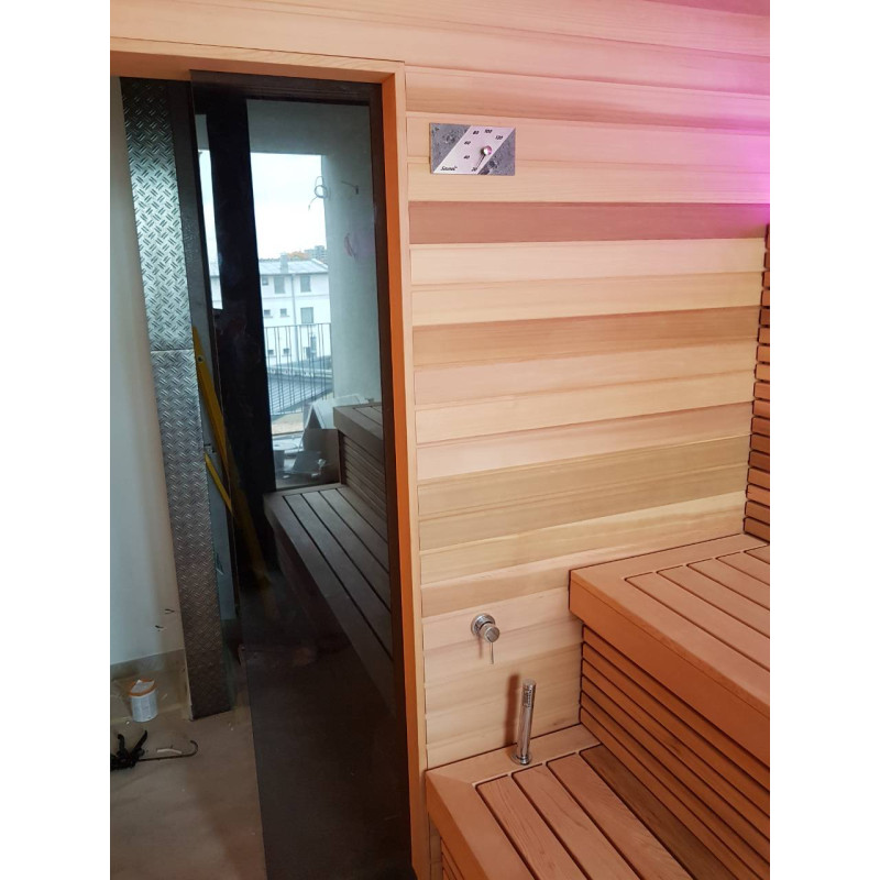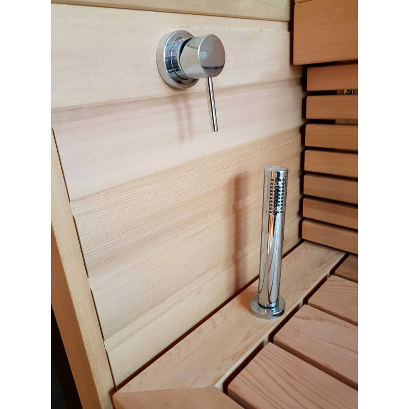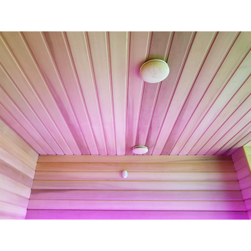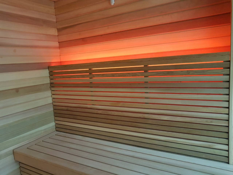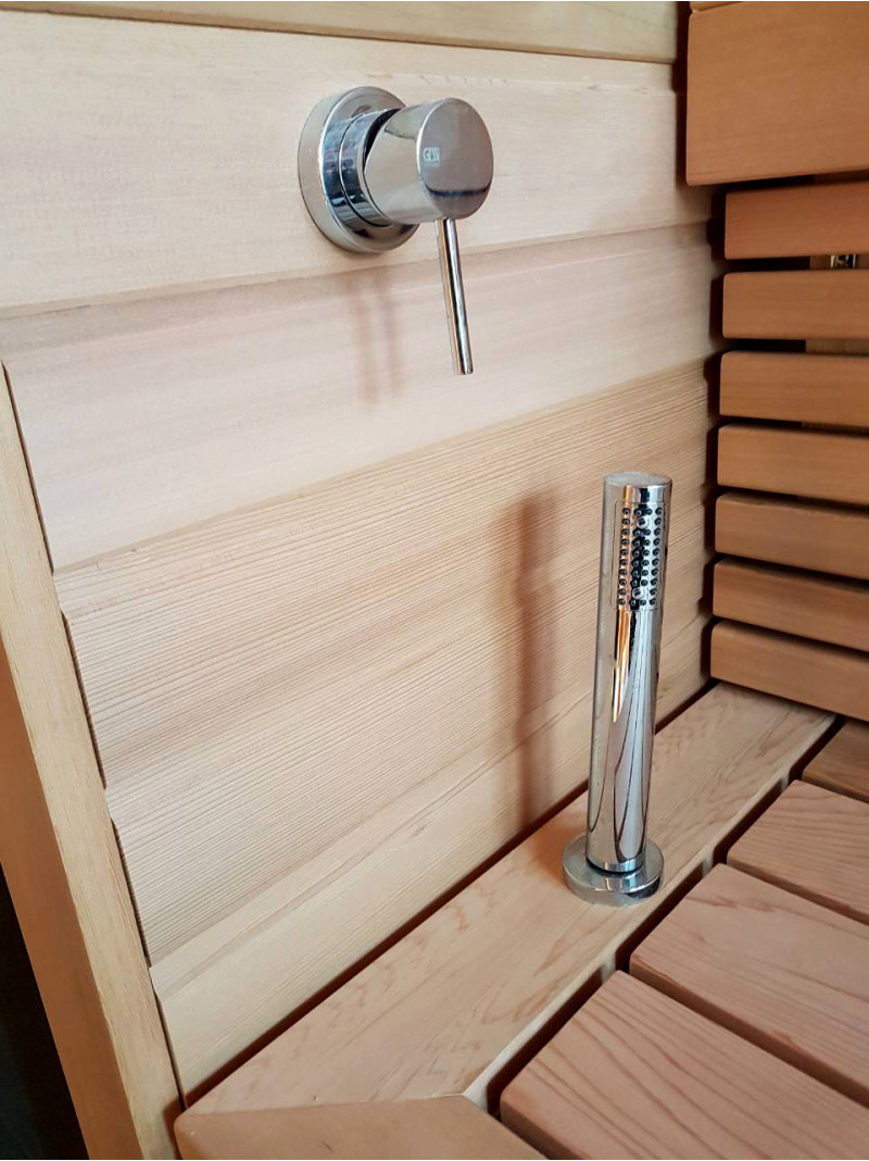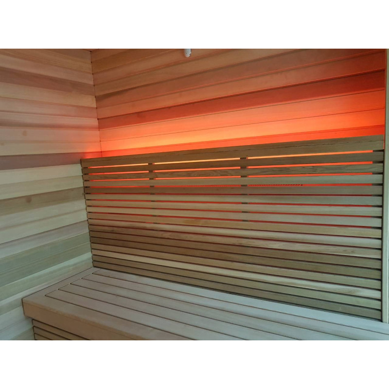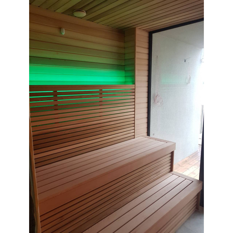 Drewniane detale wnętrza sauny wykonane są z drewna cedrowego. Drewno to jest niezwykle trwałe, odporne na ścieranie i nie odkształca się. W wysokich temperaturach siding cedrowy nie wydziela żywic. Bardzo dobrze odbija ciepło, co jest niezbędne w saunach i łaźniach. Drewno cedrowe wydziela olejki eteryczne i daje efekt naturalnej aromaterapii.