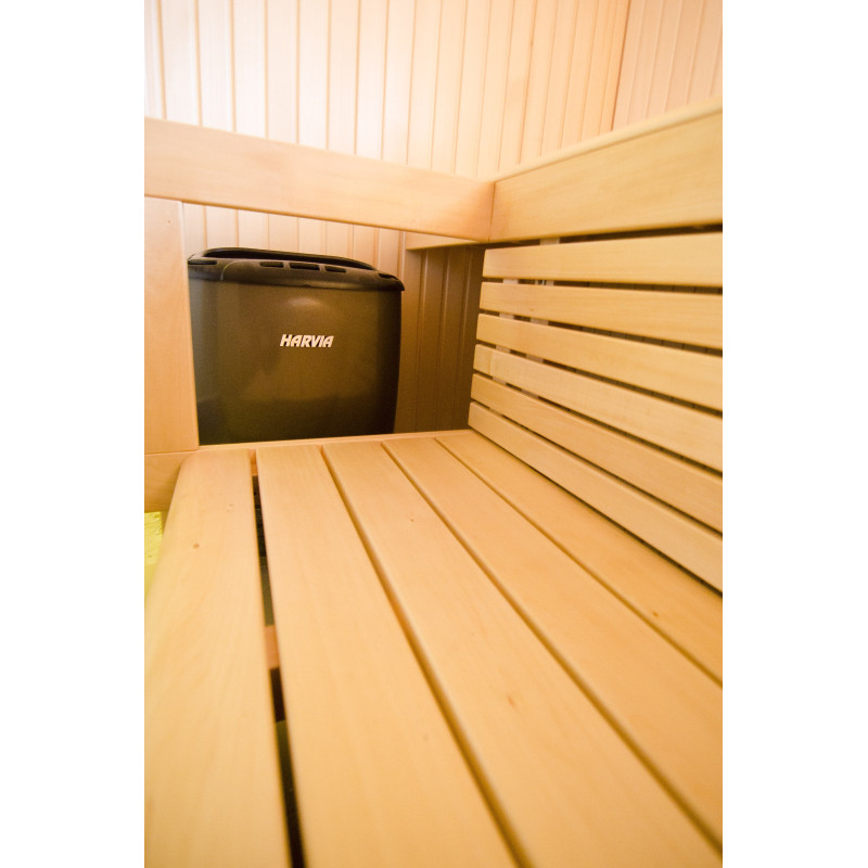 Piec jest kluczowym elementem całej sauny. Odpowiada za działanie całej sauny, co oznacza, że piec wymaga szczególnej uwagi. W tym przypadku wybrano elektryczny piec do sauny Harvia Moderna (8 kW). Grzejniki elektryczne nie wymagają dużej konserwacji, jest mniejsze ryzyko pożaru.