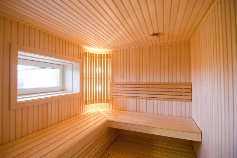 Sauna posiada również okno, które dodaje pomieszczeniu większej przestrzeni i światła.
