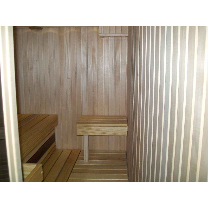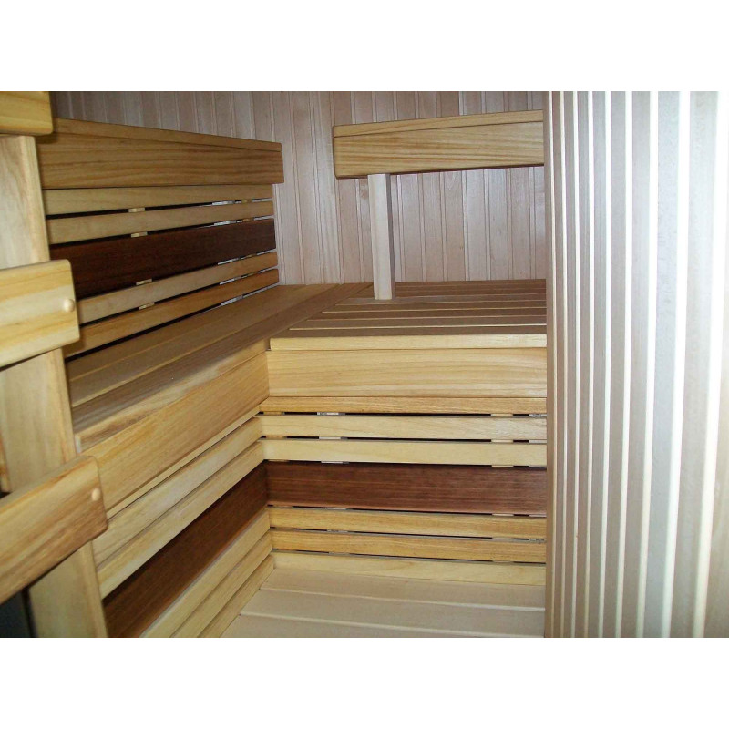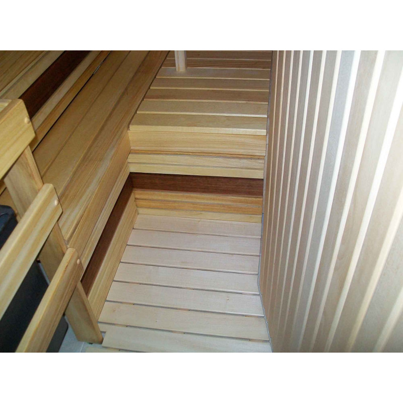Siding lipowy 15 mm służy do montażu sufitów i ścian sauny - stylowy, lekki i wydzielający przyjemny zapach drewna. Do ławek i oparć wybrano najwyższej jakości drewno cedrowe i abachi. To drewno jest wysokiej jakości, nie tylko pięknie wygląda, ale też najmniej nagrzewa się w porównaniu z innymi gatunkami drewna, dzięki czemu dotykanie takich ławek jest miłe i bezpieczne. Kratka podłogowa - drewno olcha czarna.