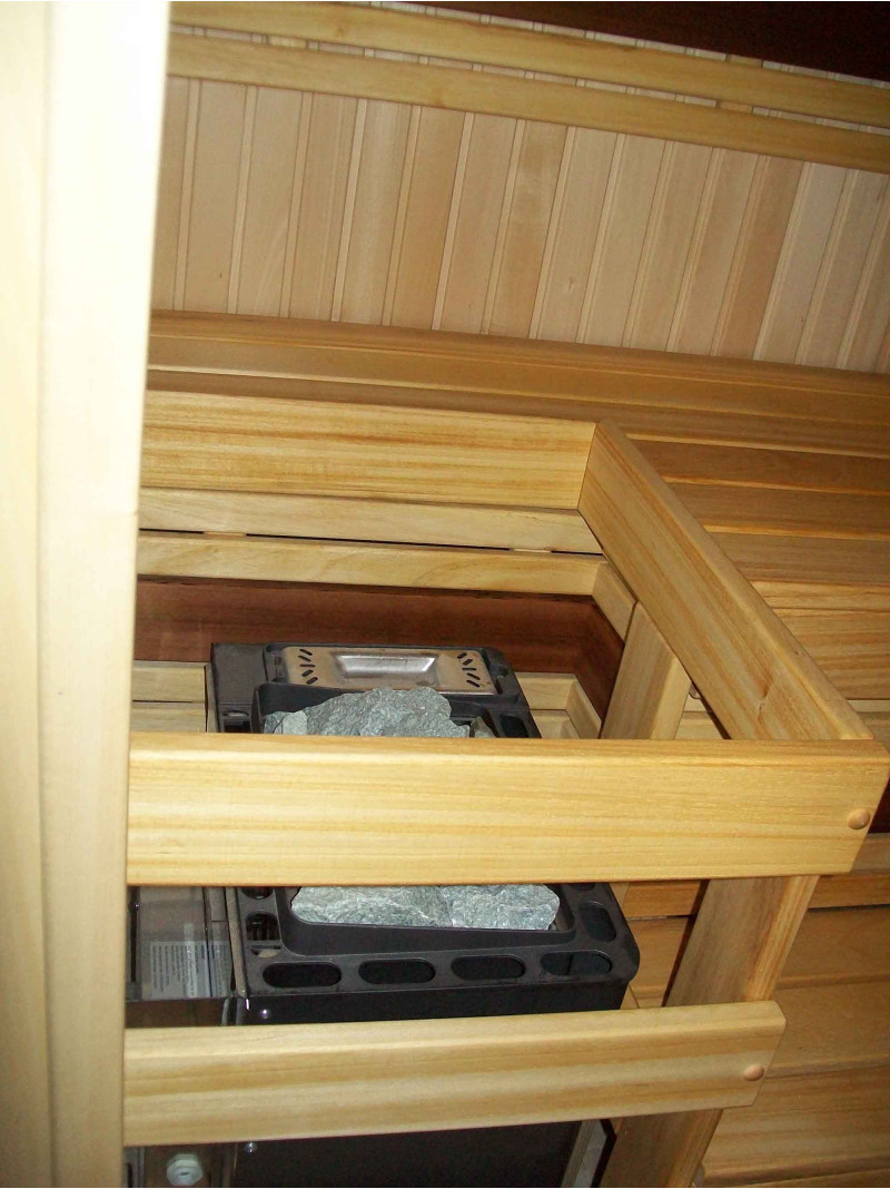 Źródłem ciepła jest elektryczny piec do sauny EOS Bi-O Thermat zawieszony na ścianie. Piec ten nadaje się do długotrwałego użytkowania w prywatnych saunach. Grzałka posiada parownik ze zintegrowaną miseczką zapachową. Panel sterowania Xenio Combi CX110C jest montowany oddzielnie poza sauną.