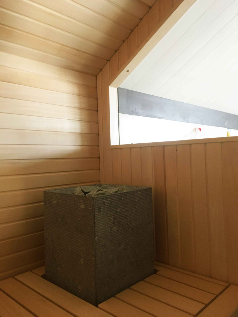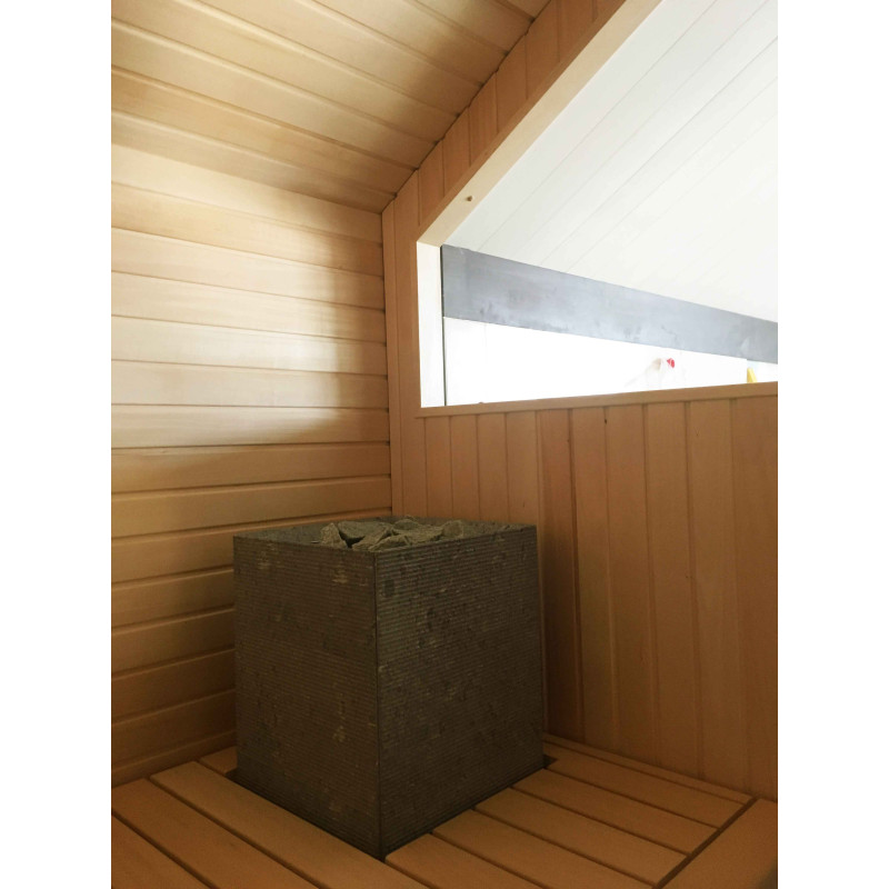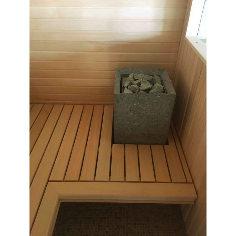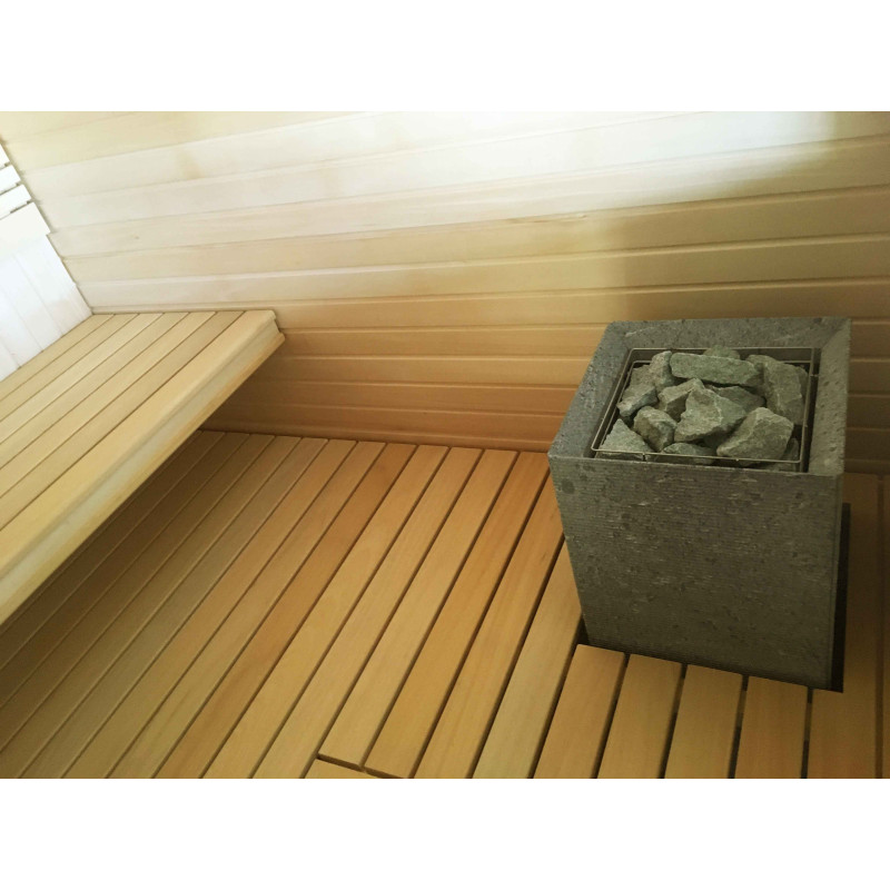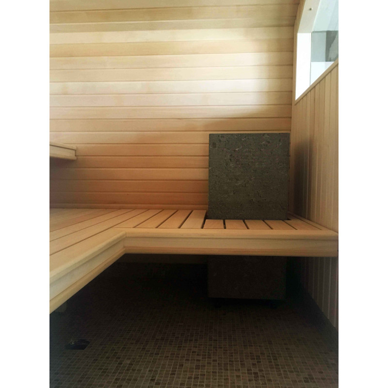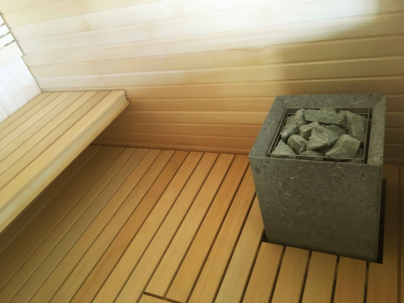 Ściany i sufity sauny wykonane są z drewna lipowego. Siding lipowy daje saunie więcej światła i wydziela przyjemny zapach drewna. Do wykonania ławek, oparć i ogrodzenia wokół pieca wybrano wysokiej jakości boazerię z drewna abachi. To miękkie i nieogrzewane drewno jest doskonałym wyborem na ławki, podpory tam, gdzie drewno dotyka skóry bez jej przypalania. Zapewnia to komfort i wspaniały wypoczynek w saunie. Ławki, podpory i ściany są lakierowane, w pełni przygotowane do wieloletniego użytkowania.