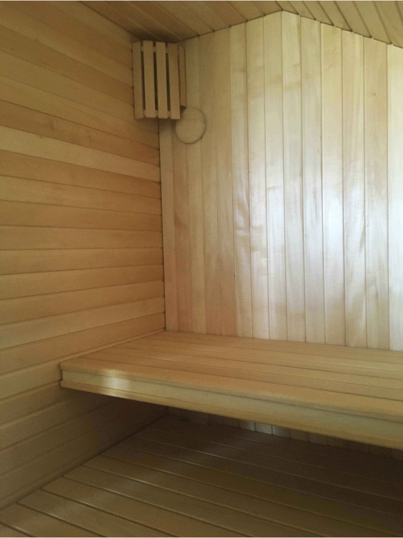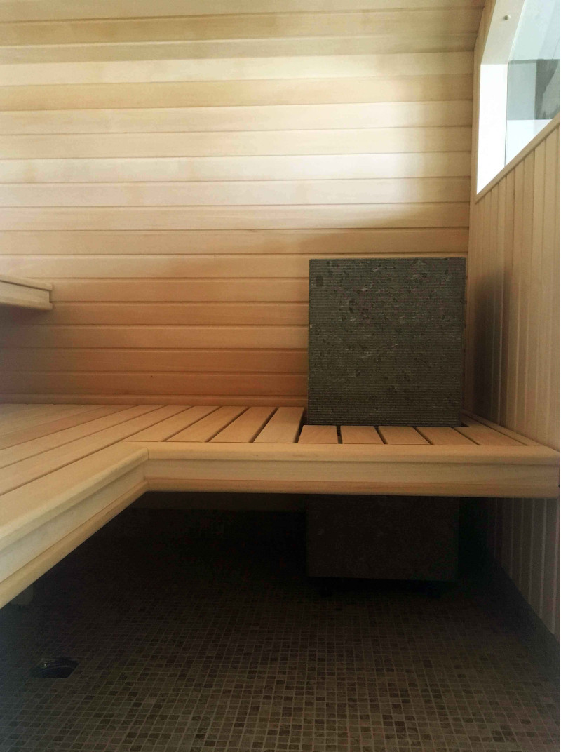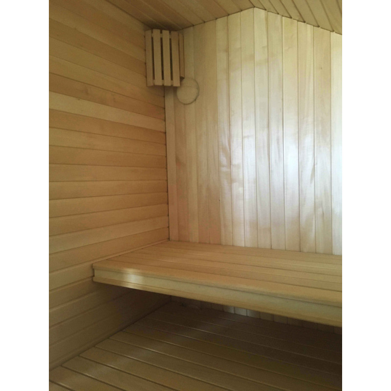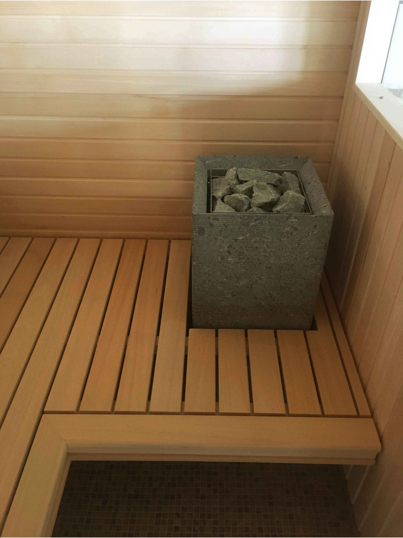 Ściany i sufity sauny wykonane są z drewna lipowego. Siding lipowy daje saunie więcej światła i wydziela przyjemny zapach drewna. Do wykonania ławek, oparć i ogrodzenia wokół pieca wybrano wysokiej jakości boazerię z drewna abachi. To miękkie i nieogrzewane drewno jest doskonałym wyborem na ławki, podpory tam, gdzie drewno dotyka skóry bez jej przypalania. Zapewnia to komfort i wspaniały wypoczynek w saunie. Ławki, podpory i ściany są lakierowane, w pełni przygotowane do wieloletniego użytkowania.