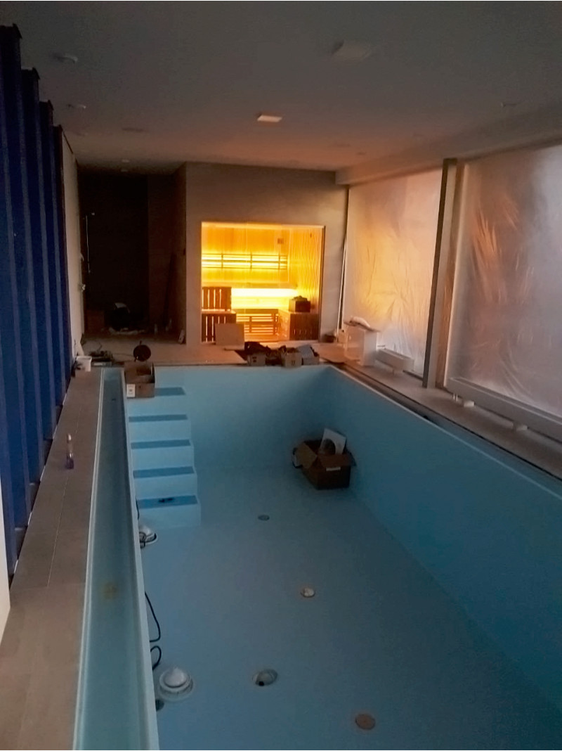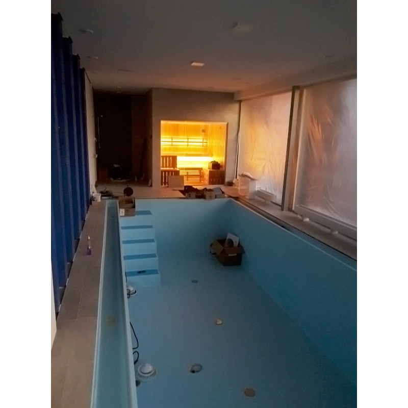 Montaż gablot szklanych - szyba hartowana przyciemniana 8 mm w ramie aluminiowej. Dzięki przeszklonej gablocie otwiera się widok na strefę basenową, powiększa się niewielka sauna, a sauna zyskuje więcej światła.
